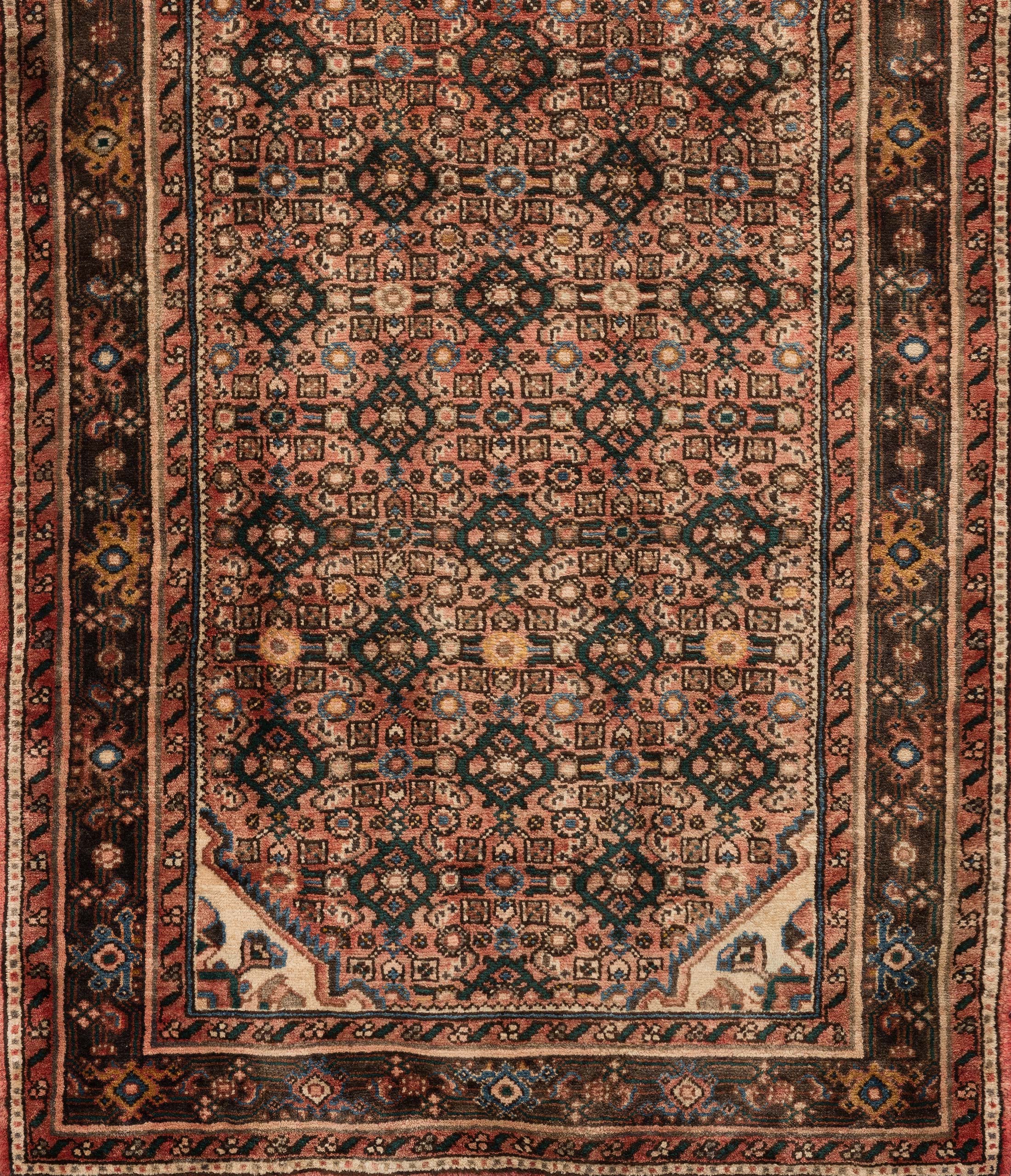 Das Muster des Hossenabad-Teppichs ähnelt dem berühmten Herati-Muster. Häufig tritt ein faszinierendes rhombenförmiges Medaillon auf, das das durchgehende Design unterbricht. Dieses Medaillon wird jedoch durch kunstvolle Eckzwickel harmonisch ausgeglichen. Das tiefrote Farbschema des Teppichfeldes verleiht ihm eine eindrucksvolle Ausstrahlung und einen Hauch von Eleganz.