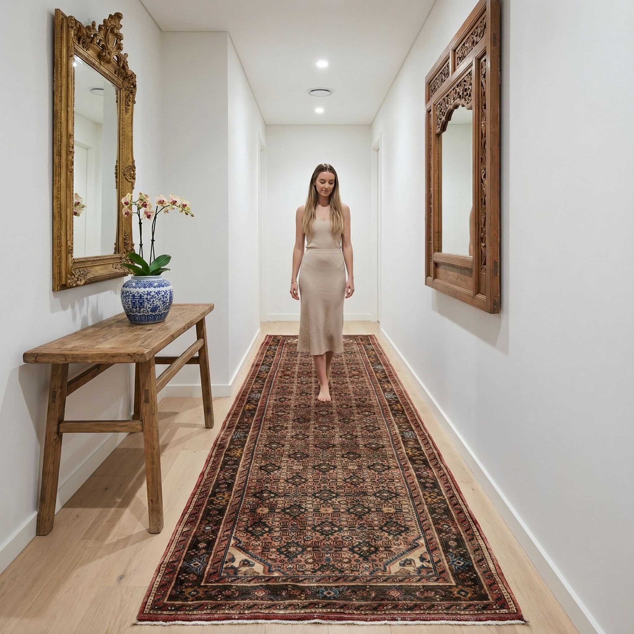 Obwohl der skandinavische Stil oft für Minimalismus und helle Farben bekannt ist, wird ein solcher Teppich gerne als gezielter Stilbruch eingesetzt, um dem Raum Wärme und "Hygge" zu verleihen. Die satten Farben des Hamedan-Läufers bilden einen spannenden Kontrast zu weißen Dielenböden und schlichten Designermöbeln, wodurch der Raum weniger steril wirkt. Die geometrische Klarheit des Musters spricht die nordische Vorliebe für Struktur an, während die Vintage-Patina für die nötige Individualität sorgt. So wird der Teppich zum zentralen Ankerpunkt im Flur oder Wohnbereich, der die nordische Kühle mit orientalischer Geborgenheit ausbalanciert.