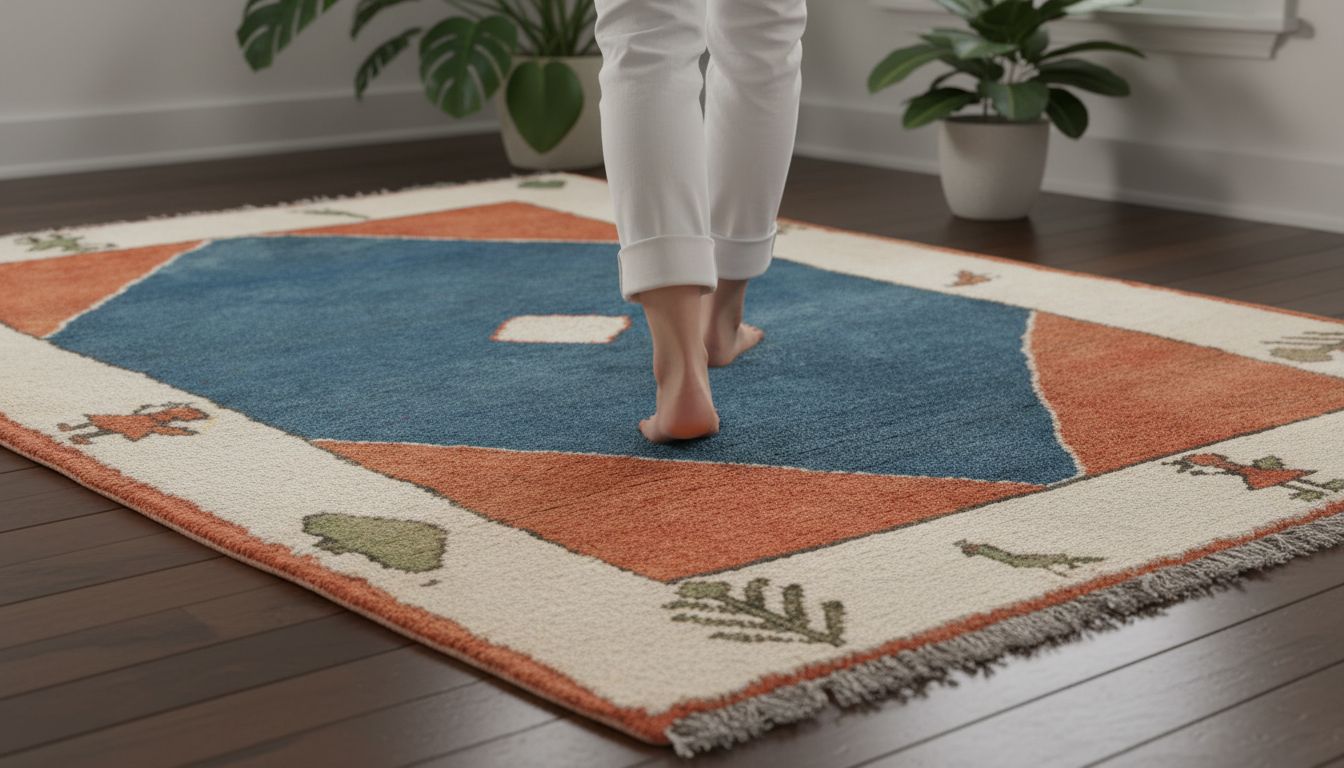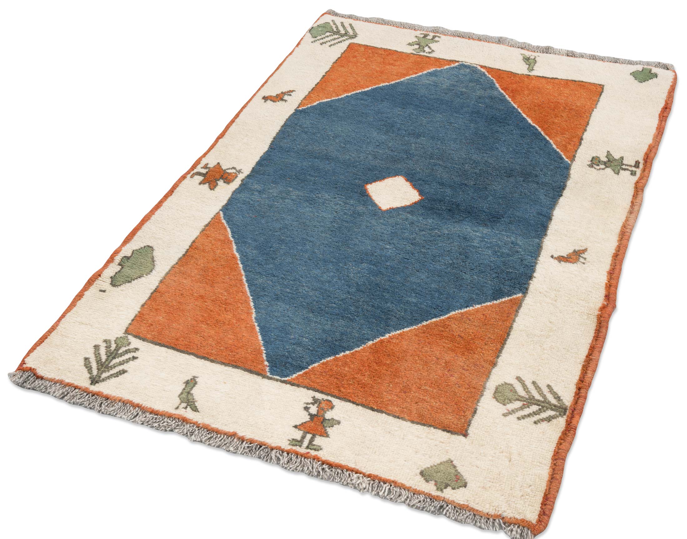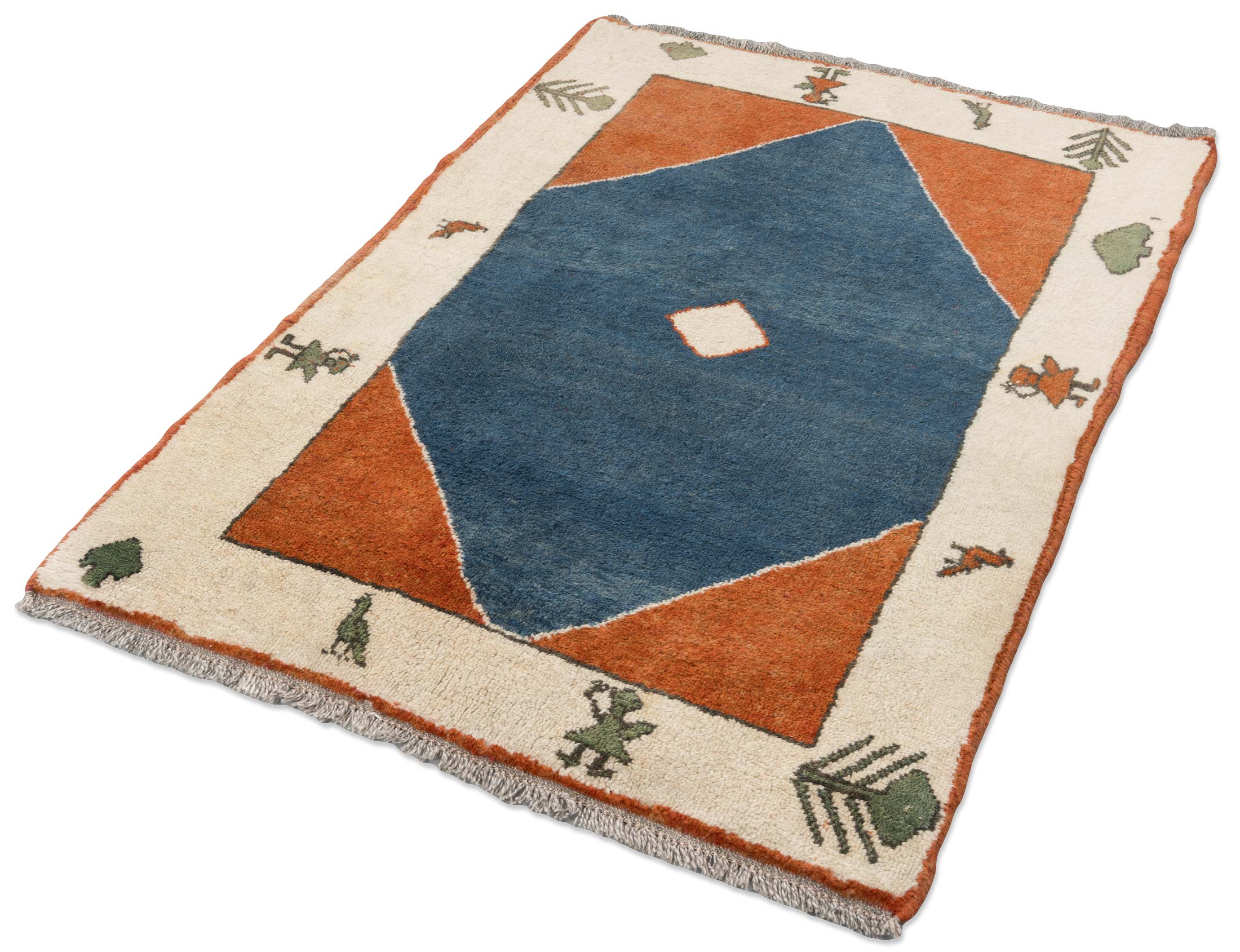 Dieser handgeknüpfte persische Gabbeh-Teppich besticht durch seine tiefblaue Hauptfarbe, die eine beruhigende und zugleich majestätische Wirkung entfaltet. In harmonischem Kontrast dazu stehen die warmen Rosttöne, die dem Teppich eine lebendige und erdige Ausstrahlung verleihen. Der Rand des Teppichs ist in einem sanften Beige gehalten, was die kräftigen Farben des Mittelteils elegant einrahmt. Zusätzlich setzen dezente grüne Akzente verspielte Akzente, die das Gesamtbild abrunden.Das ...