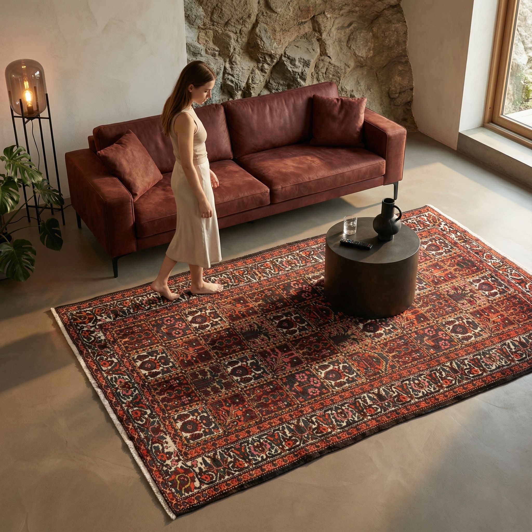 In einem Industrial-Ambiente, das oft von kühlen Materialien wie Beton, Stahl und offenem Mauerwerk dominiert wird, wirkt dieser Teppich als notwendiger Wärmespender. Die tiefe Farbgebung und die strapazierfähige Qualität der alten Schafwolle bilden einen spannenden Kontrast zur „rohen“ Fabrik-Ästhetik und machen den Raum wohnlich. Das geometrische Raster des Gartenmusters greift die klare Linienführung des Industrial-Styles auf, während die Vintage-Patina dem Raum Seele verleiht. Gerade die unregelmäßige Kontur passt gut zum „Unperfekten“ und Derben, das diesen Loft-Look auszeichnet.