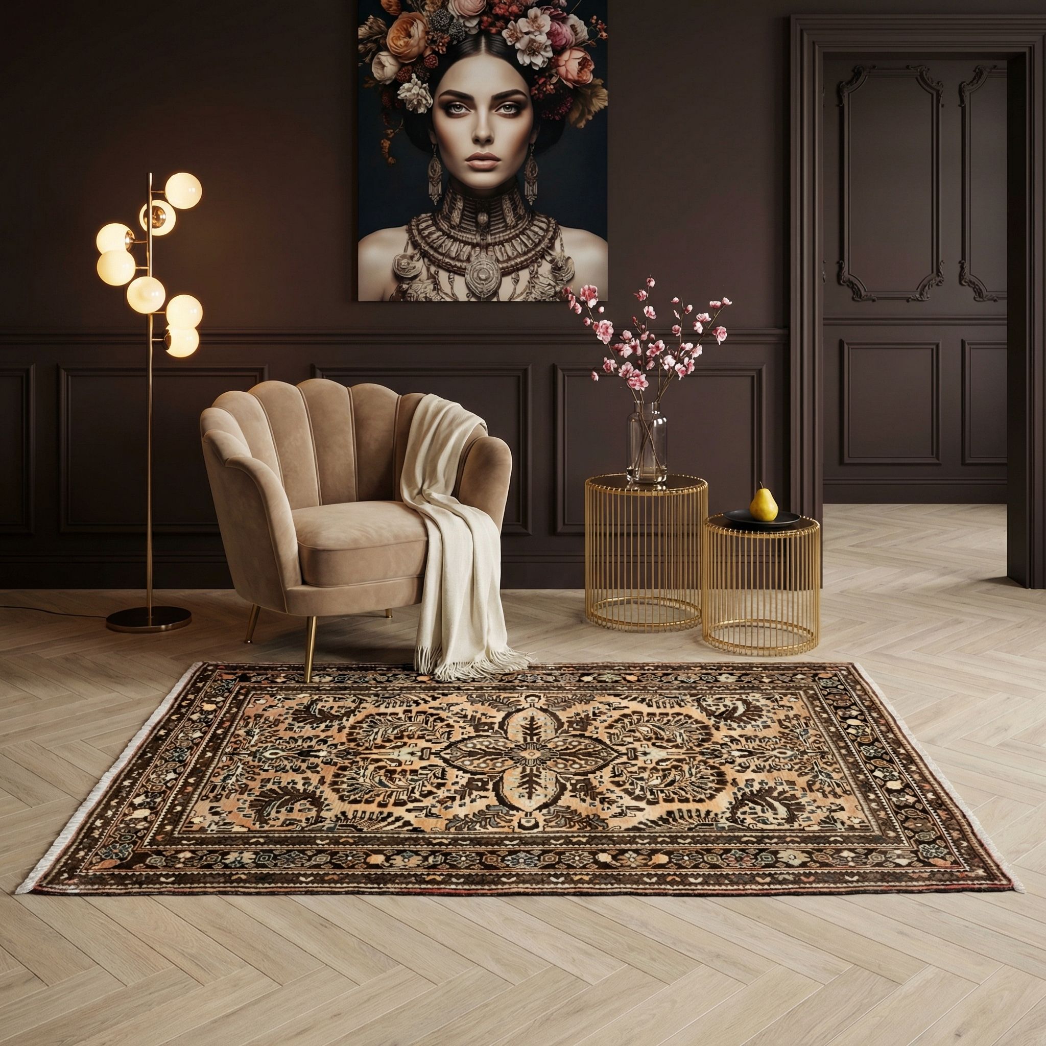 In einem kühlen Industrial-Ambiente aus Beton, Stahl und unverputzten Wänden sorgt dieser Teppich für den dringend benötigten Wärme-Kontrast. Seine erdigen Apricot- und Brauntöne brechen die Strenge des Fabrik-Chics auf und machen den Raum wohnlich, ohne dabei kitschig zu wirken. Besonders gut lässt er sich zu einem cognacfarbenen Ledersofa oder schweren Metallmöbeln kombinieren, da er eine Brücke zwischen Härte und Gemütlichkeit schlägt. Das Alter von über 70 Jahren passt zudem hervorragend zum rauen, unperfekten Charme alter Industriegebäude ("Shabby Chic").