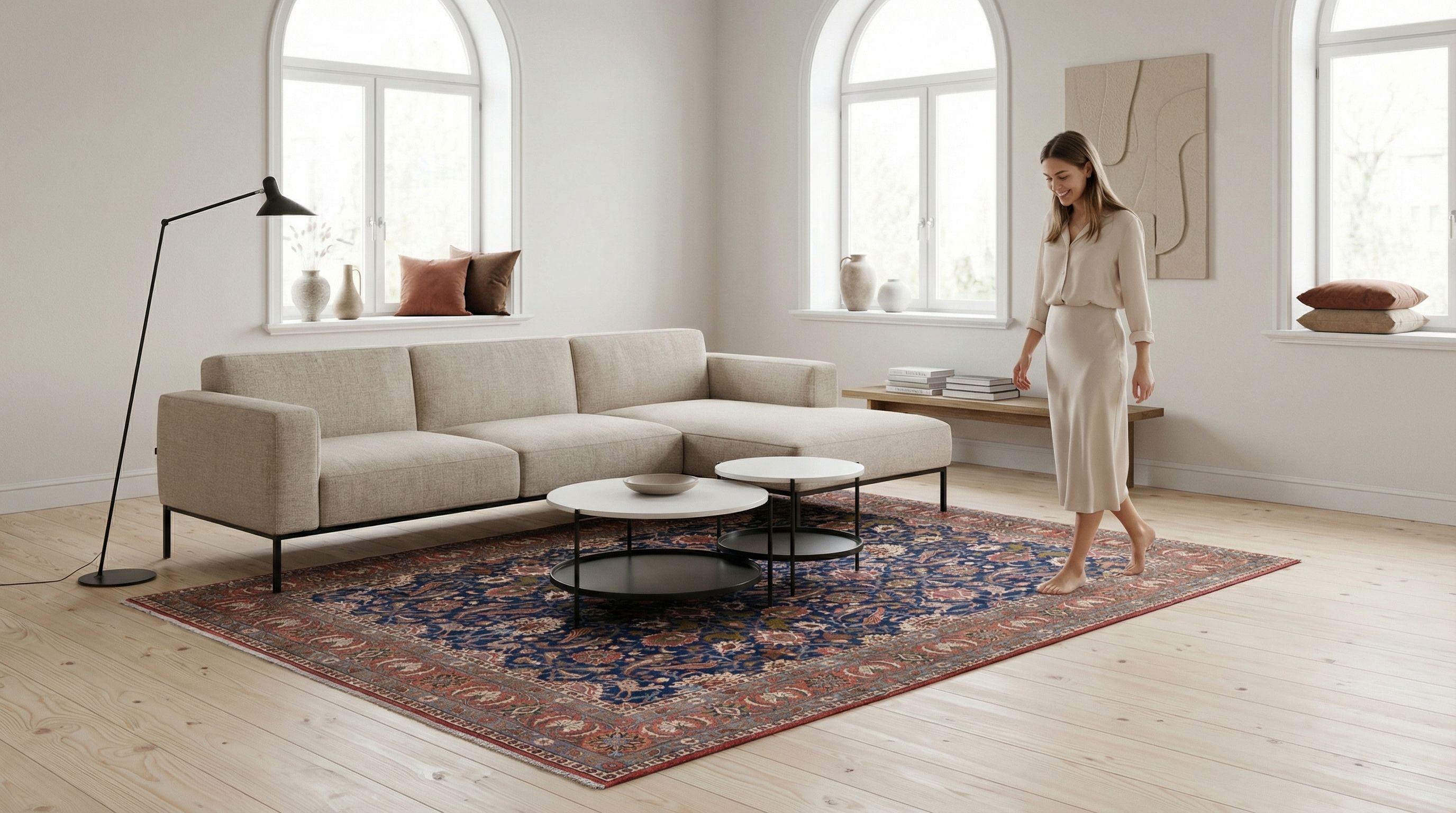 Hier setzen wir diesen hochfeinen Teppich ganz bewusst als spektakulären Stilbruch ein, um die kühle Strenge von Beton, Stahl und unverputztem Mauerwerk mit wohnlicher Wärme zu durchbrechen. Die filigrane Knüpfung von ca. 350.000 Knoten pro Quadratmeter steht in einem spannenden Dialog zur rohen Ästhetik des Industrie-Designs und zeugt von einer Spitzenqualität, die den Loft-Charakter veredelt. Das tiefe Indigoblau und die komplexen Muster bilden einen weichen, fast poetischen Gegenpol zu kantigen Ledersofas und Metallregalen. Dieser Teppich fungiert als Insel der Kultur und Behaglichkeit, die dem weiten, offenen Raum Struktur und Seele verleiht.