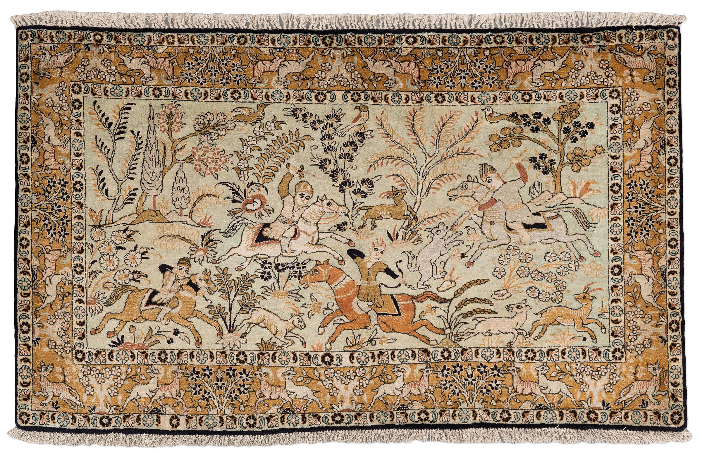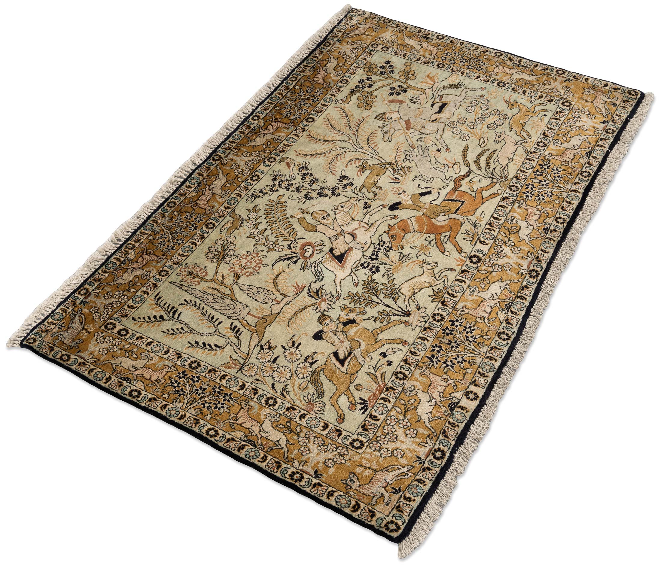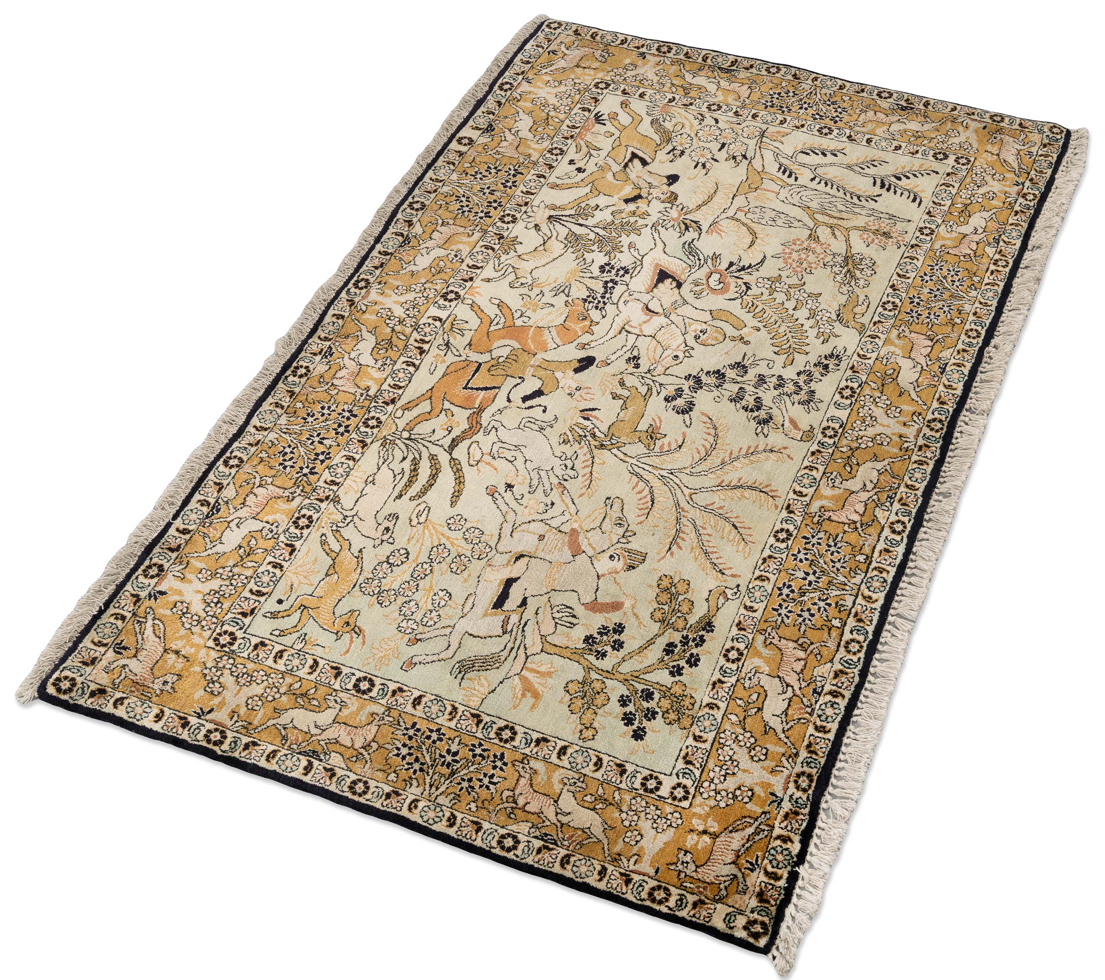 Dieser exquisite handgeknüpfte Ghom-Teppich aus Persien, gefertigt aus reiner Naturseide, präsentiert ein faszinierendes Jagdmotiv auf einem elfenbeinfarbenen Hintergrund. Die Hauptfarbe des Teppichs ist ein sanftes Elfenbein, das von warmen Gold- und Beigetönen sowie einem tiefen Schwarz begleitet wird. Zusätzlich verleihen dezente Akzente in zartem Grün dem Design eine harmonische Balance.