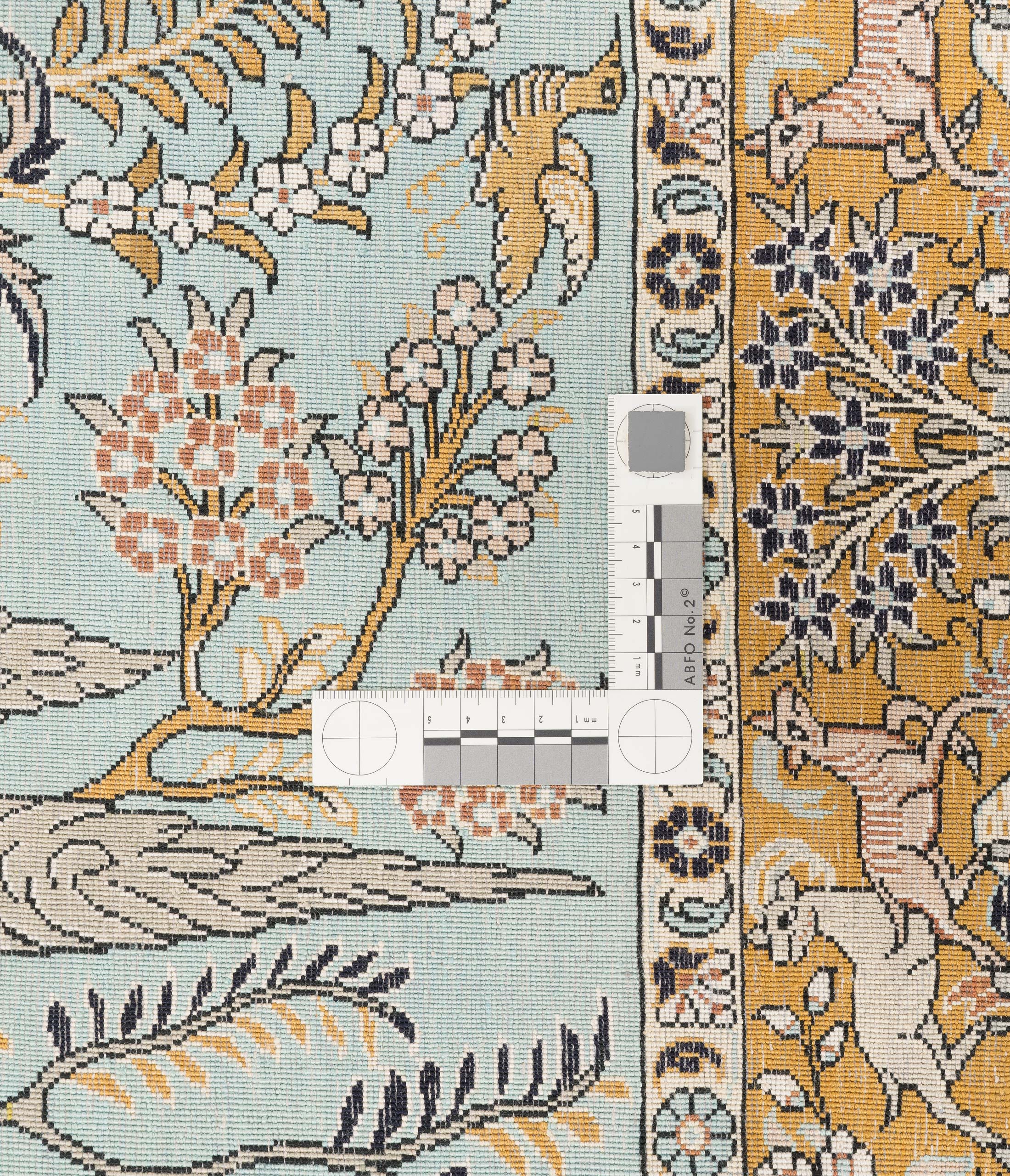 Mit einer beeindruckenden Knotenzahl von etwa 640.000 Knoten pro Quadratmeter zeigt dieser Teppich eine bemerkenswerte Präzision und Detailverliebtheit. Die Musterung ist reich an floralen und tierischen Motiven, die dynamisch und kunstvoll ineinanderfließen. Die Vorderseite des Teppichs besticht durch einen Antiklook, während die Rückseite ohne Antikfinish etwas lebhafter in den Farben erscheint.