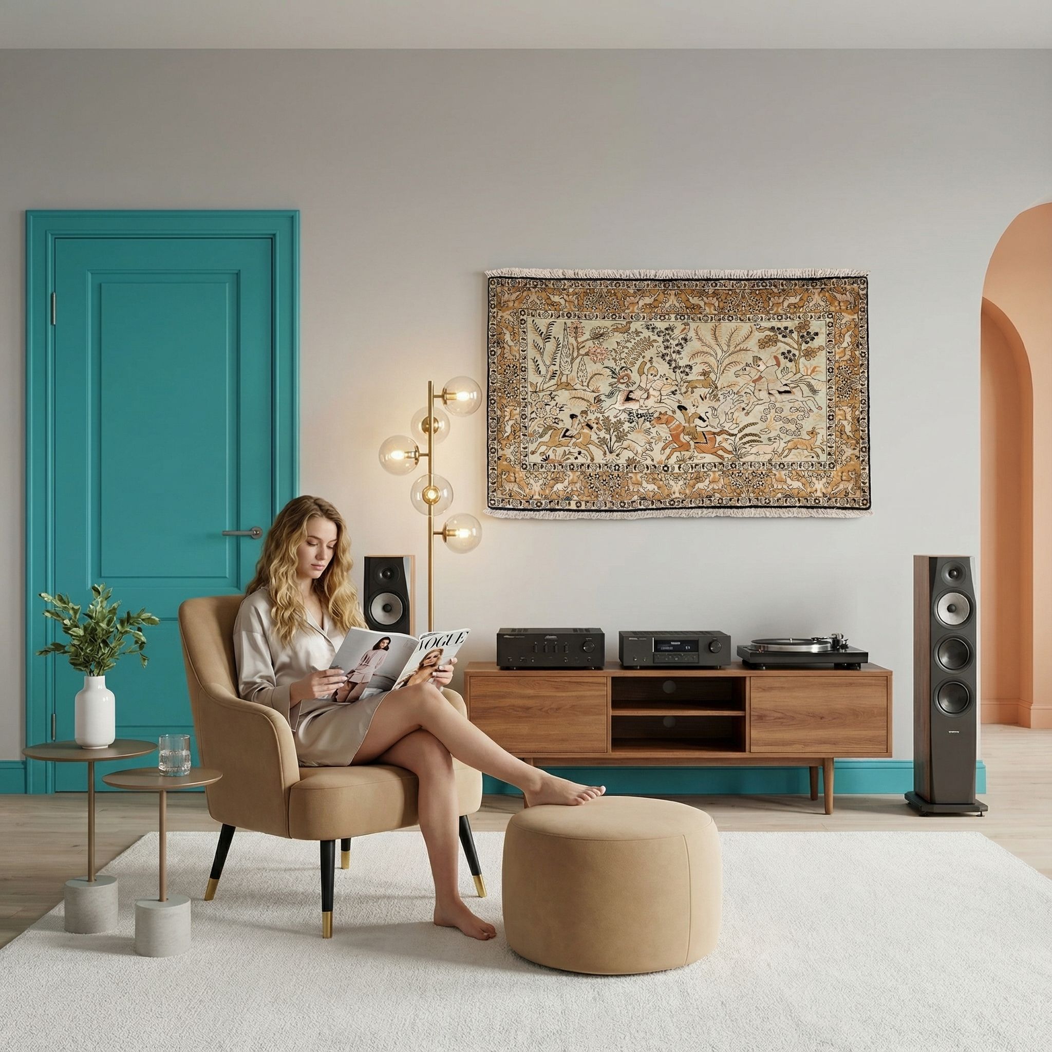 Da der Glam-Style auf Opulenz und luxuriöse Materialien setzt, ist dieser Teppich aus reiner Naturseide mit seinem edlen Glanz die perfekte Wahl für dieses Ambiente. Die extrem feine Knüpfung von ca. 640.000 Knoten pro Quadratmeter zeugt von höchster Exklusivität, die in einem eleganten Interieur mit Samtmöbeln und Goldakzenten bestens zur Geltung kommt. Das klassische, fast gemäldeartige Motiv verleiht dem Raum eine aristokratische Note, ohne durch zu grelle Farben die Eleganz zu stören, da die Antikveredelung die Töne sanft dämpft. Er wirkt auf dem Boden weniger wie ein Gebrauchsgegenstand, sondern vielmehr wie ein kostbares Kunstwerk, das den glamourösen Anspruch der Einrichtung unterstreicht.