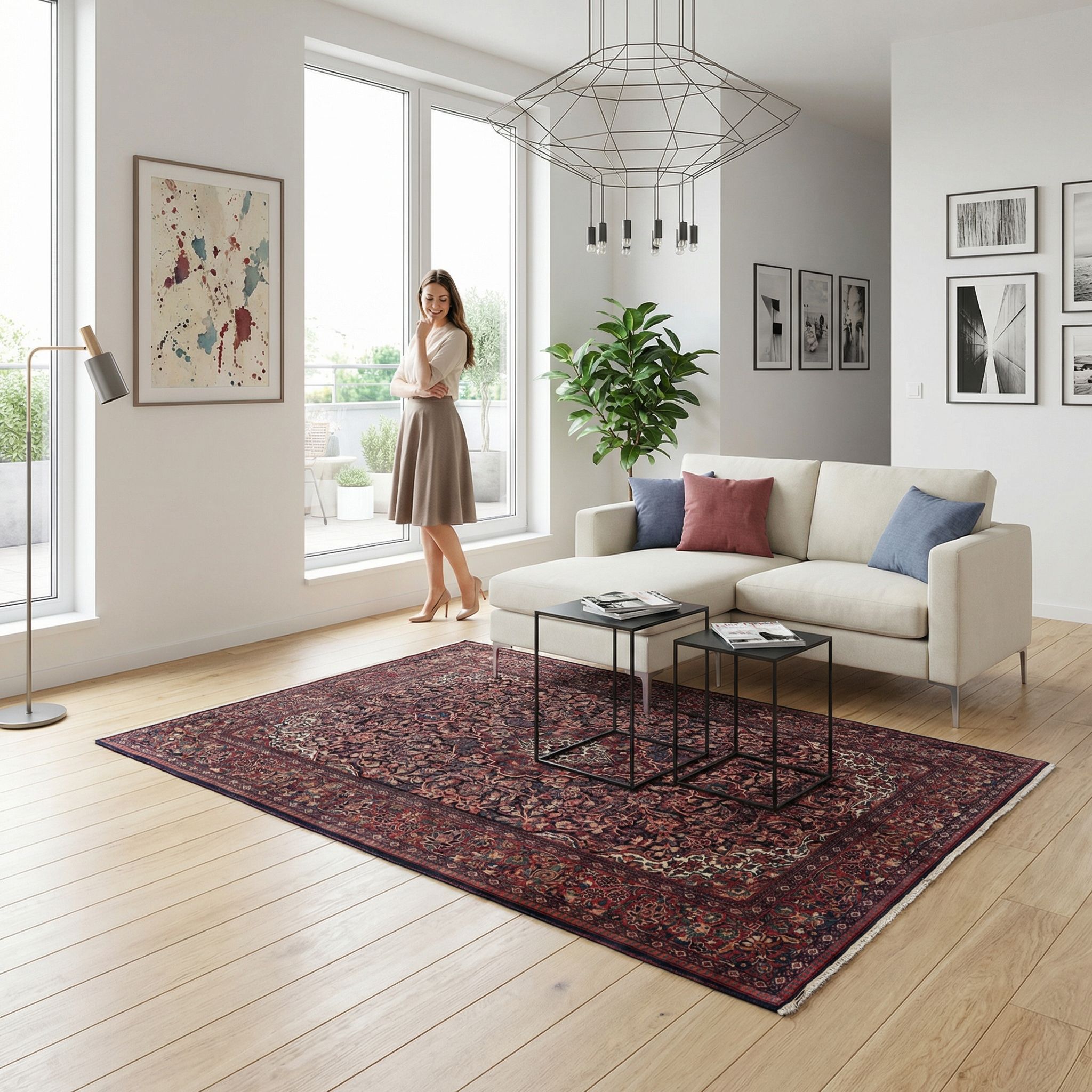 Dieser edle Teppich bildet einen spannenden Kontrast zu den rauen, kühlen Materialien wie Beton, Stahl und unverputztem Mauerwerk, die den Industrial-Style prägen. Durch seine tiefen Rottöne und die weiche Textur bringt er die nötige Wohnlichkeit und Wärme in ein sonst eher funktional und karg wirkendes Loft-Ambiente. Der bewusste Stilbruch zwischen dem antiken, floralen Design und modernen Industriemöbeln erzeugt eine dramatische und stilvolle Spannung im Raum. Zudem unterstreicht die robuste Langlebigkeit und Qualität des Teppichs den Anspruch an beständige und werthaltige Einrichtungselemente in diesem Stil.