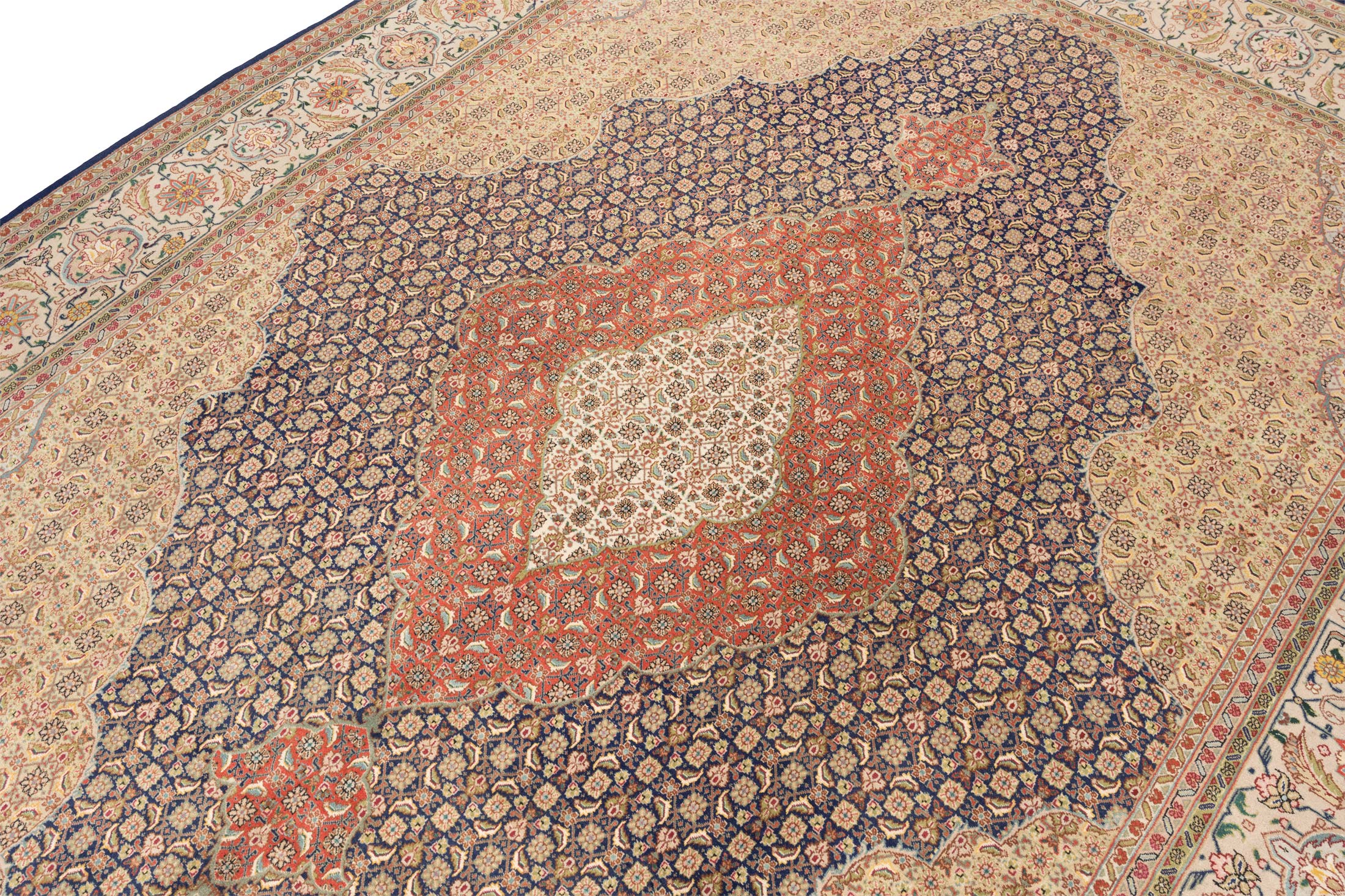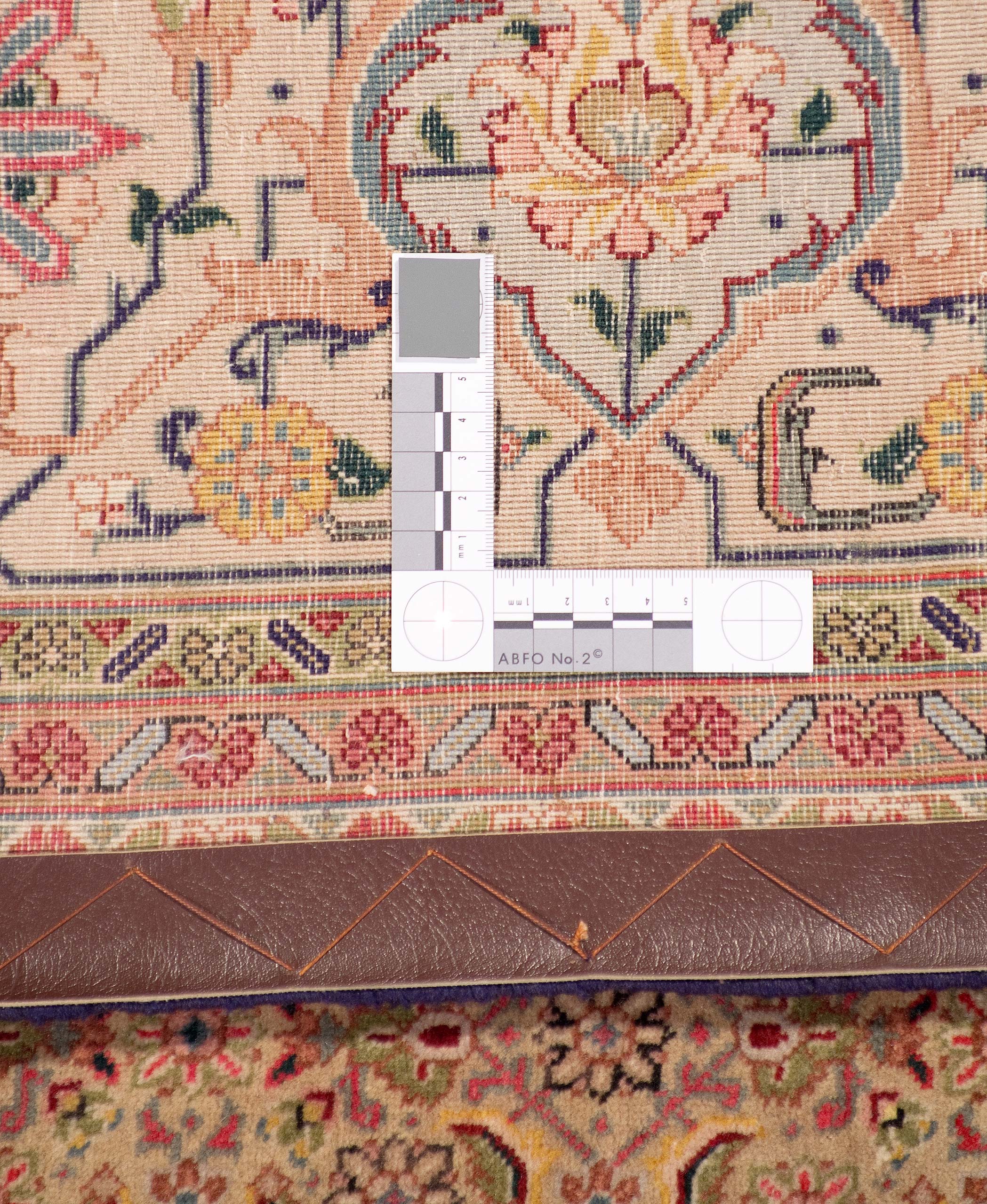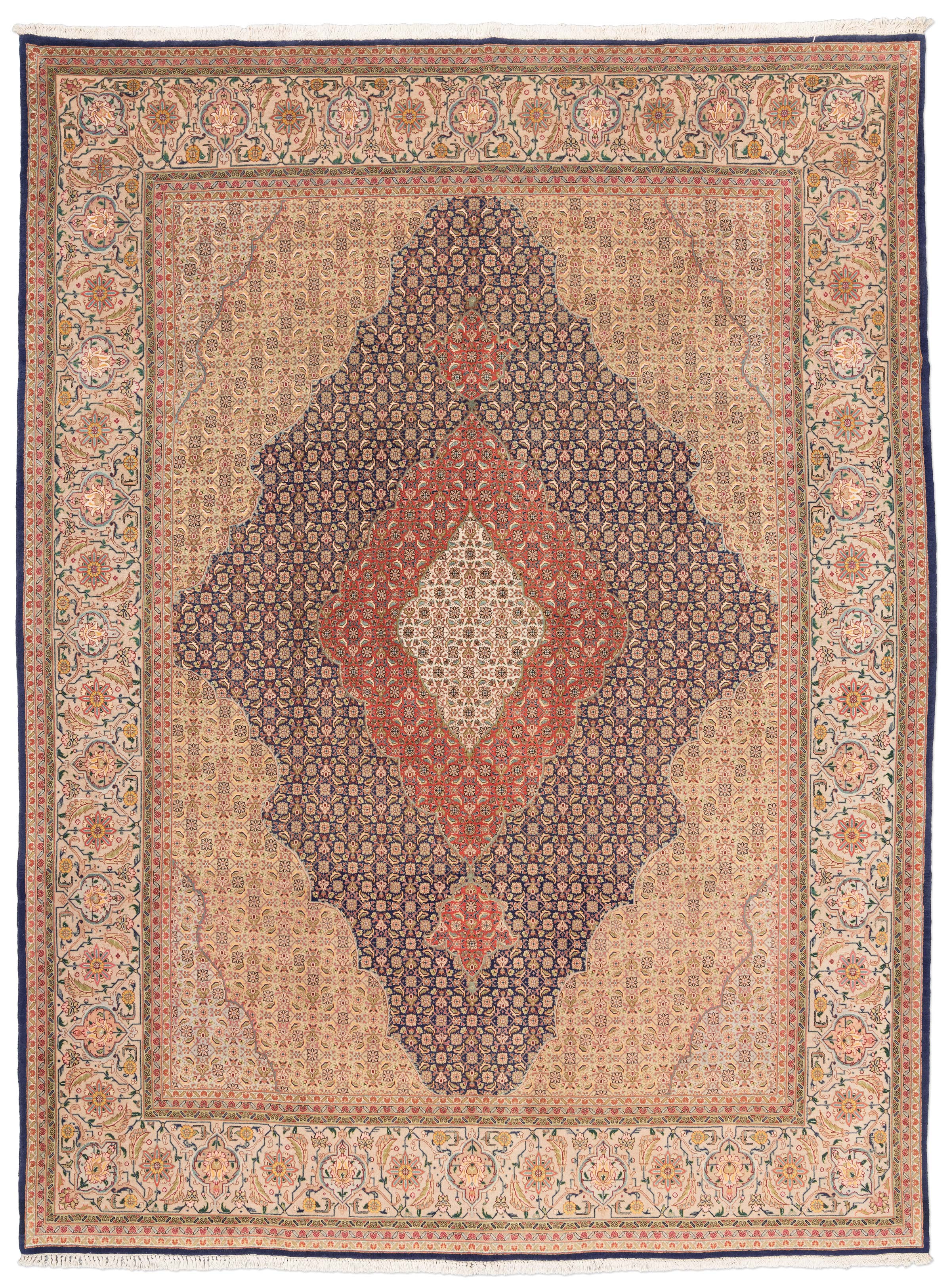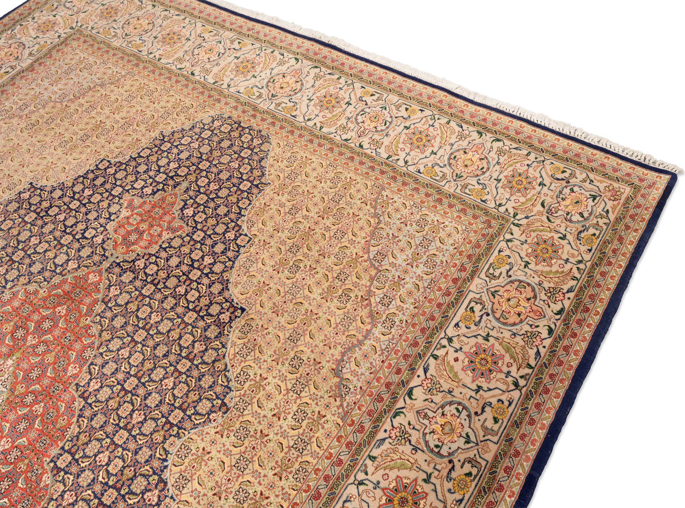 Dieser exquisite Täbriz-Teppich aus Persien präsentiert sich in einer harmonischen Farbpalette. Die Hauptfarbe ist ein tiefes Blau, das durch warme Rosttöne und elfenbeinfarbene Akzente ergänzt wird. Das Design beeindruckt durch dicht gefüllte florale Muster und große Palmetten, die dem Teppich eine lebendige und elegante Ausstrahlung verleihen. Mit einer hochfeinen Knüpfung von ca. 470.000 Knoten pro Quadratmeter zeugt dieser Teppich von außergewöhnlicher Handwerkskunst. Hergestellt ...mehr Beschreibung