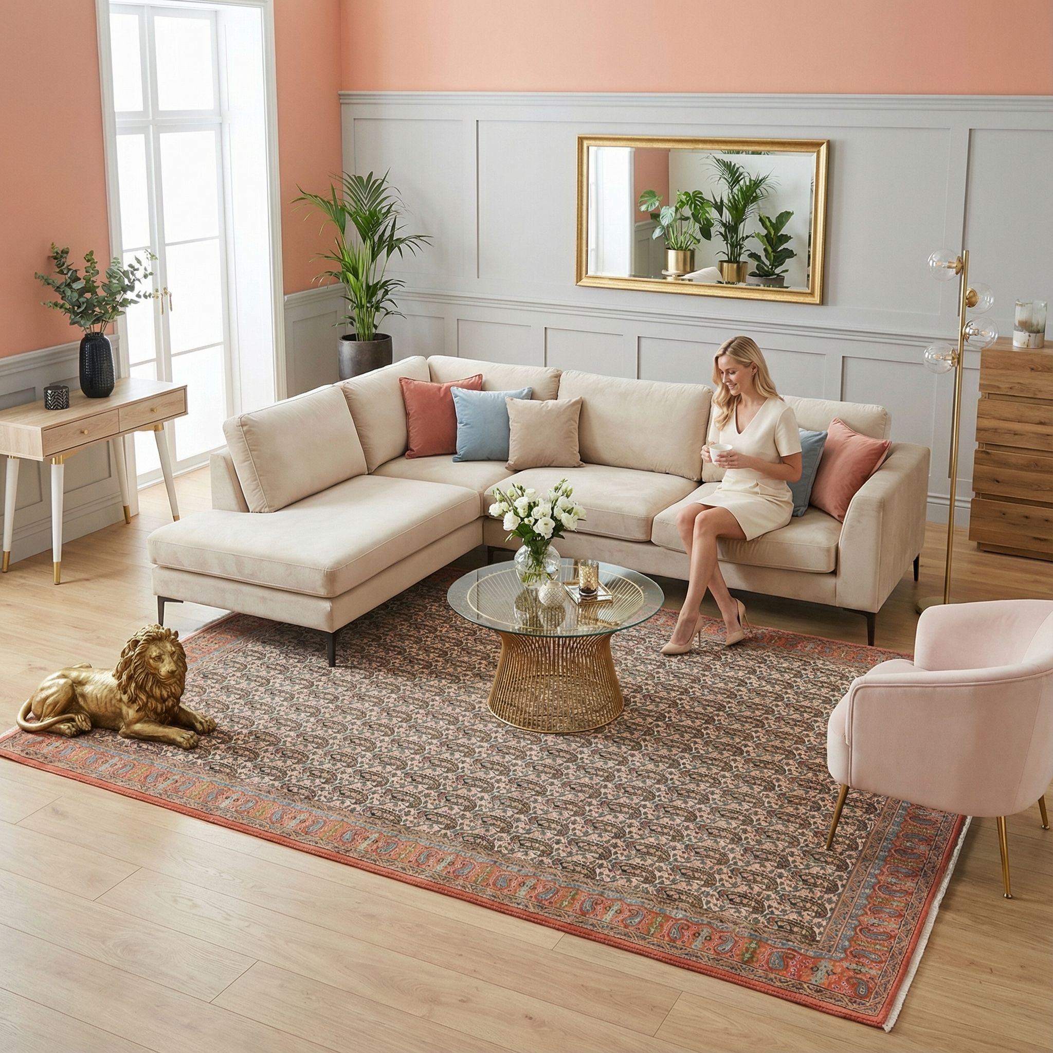 Dieser Teppich ergänzt den New-Country-Style hervorragend, da er Wärme und ländliche Eleganz ausstrahlt, ohne dabei altbacken zu wirken. Die sehr feine Knüpfung und der perfekte Erhaltungszustand passen gut zu den hochwertigen, oft hellen Holzmöbeln und natürlichen Stoffen wie Leinen, die diesen Stil prägen. Das kleinteilige, blumig anmutende Muster bricht große, schlichte Flächen sanft auf und sorgt sofort für eine behagliche Wohnatmosphäre. Gerade die sanften Rottöne setzen einen gemütlichen Farbakzent, der den modernen Landhausstil lebendig und einladend macht.