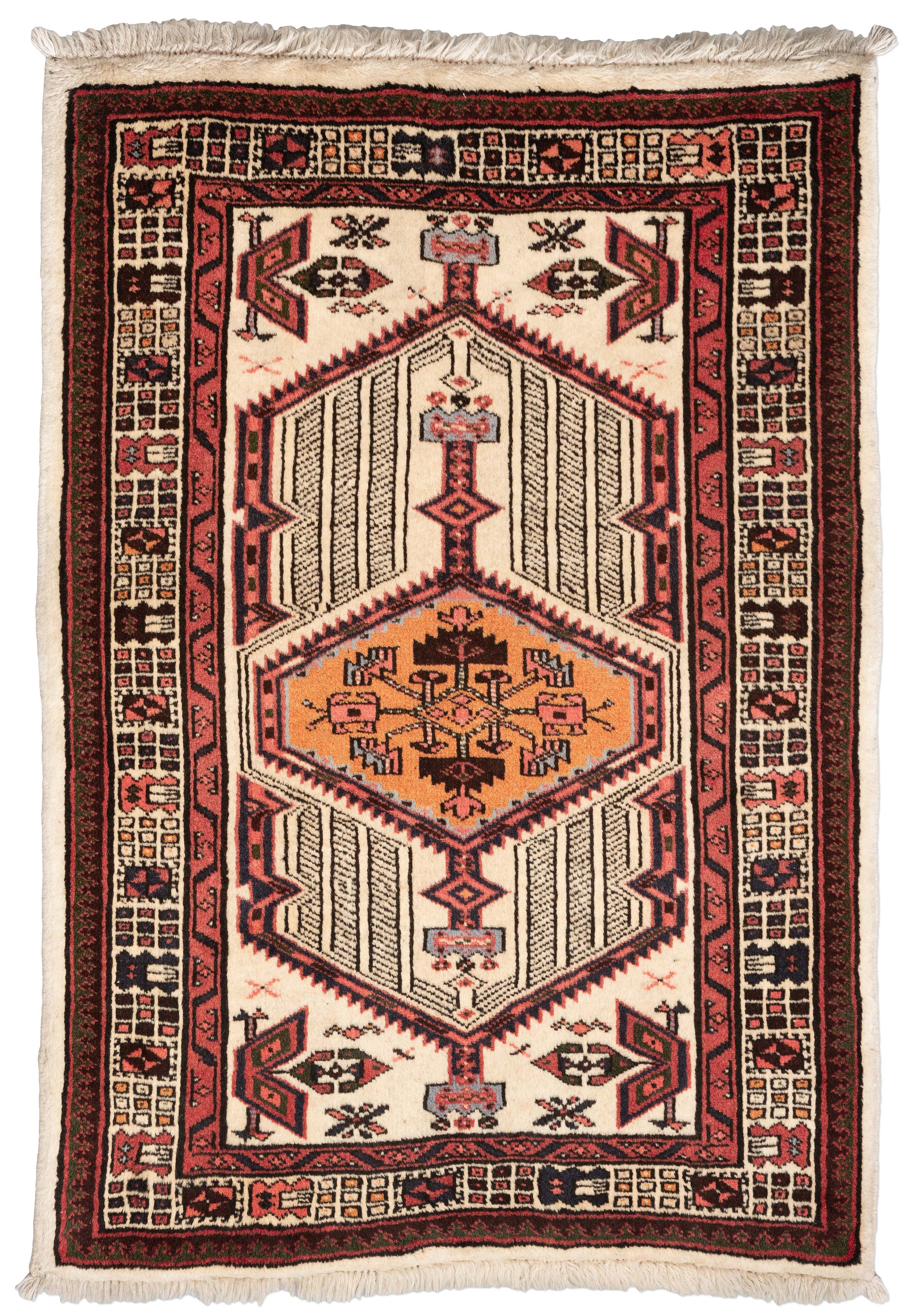 Dieser handgeknüpfte Serab-Teppich aus Persien präsentiert sich in einem warmen Cremeweiß als Hauptfarbe, das die Basis für die kunstvolle Musterung bildet. Ergänzt wird es durch ein kräftiges Ziegelrot, das dem Teppich eine lebendige Ausstrahlung verleiht. Ein sattes Schwarz unterstreicht die geometrischen Muster und sorgt für Tiefe, während ein leuchtendes Ockergelb als Akzentfarbe das zentrale Hexagon hervorhebt.Die kunstvolle Musterung des Teppichs ist geprägt von ...