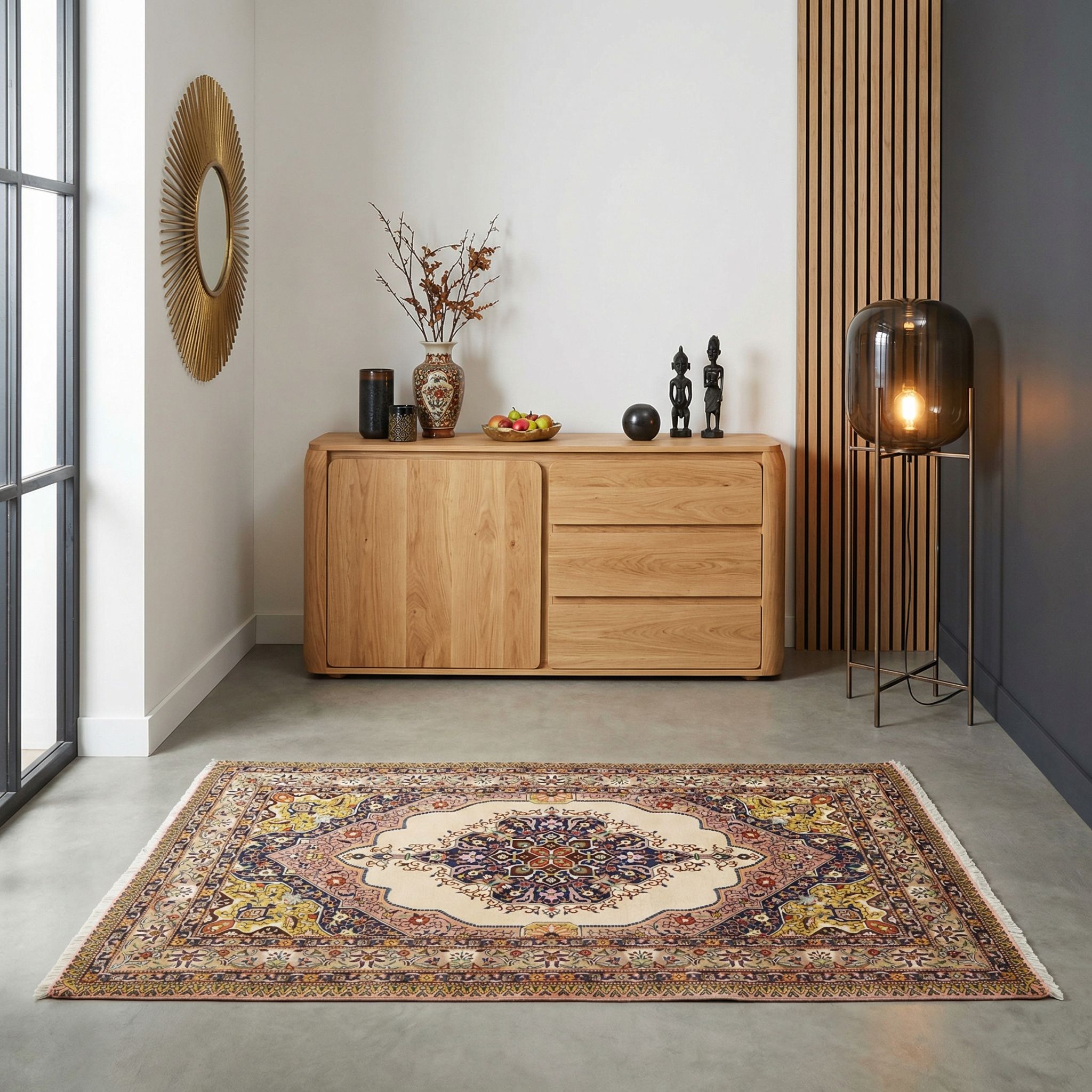 In einem Loft mit unverputzten Wänden, Stahlträgern oder Betonböden setzt dieser feine Orientteppich einen wirkungsvollen Kontrapunkt zur rauen Ästhetik des Industrial-Styles. Die filigranen Muster und die weiche Haptik der Korkwolle brechen die Kühle und Härte der Umgebung auf und schaffen wohnliche Inseln im offenen Raum. Gerade die Kombination aus einem so traditionsreichen, fast aristokratischen Stück aus Täbriz und dem unperfekten Fabrik-Charme erzeugt eine einzigartige visuelle Spannung. Dieser Teppich beweist hier als Stilbruch, dass Schönheit und Feinheit auch in einer maskulinen, groben Umgebung bestehen können und diese erst richtig zur Geltung bringen.