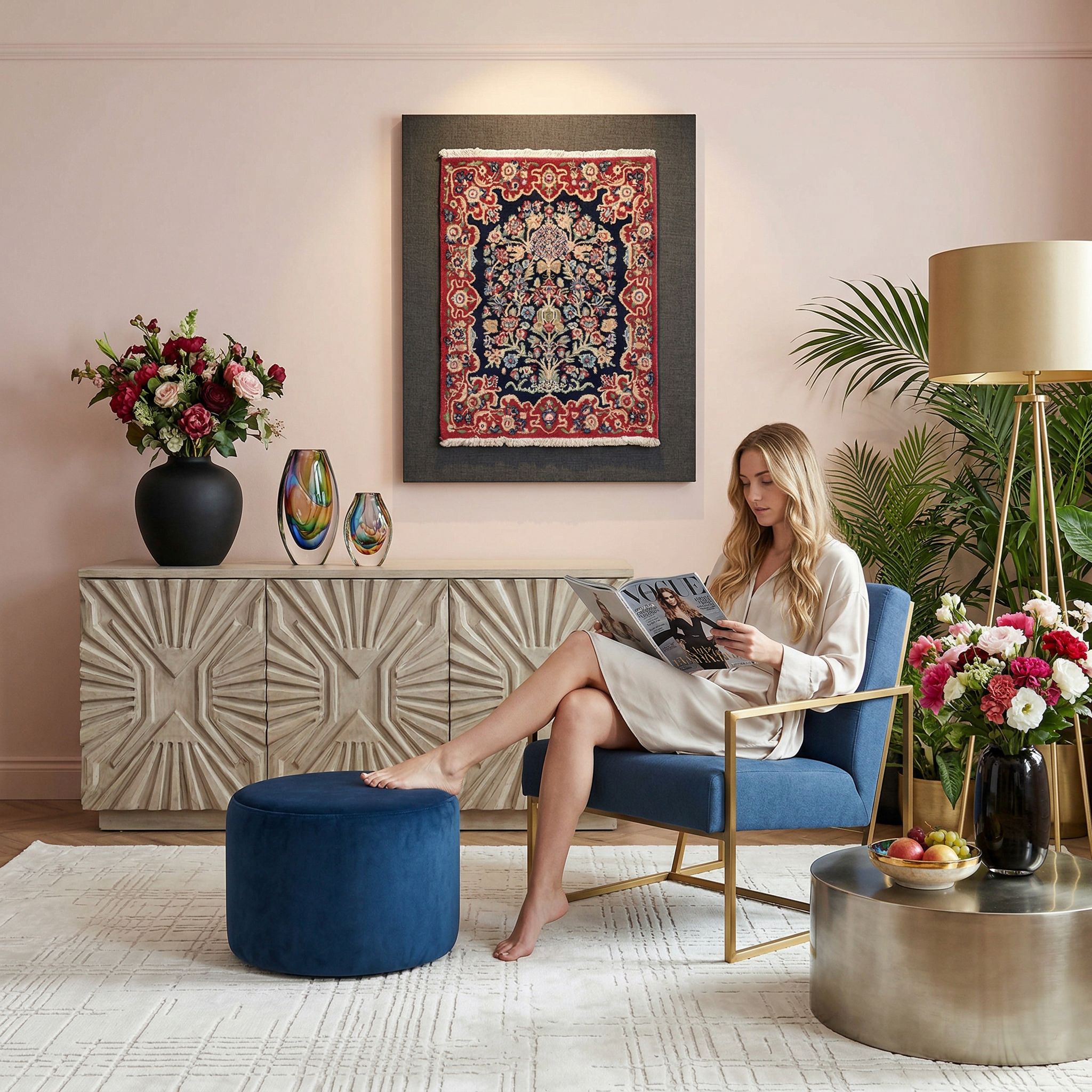 Der Glam-Style lebt von Opulenz und sichtbarem Luxus, weshalb ein signierter Teppich mit einer so feinen Knüpfung und perfektem Erhaltungszustand hier genau richtig ist. Die majestätische Farbkombination aus tiefem Blau und Rot strahlt eine dramatische Eleganz aus, die hervorragend zu Samtmöbeln und Goldakzenten passt. Der Detailreichtum der 300.000 Knoten pro Quadratmeter signalisiert Hochwertigkeit und Exklusivität, was für diesen extravaganten Look zentral ist. Dieser Teppich verleiht dem Raum eine historisch gewachsene Grandezza.