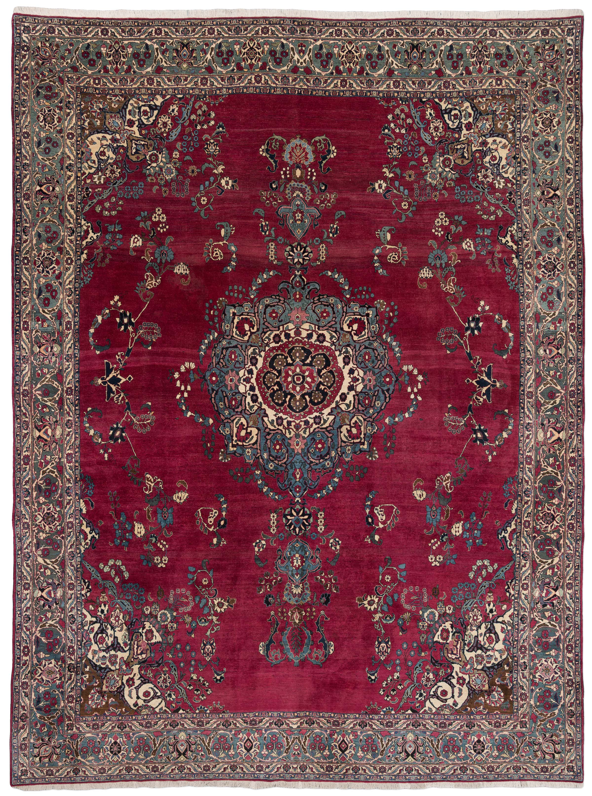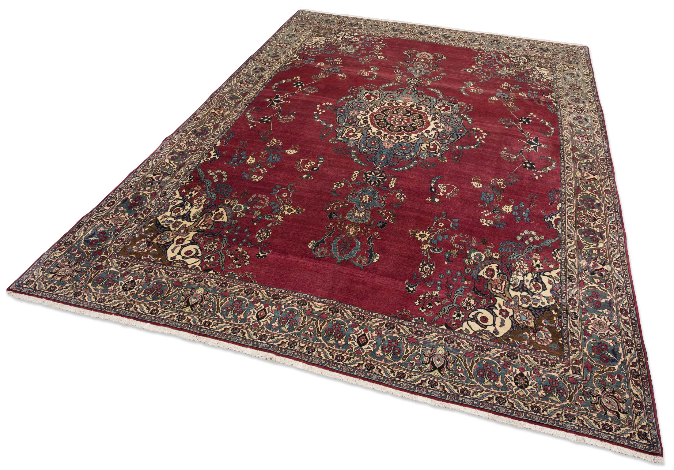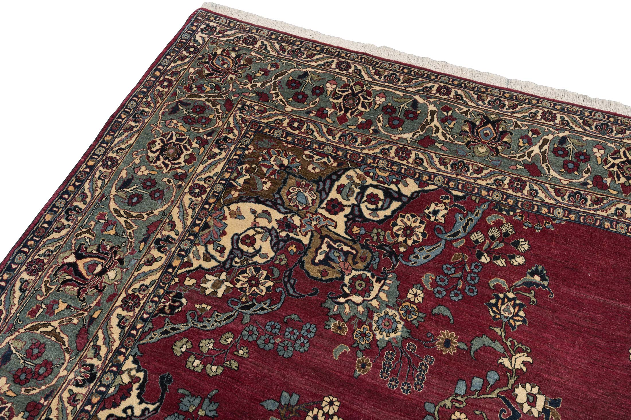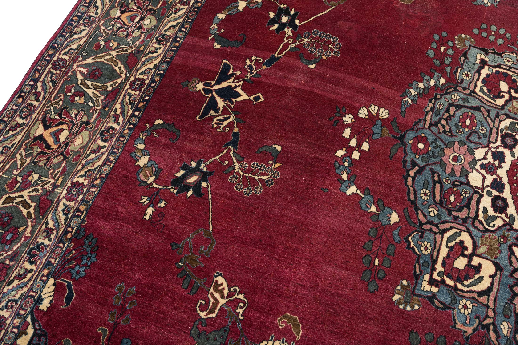 Dieser antike Nain-Teppich aus Persien, um 1900 gefertigt, präsentiert sich in einem prächtigen, tiefen Rot als Hauptfarbe, das dem Raum eine warme Eleganz verleiht. Begleitet wird dieses Rot von einem harmonischen Zusammenspiel aus Elfenbein, Blau und Türkisblau, die die kunstvolle Musterung unterstreichen. Die detaillierten Medaillons und floralen Verzierungen offenbaren die meisterhafte Knüpfkunst mit einer beeindruckenden Dichte von ca. 400.000 Knoten pro Quadratmeter. ...mehr Beschreibung