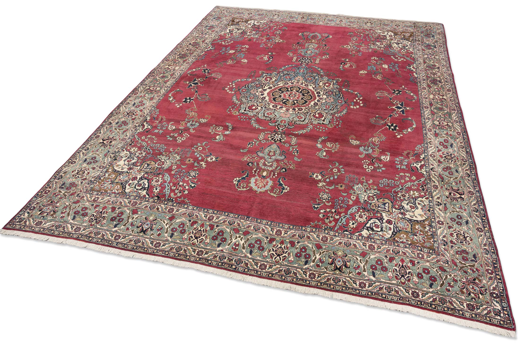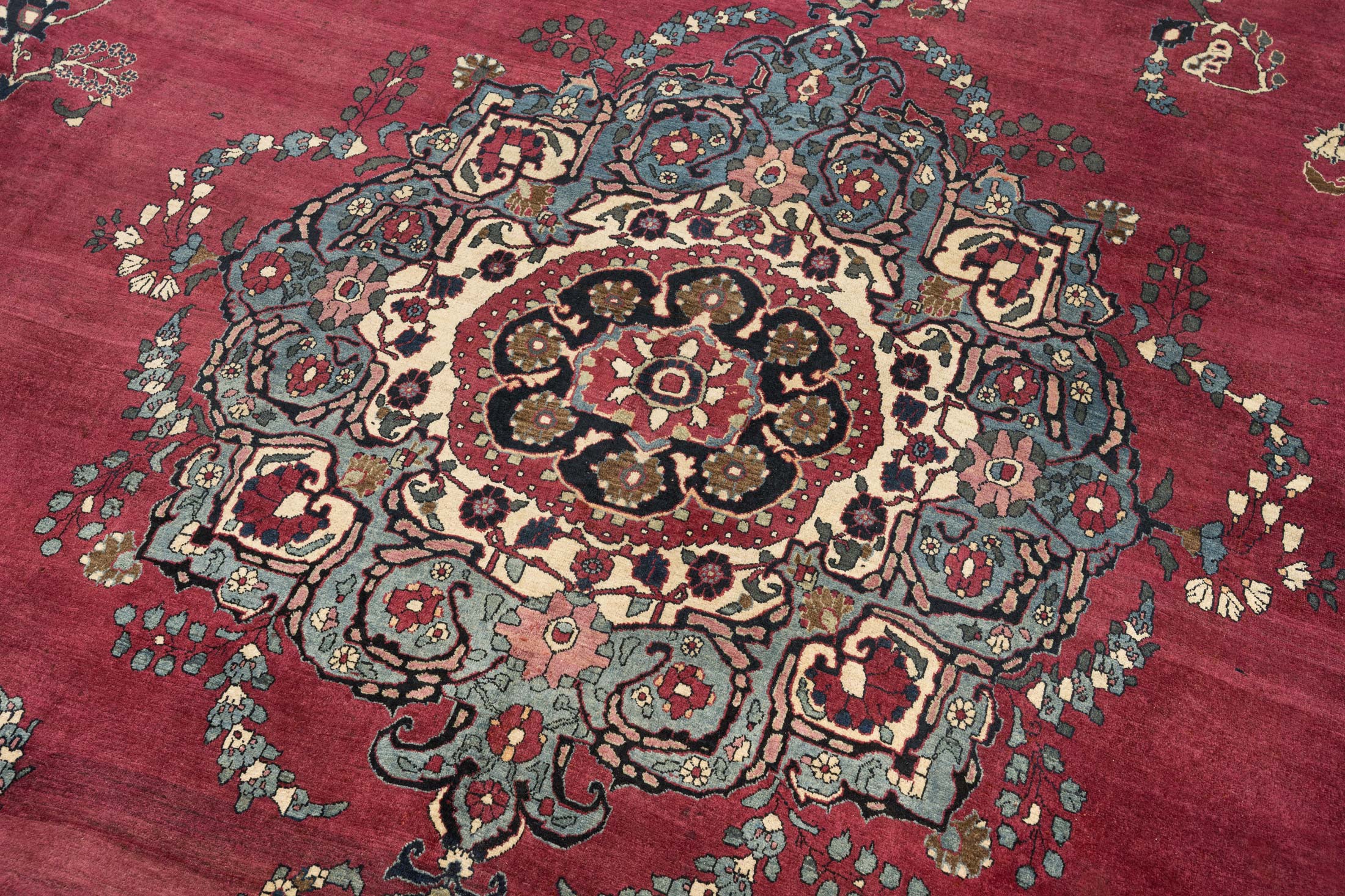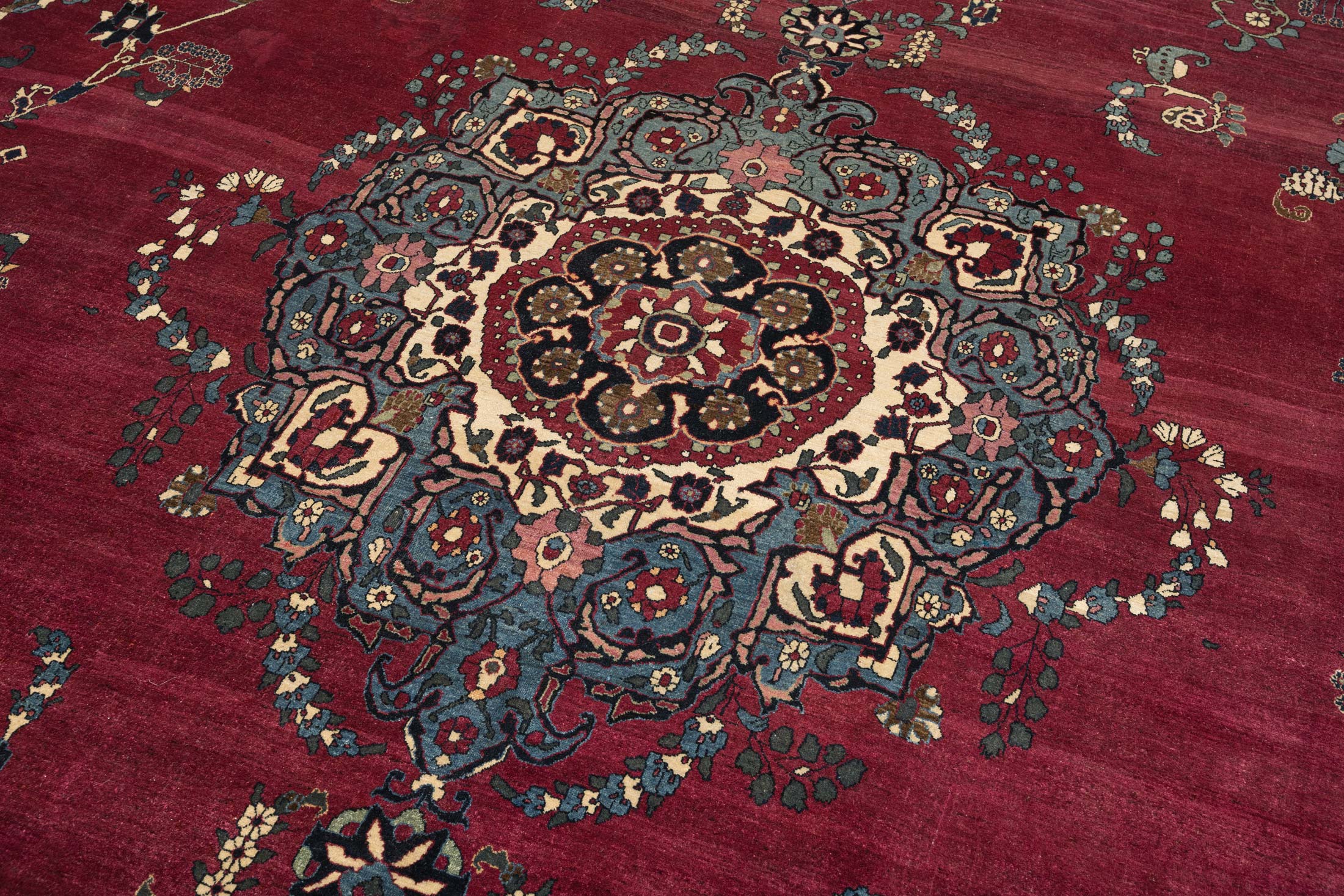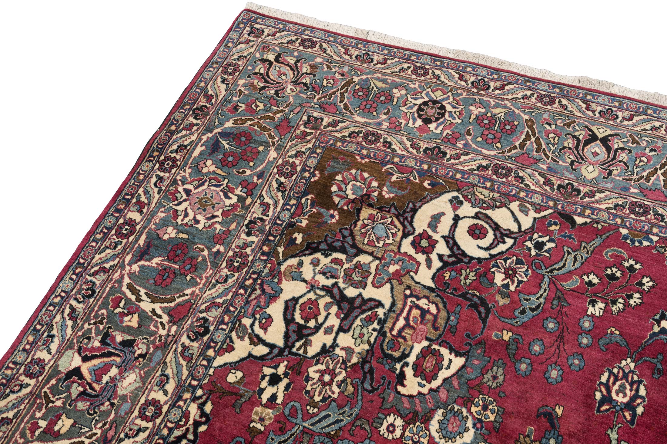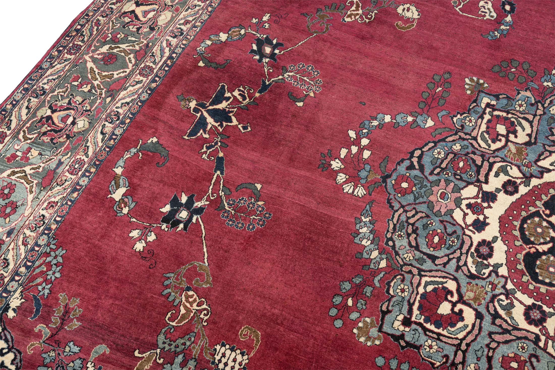 Dieser antike Nain-Teppich aus Persien, um 1900 gefertigt, präsentiert sich in einem prächtigen, tiefen Rot als Hauptfarbe, das dem Raum eine warme Eleganz verleiht. Begleitet wird dieses Rot von einem harmonischen Zusammenspiel aus Elfenbein, Blau und Türkisblau, die die kunstvolle Musterung unterstreichen. Die detaillierten Medaillons und floralen Verzierungen offenbaren die meisterhafte Knüpfkunst mit einer beeindruckenden Dichte von ca. 400.000 Knoten pro Quadratmeter. ...mehr Beschreibung