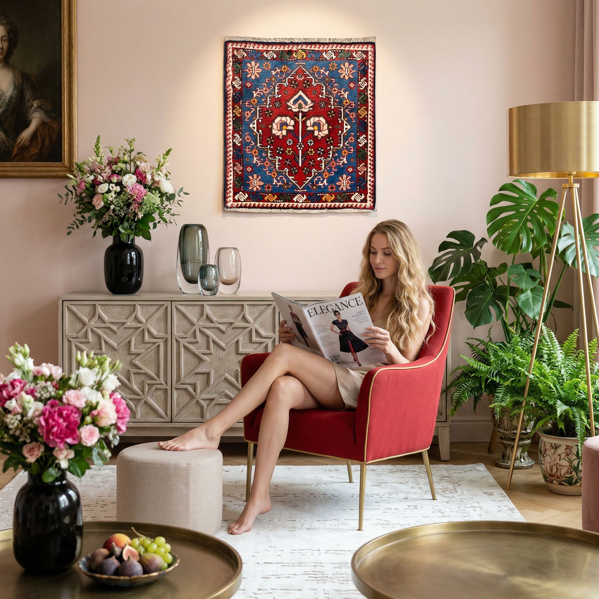 Der Boho-Look lebt von einem kreativen, unkonventionellen Mix aus Farben, Mustern und kulturellen Einflüssen, weshalb dieser farbenfrohe Teppich hier perfekt hineinpasst. Die kräftigen Rot- und Blautöne harmonieren wunderbar mit Rattanmöbeln, vielen Pflanzen und textilen Accessoires wie Kissen mit Fransen oder Makramee. Durch die traditionelle Knüpfkunst bringt der Teppich jene authentische, weltgewandte Note mit, die für den entspannten Bohème-Charme essenziell ist. Er wirkt nicht streng, sondern unterstreicht die gemütliche, lebendige und „zusammengewürfelte“ Atmosphäre dieses Wohnstils ideal.