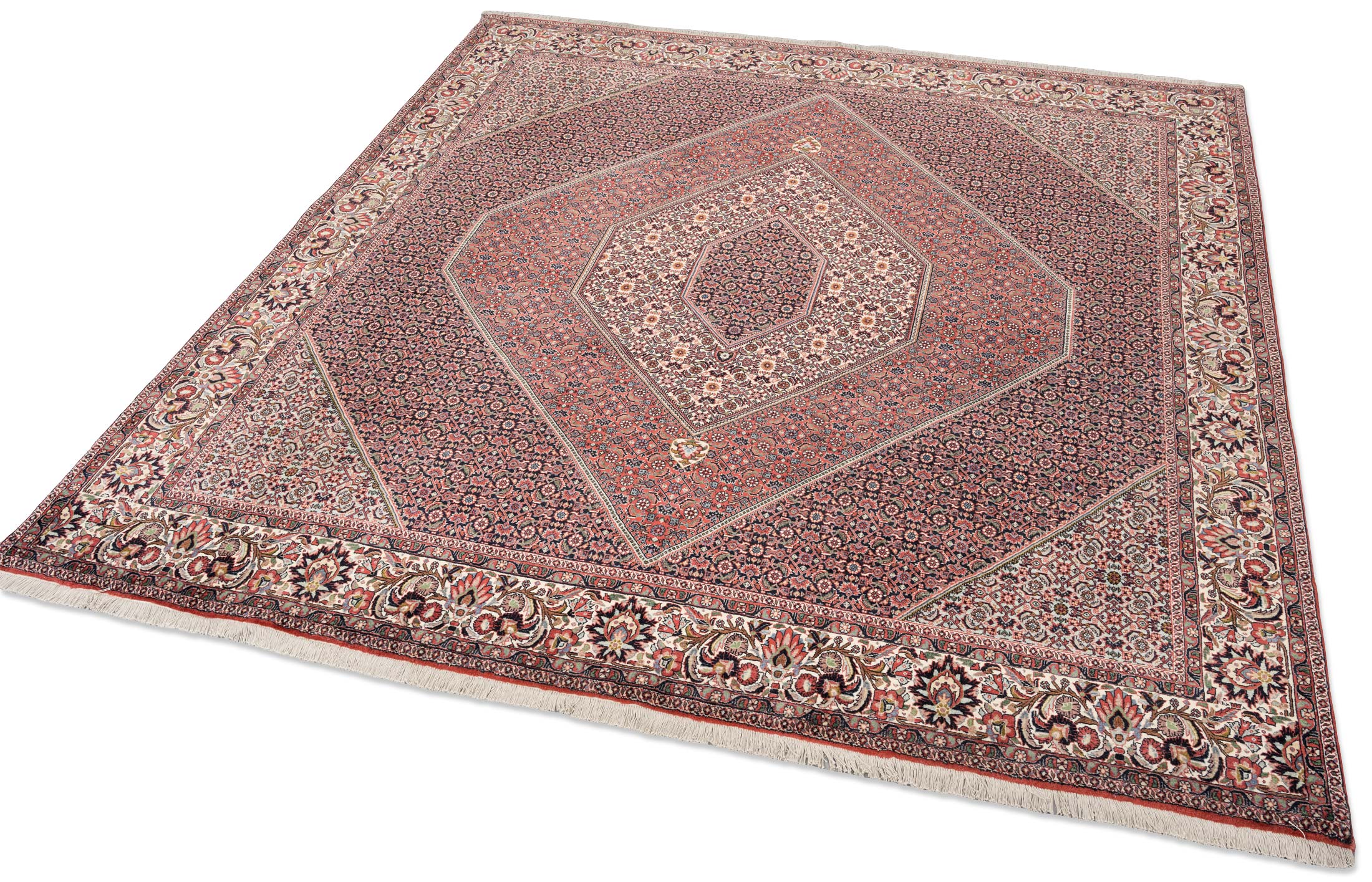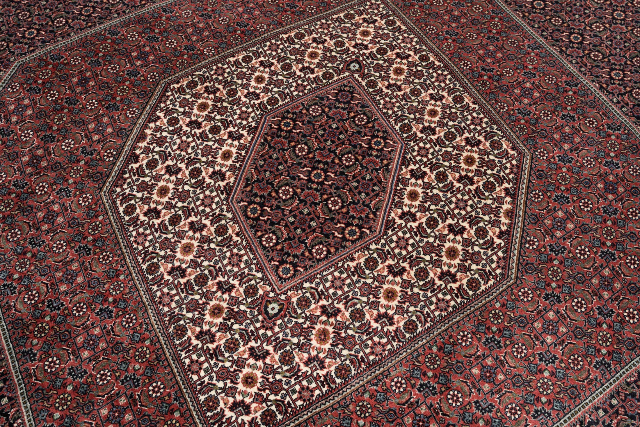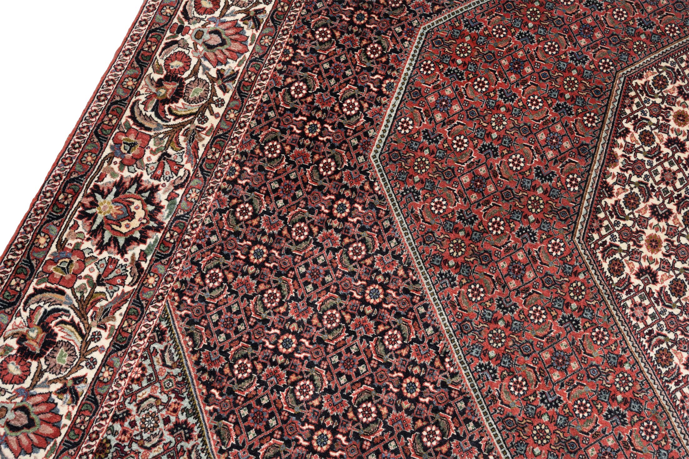 Dieser handgeknüpfte Bidjar-Teppich aus Persien präsentiert sich in einer dominierenden, warmen Rostrot-Nuance, die sofort ins Auge fällt. Diese Hauptfarbe wird harmonisch durch ein tiefes Blau ergänzt, das in den floralen Mustern und dem Herati-Design, auch Fischmuster genannt, zu finden ist. Ein sanftes Cremeweiß verleiht dem Teppich Helligkeit und betont die filigranen Details. Dezente Akzente in Schwarz runden das Farbspiel ab und verleihen dem Teppich Tiefe. Weitere Farben erscheinen ...mehr Beschreibung