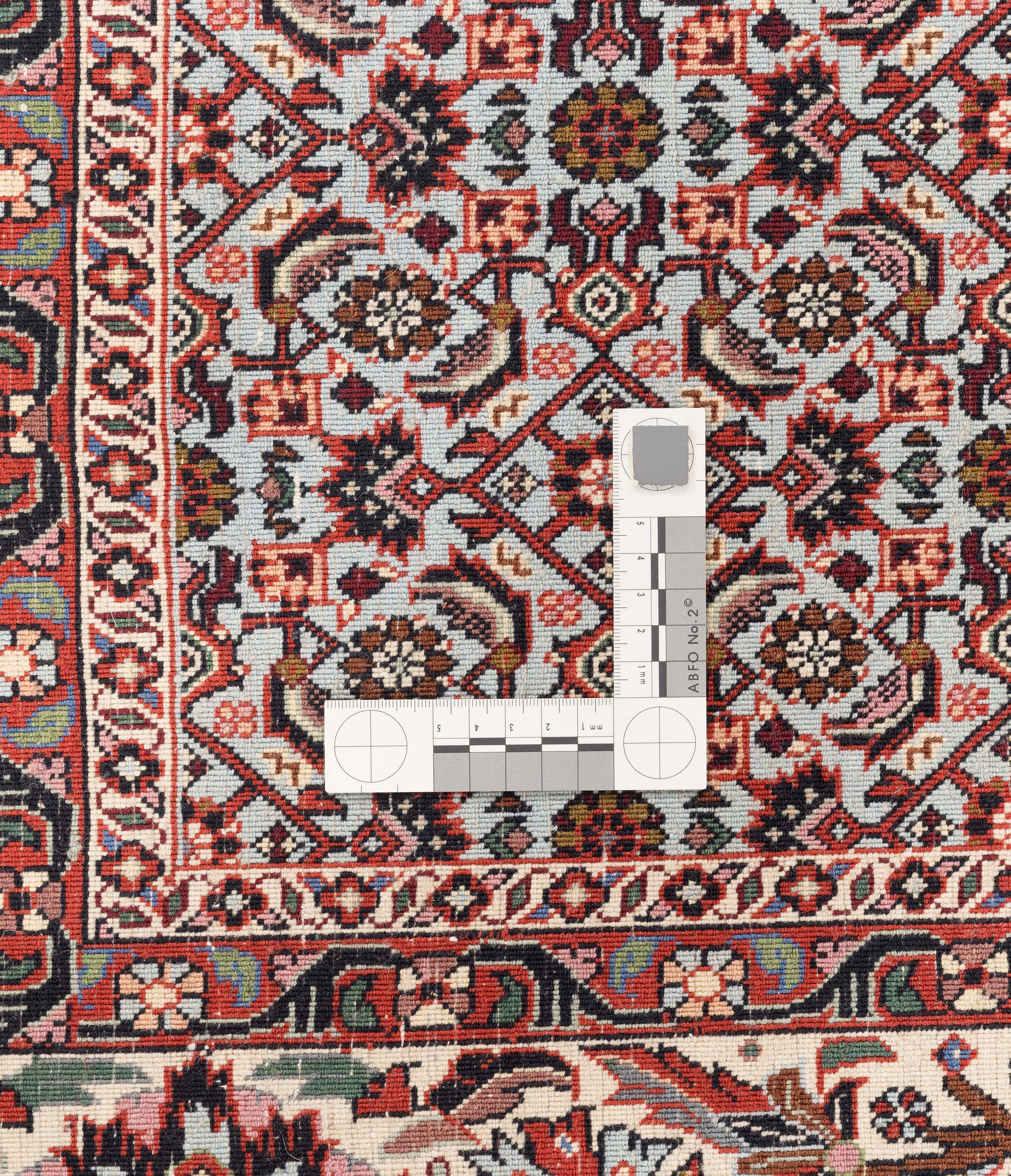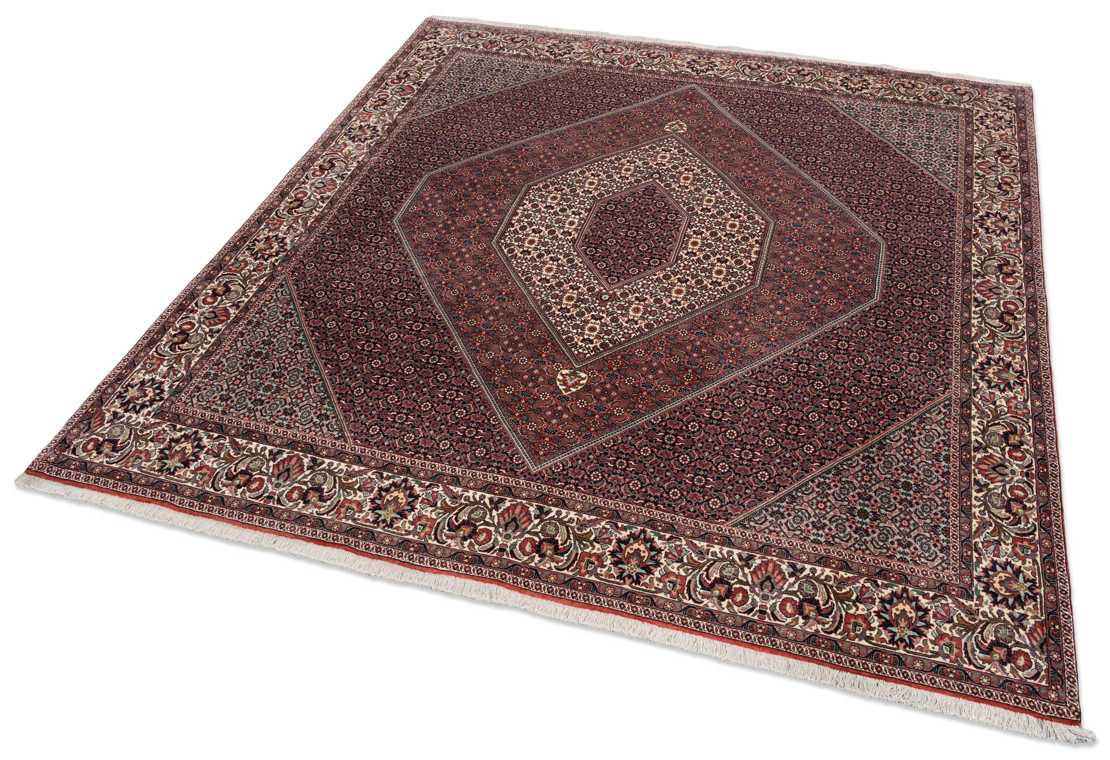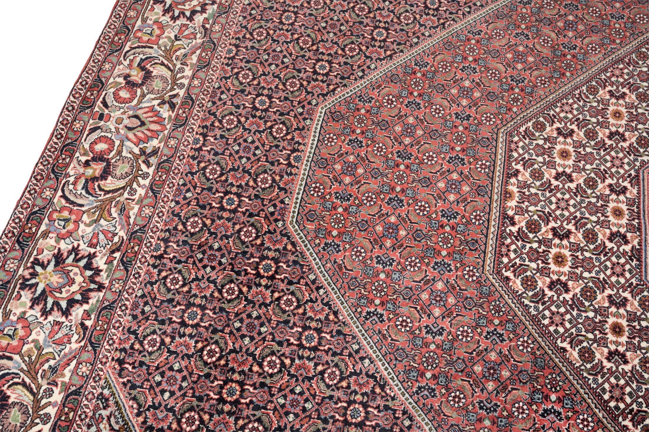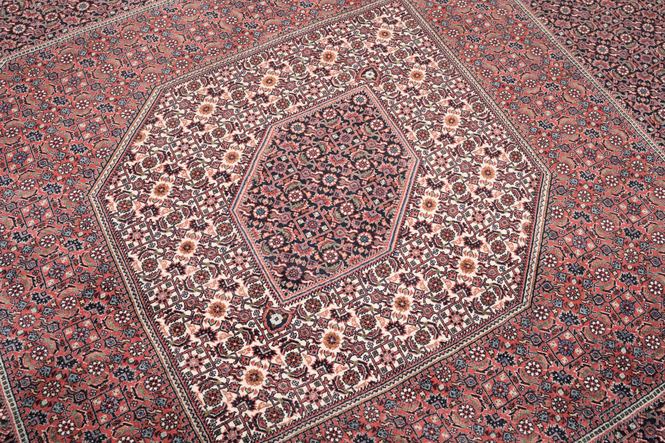 Dieser handgeknüpfte Bidjar-Teppich aus Persien präsentiert sich in einer dominierenden, warmen Rostrot-Nuance, die sofort ins Auge fällt. Diese Hauptfarbe wird harmonisch durch ein tiefes Blau ergänzt, das in den floralen Mustern und dem Herati-Design, auch Fischmuster genannt, zu finden ist. Ein sanftes Cremeweiß verleiht dem Teppich Helligkeit und betont die filigranen Details. Dezente Akzente in Schwarz runden das Farbspiel ab und verleihen dem Teppich Tiefe. Weitere Farben erscheinen ...mehr Beschreibung