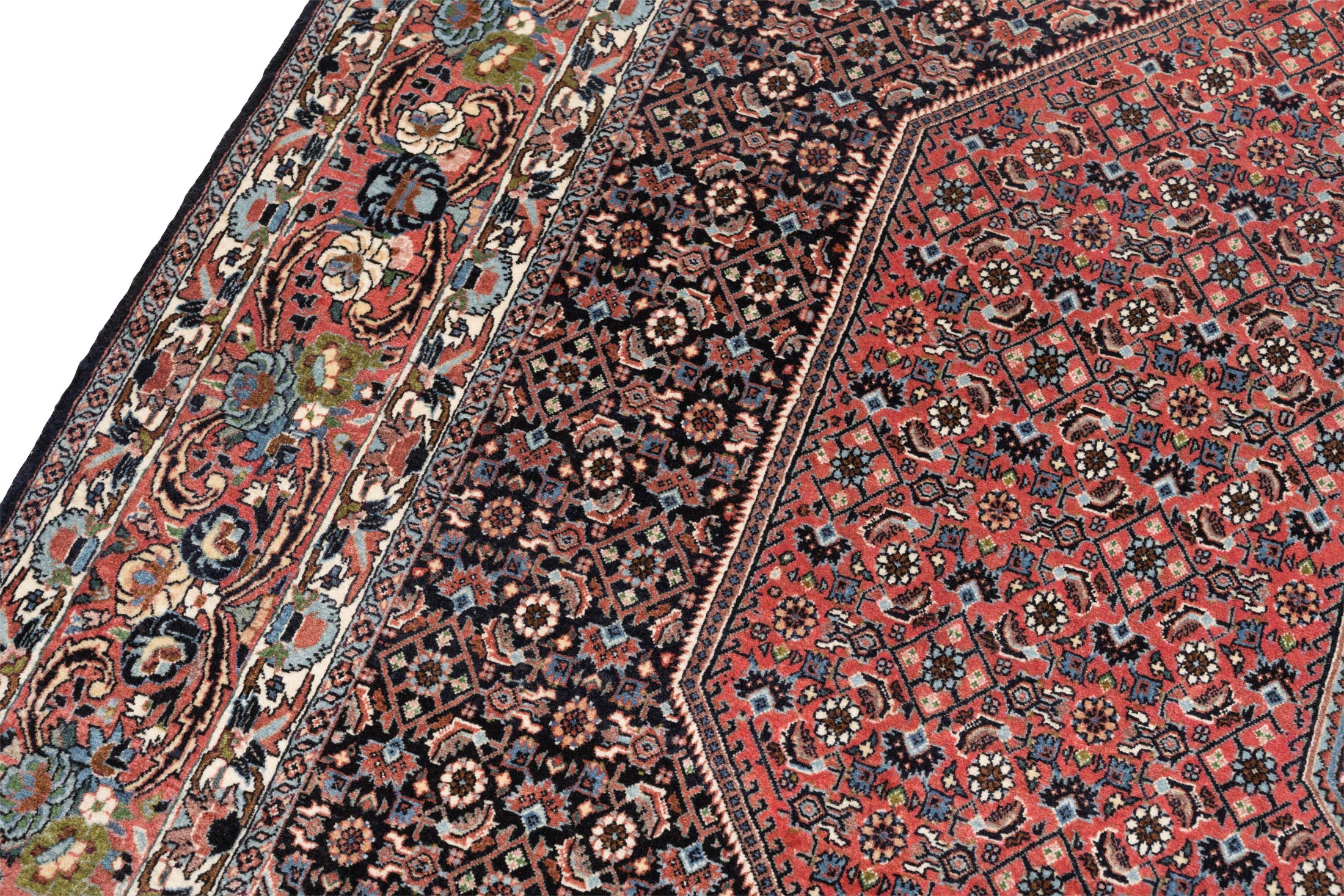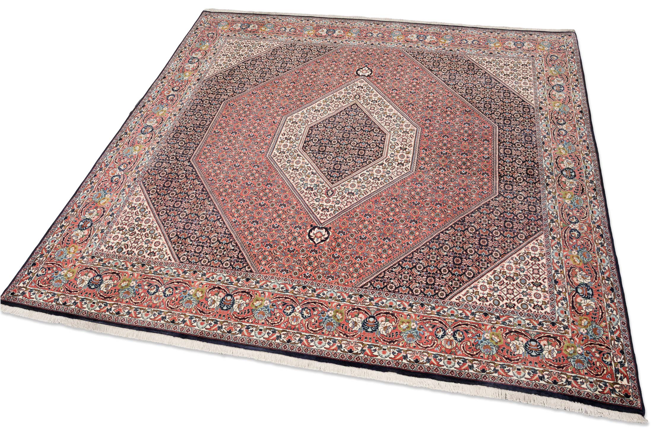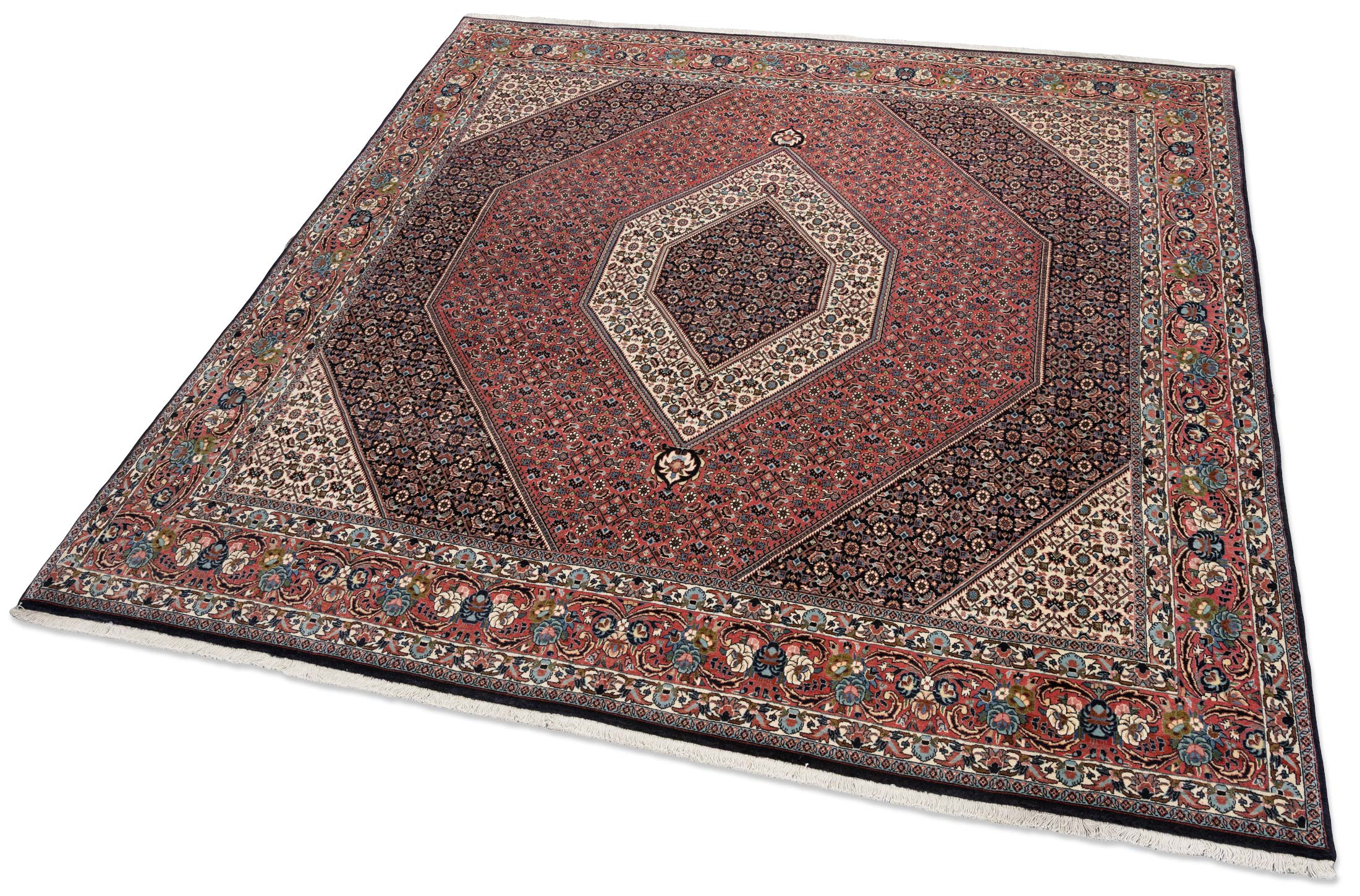 Dieser handgeknüpfte Bidjar-Teppich aus Persien beeindruckt durch seine harmonische Farbgebung und erstklassige Verarbeitung. Die Hauptfarbe ist ein warmes Rostrot, das dem Teppich eine einladende und authentische Ausstrahlung verleiht. Ergänzt wird diese durch ein tiefes Blau, das den floralen Mustern eine gewisse Tiefe verleiht, sowie ein sanftes Beige, das die komplexen Muster hervorhebt. Ein Hauch von Grün rundet die Farbpalette ab und verleiht dem Design eine frische Note.Das Muster ...