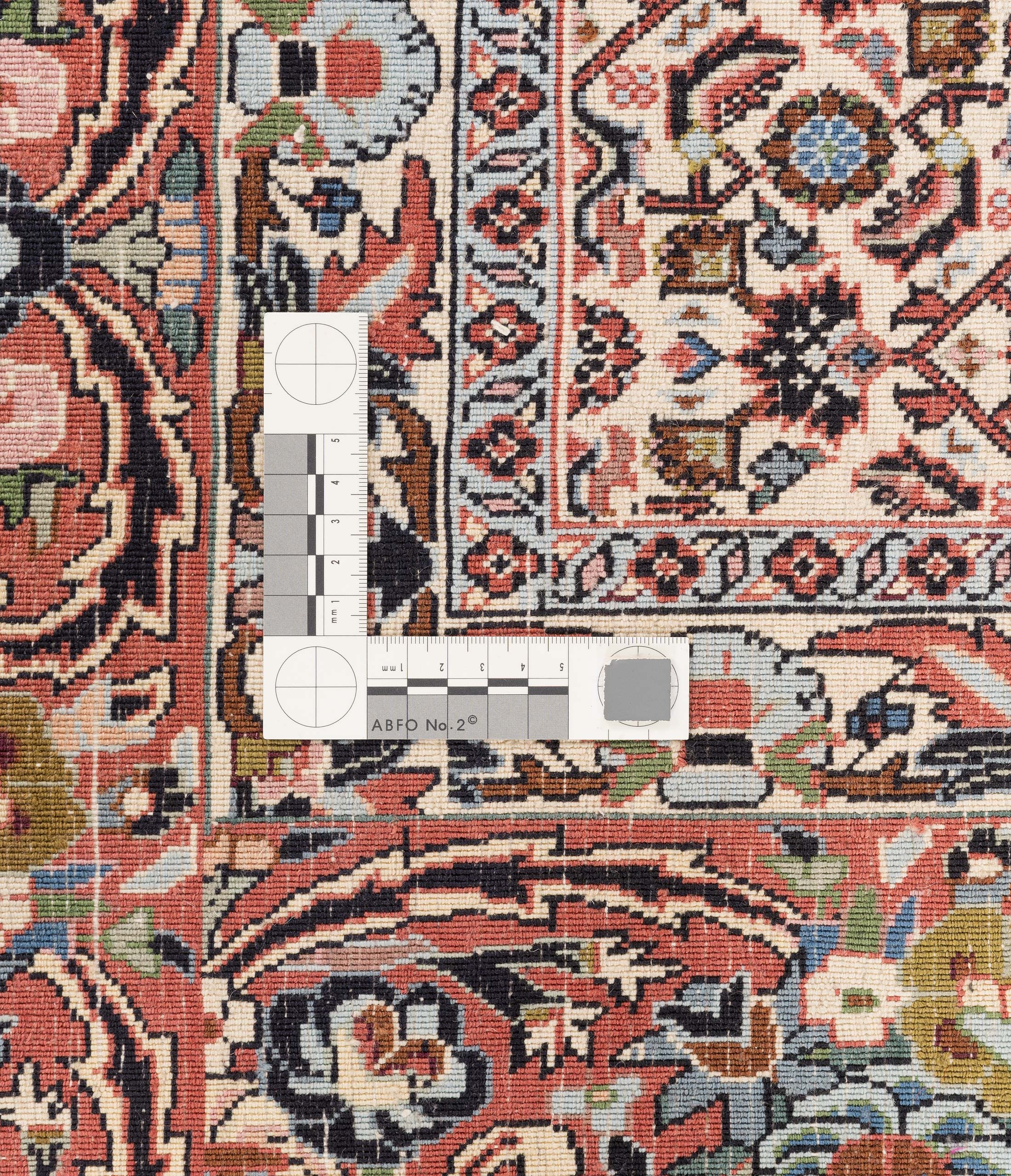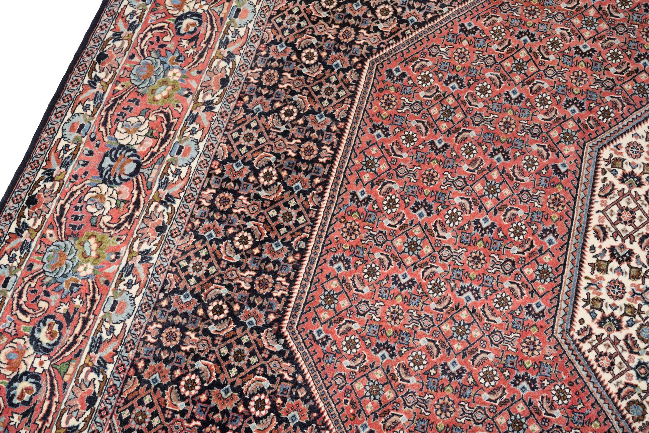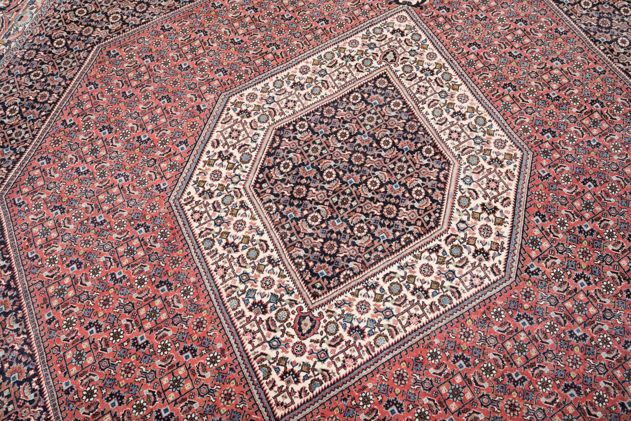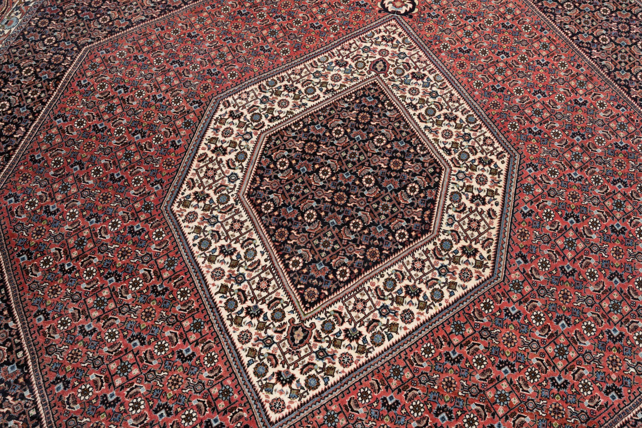 Dieser handgeknüpfte Bidjar-Teppich aus Persien beeindruckt durch seine harmonische Farbgebung und erstklassige Verarbeitung. Die Hauptfarbe ist ein warmes Rostrot, das dem Teppich eine einladende und authentische Ausstrahlung verleiht. Ergänzt wird diese durch ein tiefes Blau, das den floralen Mustern eine gewisse Tiefe verleiht, sowie ein sanftes Beige, das die komplexen Muster hervorhebt. Ein Hauch von Grün rundet die Farbpalette ab und verleiht dem Design eine frische Note.Das Muster ...
