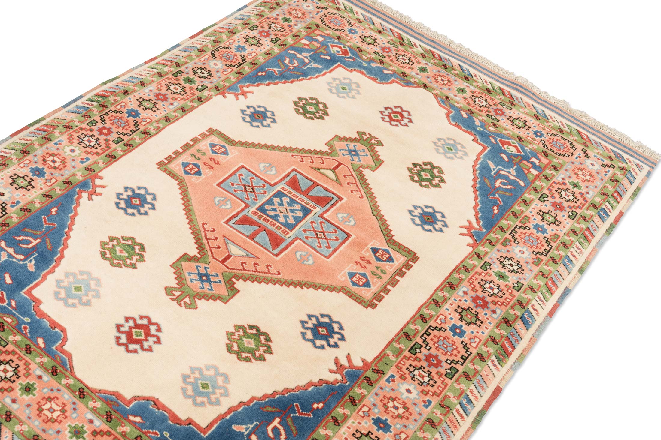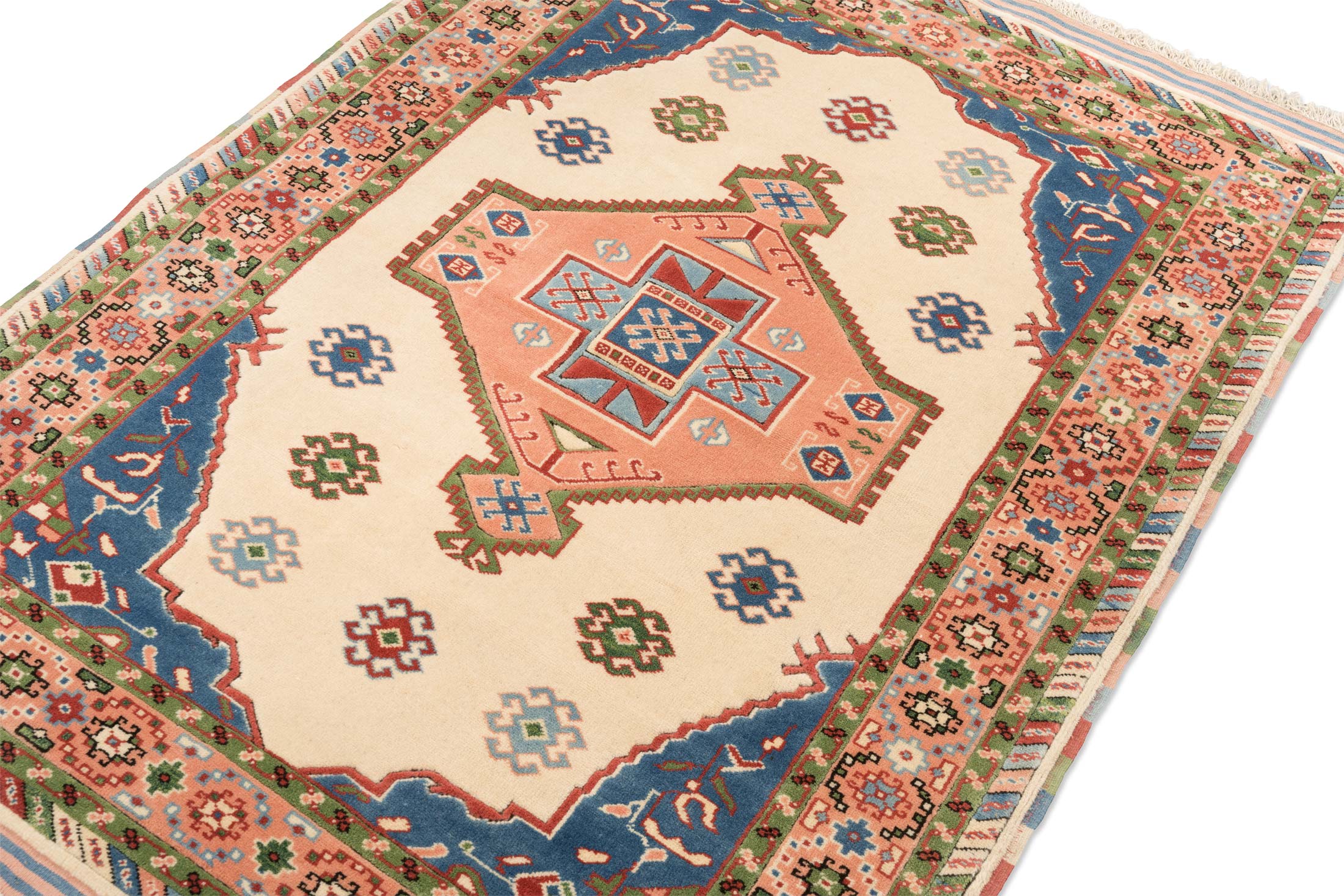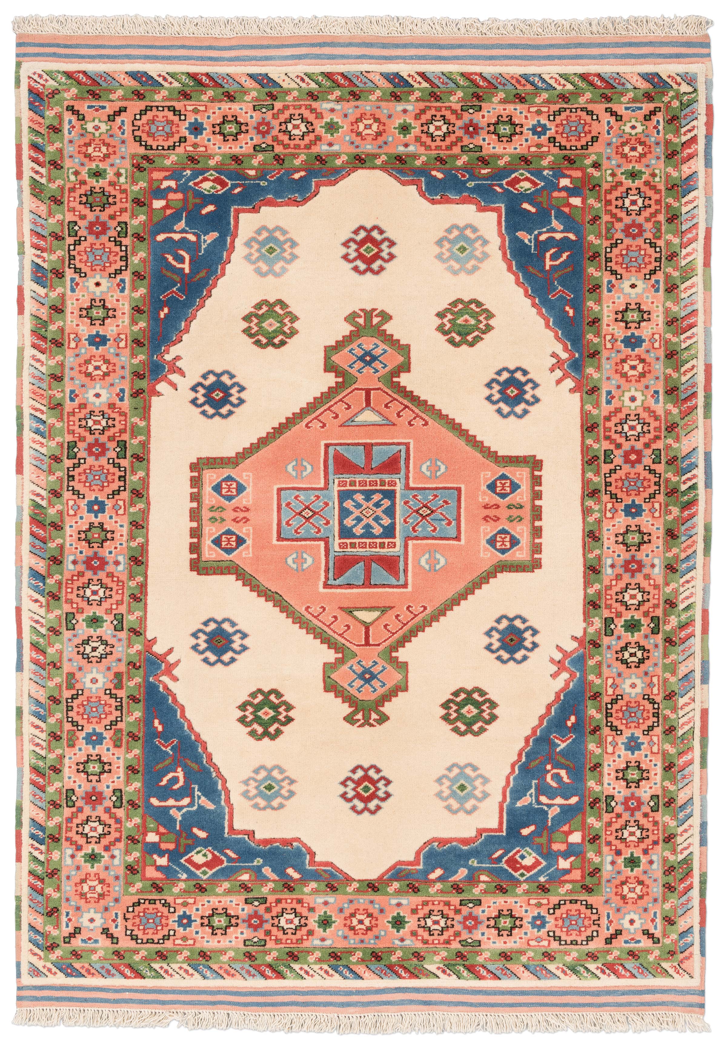 Hier präsentieren wir einen handgeknüpften Teppich aus der Türkei, der den Charme der antiken Motive von Bergama verkörpert. Die Hauptfarbe dieses Kunstwerks ist ein weiches Creme, das den Teppich in eine warme Atmosphäre hüllt. Die weiteren dominierenden Farben sind ein lebendiges Ziegelrot, tiefes Blau und frisches Grün, die zusammen eine harmonische und dennoch lebendige Farbpalette bilden. Diese Farben werden ergänzt durch dezente Töne, die dem Design eine fröhliche und bunte Note ...mehr Beschreibung