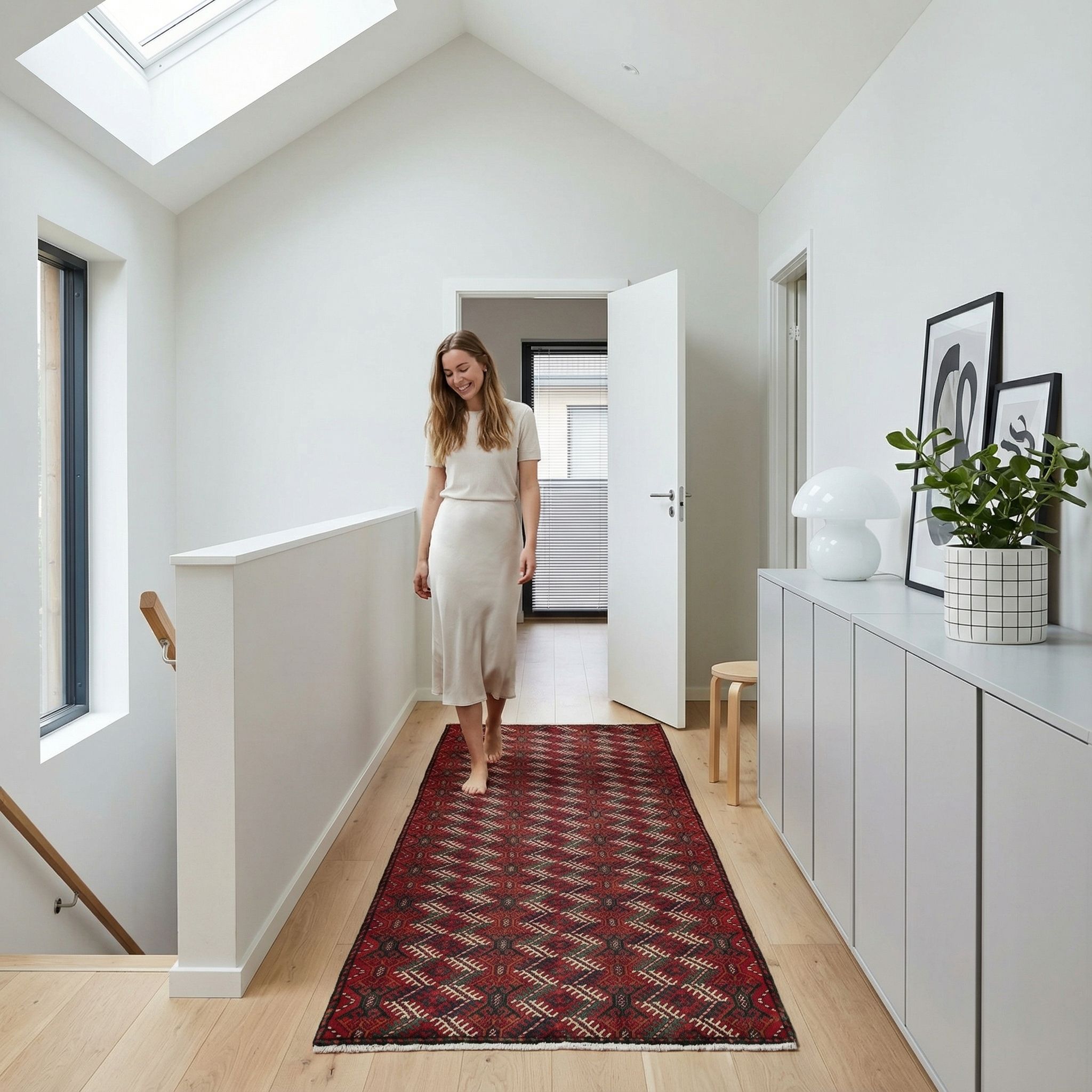 In einem Industrial-Ambiente dient dieser Teppich als warmer, weicher Kontrapunkt zu den kühlen und harten Materialien wie Beton, Stahl und unverputztem Mauerwerk. Die dunklen Rottöne und das grafische Muster passen hervorragend zur maskulinen und rauen Ästhetik alter Fabriklofts oder moderner Apartments im Industriedesign. Seine beschriebene Strapazierfähigkeit und die robuste Qualität der Schafwolle spiegeln den funktionalen und langlebigen Anspruch dieses Einrichtungsstils wider. Durch den Einsatz eines solchen handgeknüpften Originals wird dem Raum die Strenge genommen, ohne dass der coole Loft-Charakter verloren geht.