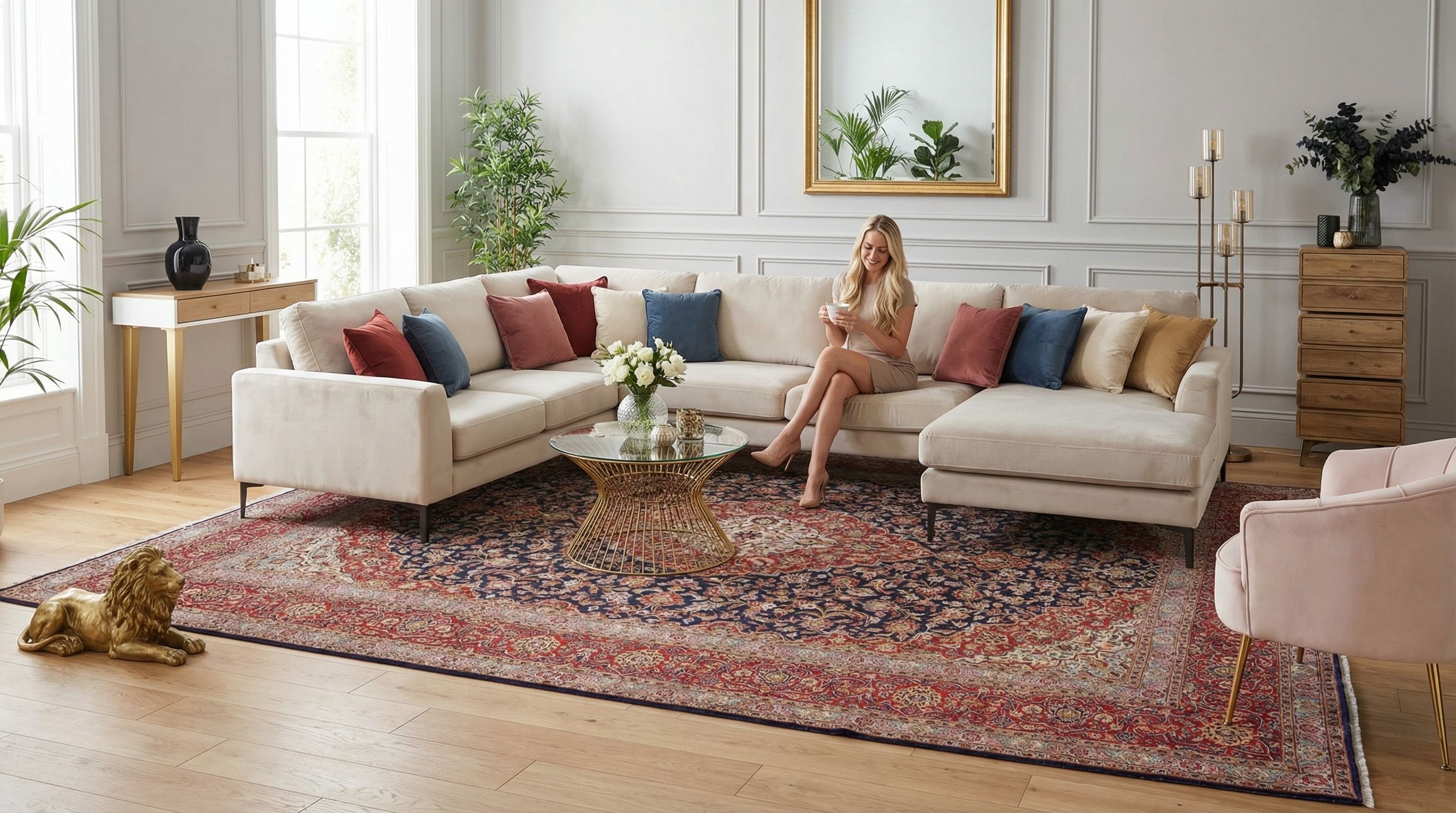 Dieser Teppich passt perfekt zum Glam-Style, da er durch seine Beschreibung als „Spitzenqualität“ und die extrem feine Knüpfung puren Luxus und Exklusivität verkörpert. Die seltene blaue Grundfarbe wirkt wie ein Edelsteinton und lässt sich hervorragend mit Samtsofas, goldenen Accessoires und Spiegeln kombinieren. Die historische Bedeutung der Keschan-Teppiche, die schon in großen Museen zu finden sind, unterstreicht den Anspruch auf repräsentatives und hochwertiges Wohnen. Er bildet die glamouröse Bühne für ein opulentes Interieur und verleiht dem Glanz der Einrichtung die nötige substanzielle Schwere.
