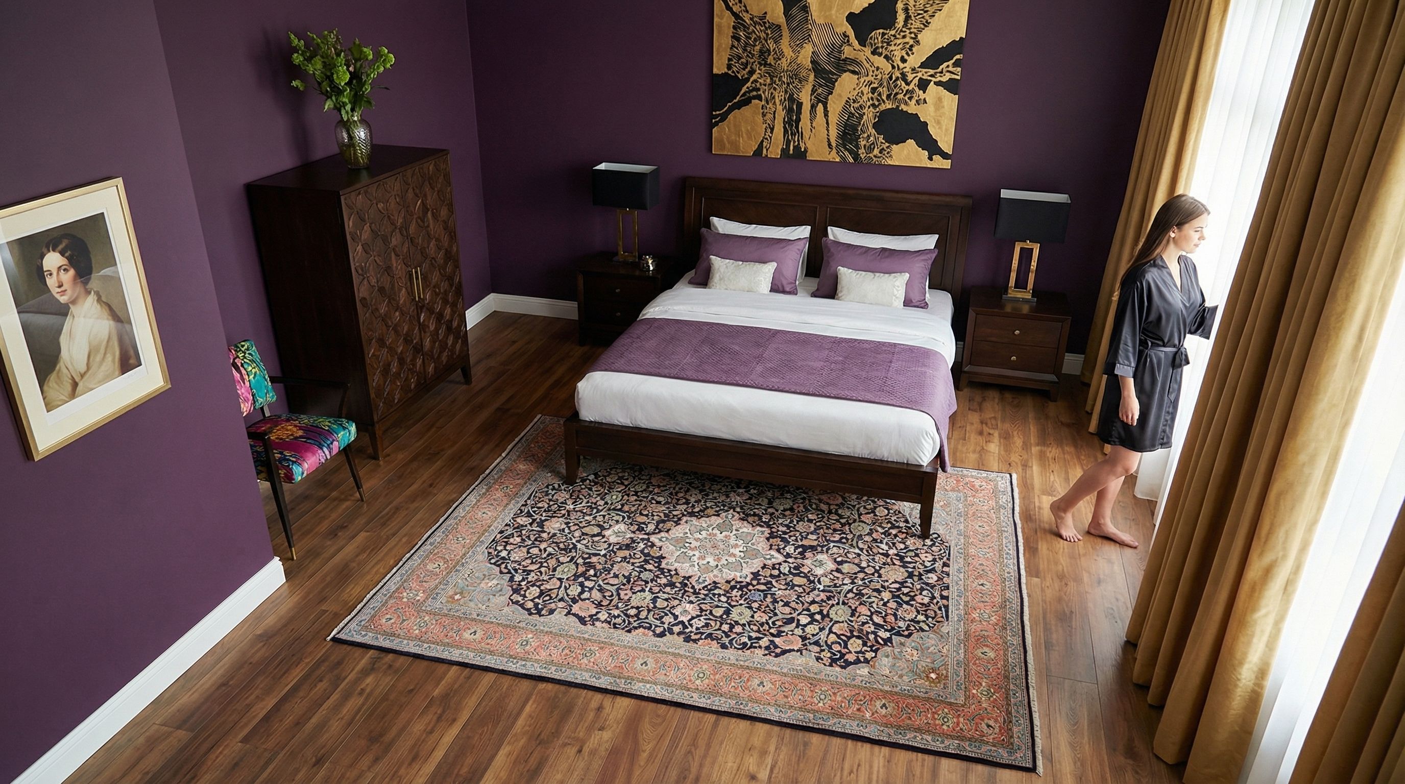 Dieser handgeknüpfte Sarough-Teppich aus Persien besticht durch seine eindrucksvolle Farbgebung und exquisite Musterung. Die Hauptfarbe ist ein tiefes Mitternachtsblau, das eine beruhigende und zugleich majestätische Ausstrahlung verleiht. Ergänzt wird dieses durch warme Kupfertöne und zarte Elfenbeinakzente, die das kunstvolle Design harmonisch abrunden. Das klassische Doldenmotiv dominiert das Zentrum, umgeben von floralen Elementen, die in einem eleganten Tanz miteinander verbunden sind. ...mehr Beschreibung