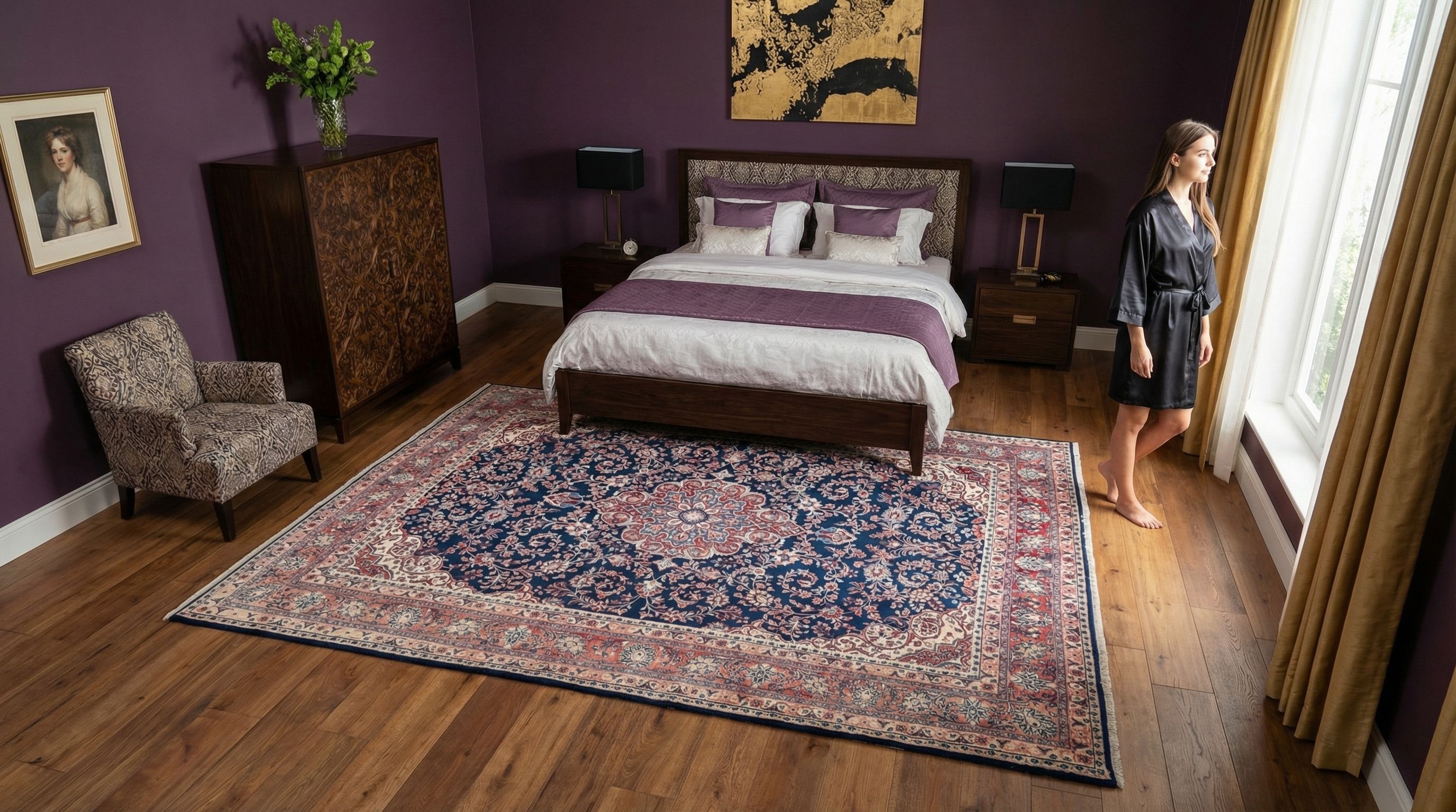Dieser handgeknüpfte Sarough-Teppich aus Persien besticht durch seine tiefe Hauptfarbe in einem satten Marineblau, das die Grundlage für das elegante Design bildet. Ergänzt wird diese durch ein edles Bordeauxrot, das dem Teppich eine warme und einladende Ausstrahlung verleiht. Dezente Creme- und Beigetöne fügen sich harmonisch ein und betonen die kunstvollen Ornamente. Die Musterung ist reich an floralen Motiven, die von einem klassischen Doldenmotiv dominiert werden, welches dem Teppich ...mehr Beschreibung