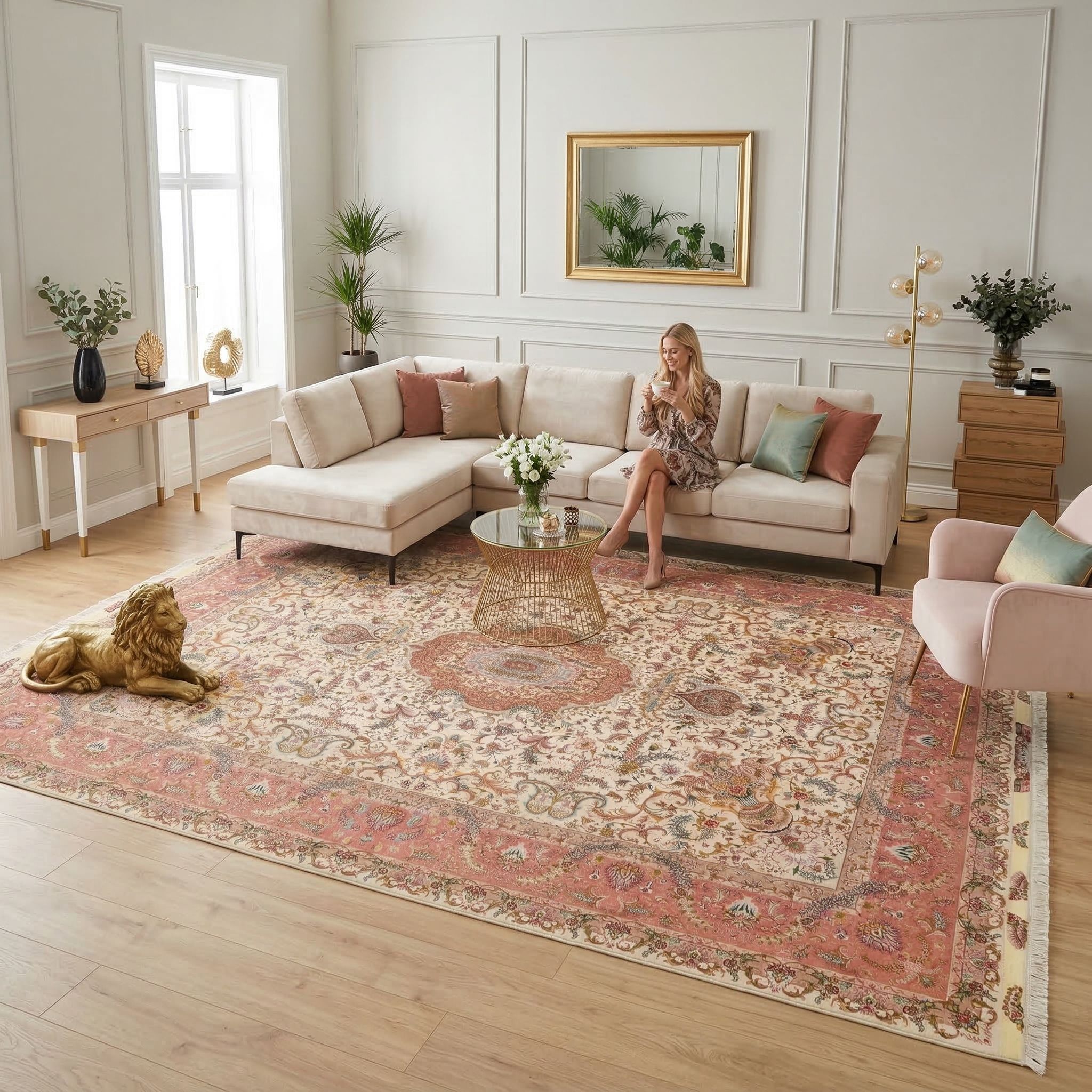 Die dichten floralen Motive mit den kunstvollen Palmetten und Vasen passen hervorragend zur romantischen und gemütlichen Ästhetik des modernen Landhausstils. Besonders die warme, von Rosé und Creme dominierte Farbgebung harmoniert wunderbar mit hellen Holzmöbeln, weißen Dielenböden und natürlichen Leinenstoffen. Der Teppich bringt eine klassische Wertigkeit in den Raum, die den ländlichen Charme aufwertet, ohne die beschwingte Leichtigkeit der Einrichtung zu beschweren. So entsteht eine einladende Atmosphäre, die Tradition und frischen New-Country-Chic stilvoll miteinander verbindet.