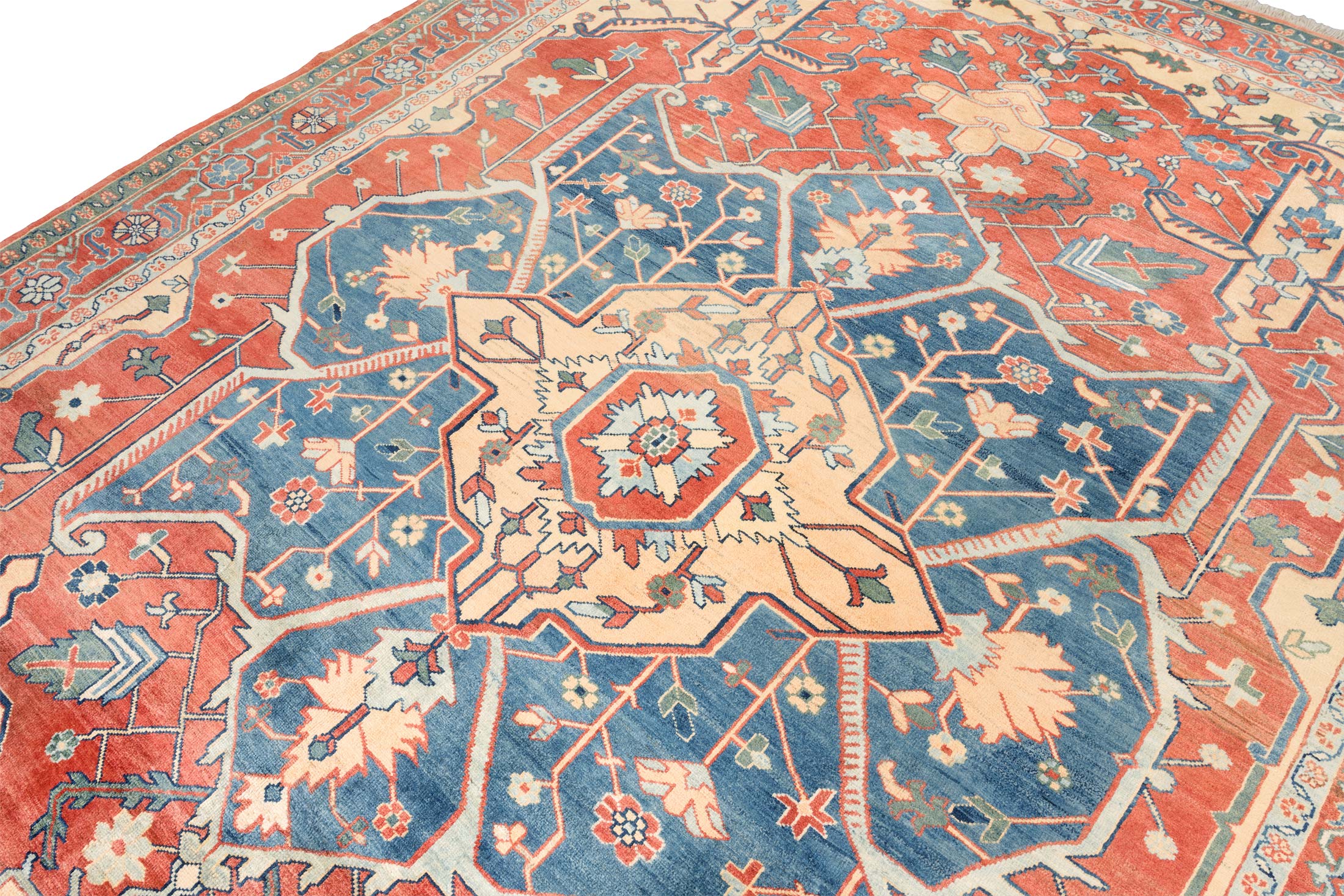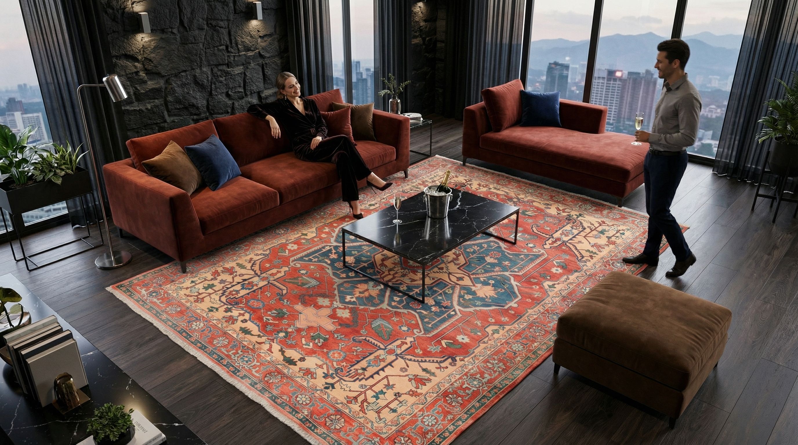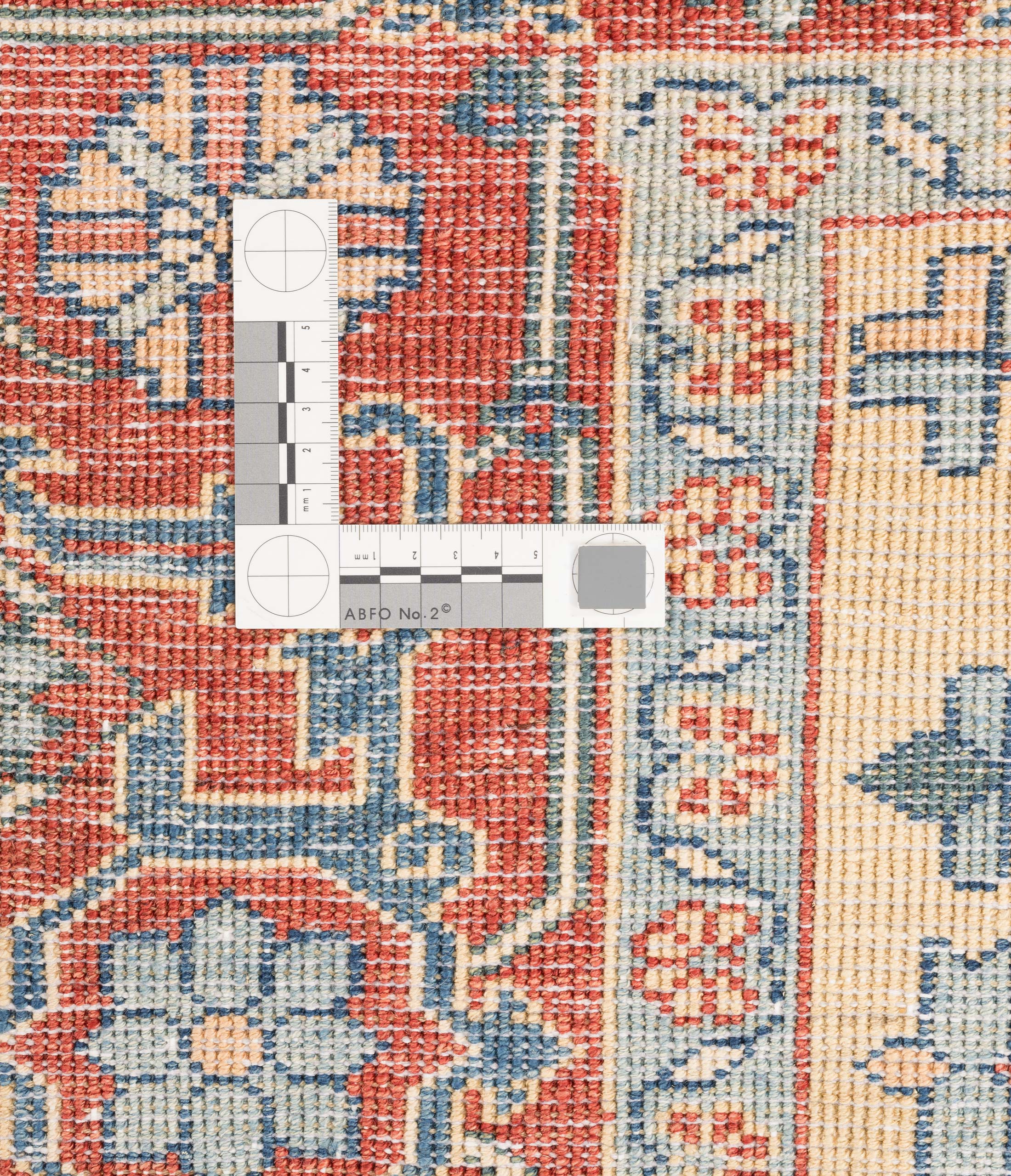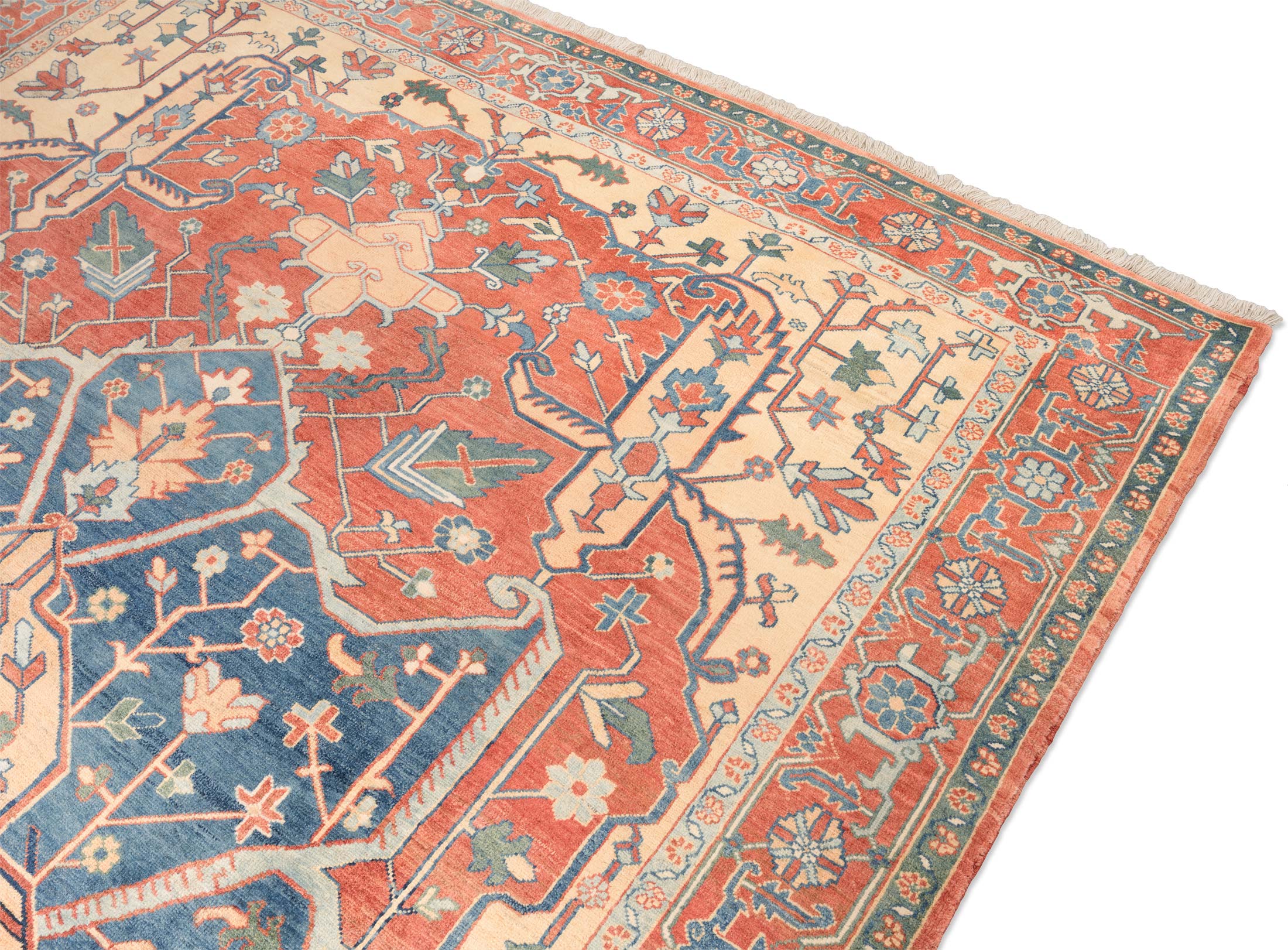 Dieser handgeknüpfte Ghadimi-Teppich aus dem Hause Mesgarzadeh beeindruckt mit seiner dominierenden roten Hauptfarbe, die eine warme, einladende Atmosphäre schafft. Ergänzt wird das Farbenspiel durch ein tiefes Blau, das für einen eleganten Kontrast sorgt, und ein sanftes Beige, das die Komposition harmonisch abrundet. Die Musterung ist komplex und kunstvoll, inspiriert von traditionellen Heriz-, Serapi- und Bachshayesch-Designs, die florale und geometrische Elemente in perfekter Balance ...mehr Beschreibung