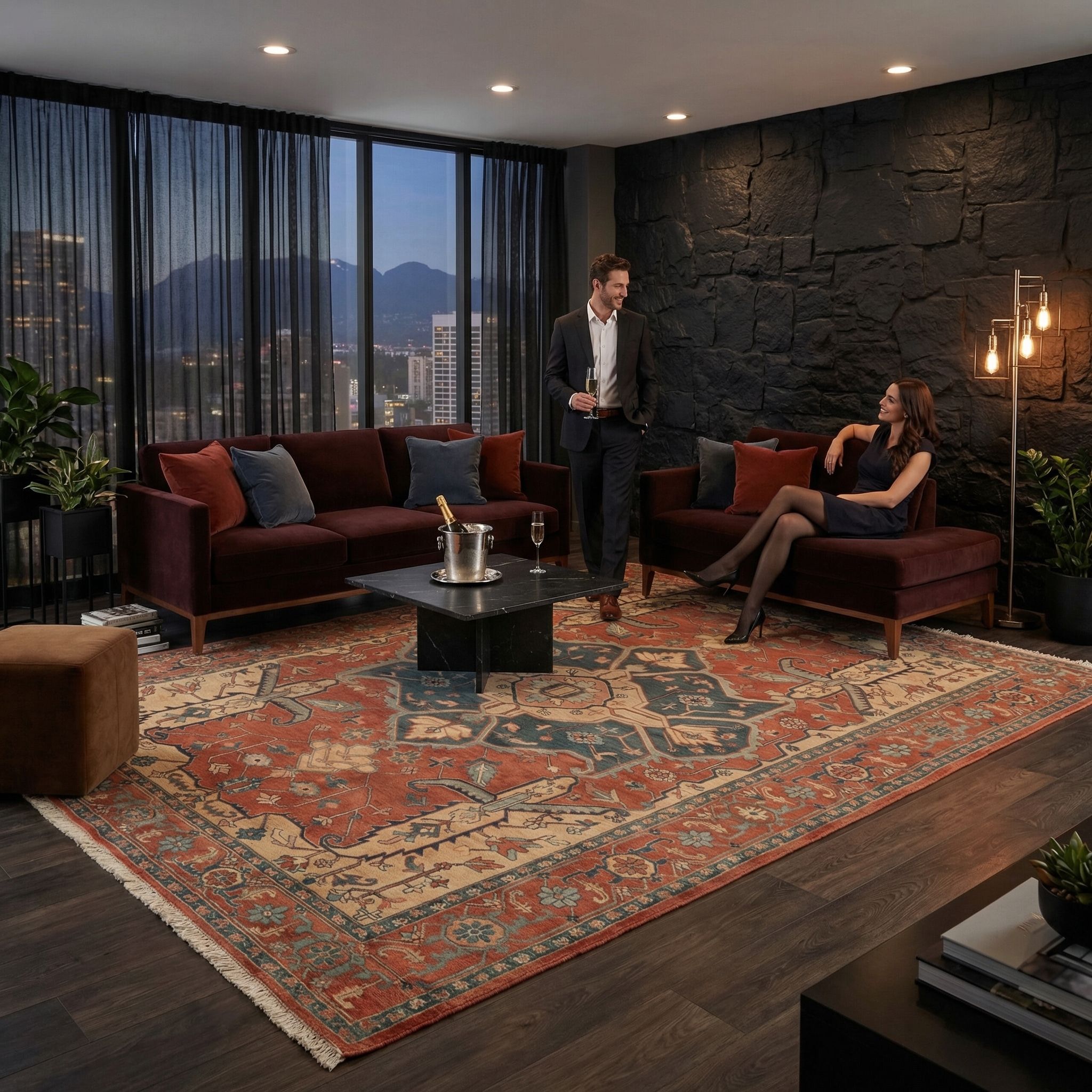 Hier wird der Teppich als bewusster Stilbruch eingesetzt, um die oft kühlen und geradlinigen Formen des zeitgenössischen Designs mit Wärme und Geschichte aufzubrechen. Da der Ghadimi zeitgemäß interpretiert ist und modischen Strömungen widersteht, erdet er moderne Räume, ohne im Widerspruch zur schlichten Architektur zu stehen. Die extrem hohe Qualität und Dichte des Flors bieten einen luxuriösen Kontrast zu glatten Oberflächen wie Glas, Stahl oder poliertem Beton. Er fungiert als exklusives Kunstwerk am Boden, das dem Raum Seele einhaucht, ohne die moderne Ästhetik zu stören.