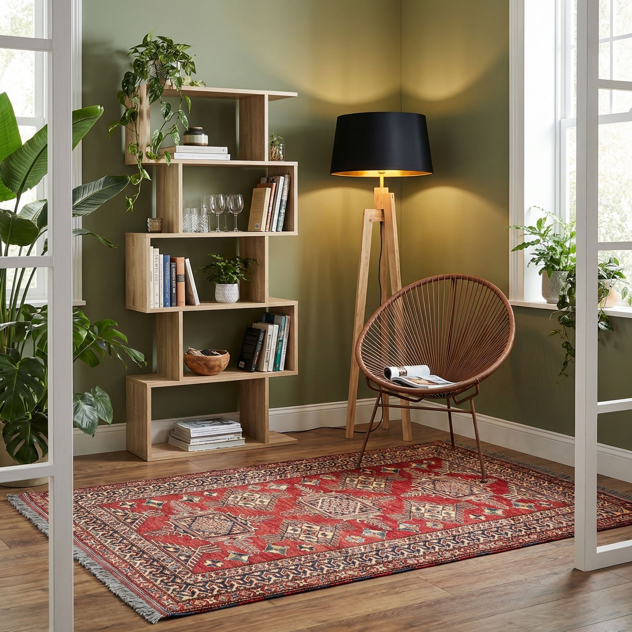 Als meisterhafter Stilbruch nimmt dieser hochwertige Knüpfteppich der kühlen Strenge des Industrial-Styles die Härte, ohne seinen Charakter zu verwässern. Das intensive Rot und die markanten geometrischen Muster stehen in einem spannenden Dialog zu rohen Materialien wie Beton, Stahl und freigelegtem Mauerwerk. Die feine Knüpfung und die weiche Haptik der Naturwolle setzen einen gemütlichen Kontrapunkt zur rauen Loft-Atmosphäre. So fungiert der Teppich als verbindendes Element, das Wärme und Wohnlichkeit in die funktionale Ästhetik des Industrielooks bringt.