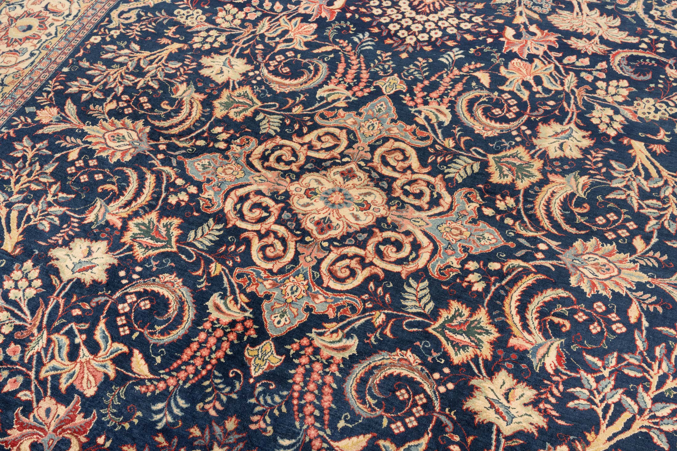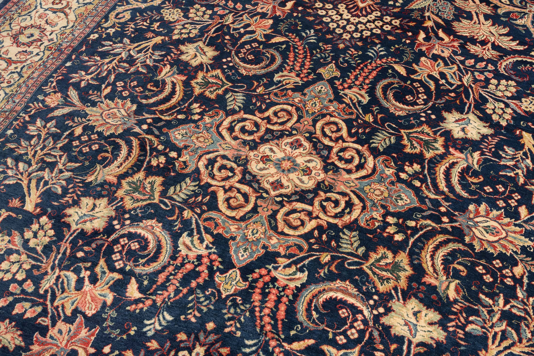 Hier präsentieren wir einen seltenen blauen Sarough-Teppich aus den 1950er Jahren, der durch seine außergewöhnliche Feinheit mit etwa 200.000 Knoten pro Quadratmeter besticht. Die Hauptfarbe ist ein tiefes, intensives Blau, das dem Teppich eine elegante und edle Ausstrahlung verleiht. Die floralen Muster sind kunstvoll in warmen Rot- und Goldtönen gestaltet, während Akzente in zartem Beige und sanftem Grün den Gesamteindruck abrunden. Diese harmonische Farbpalette wird durch die ...mehr Beschreibung