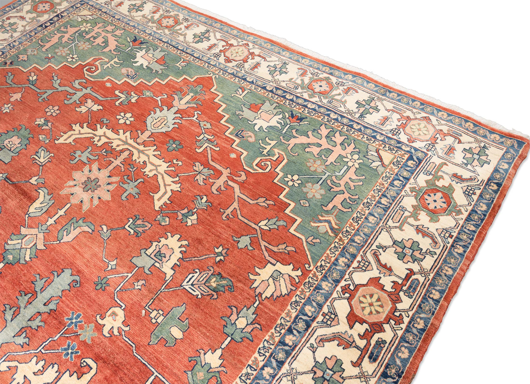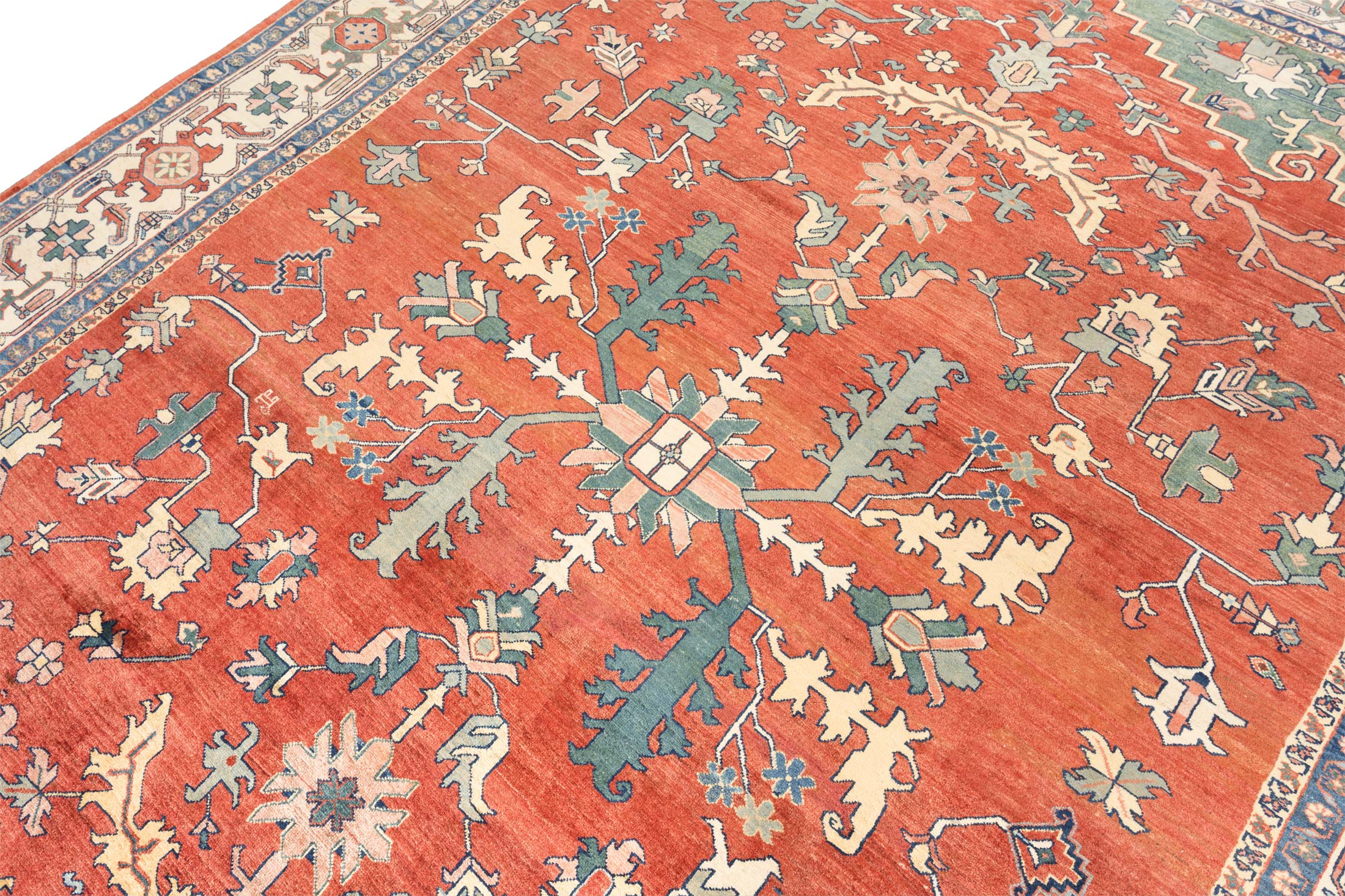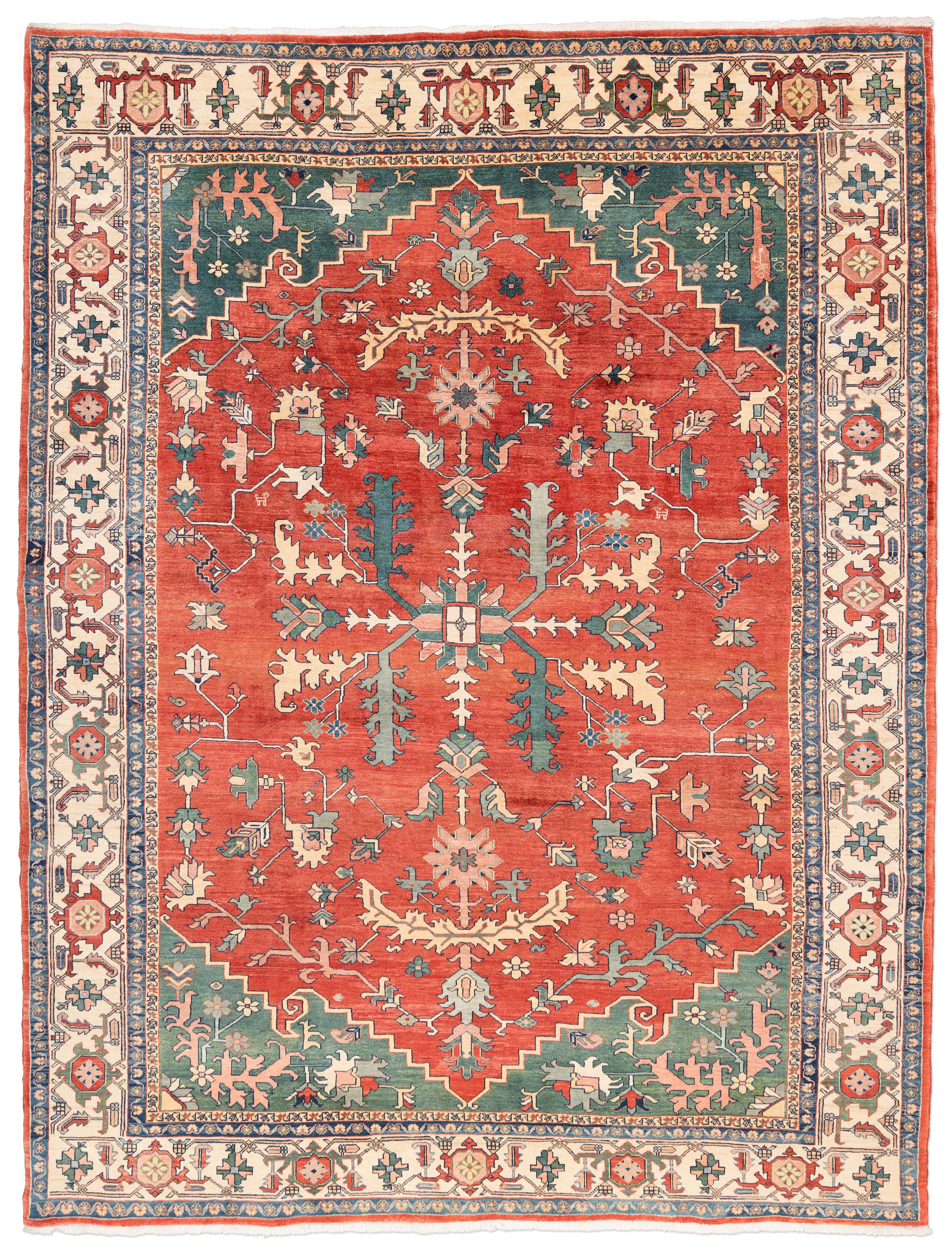 Dieser handgeknüpfte Ghadimi-Teppich aus dem Hause Mesgarzadeh besticht durch seine harmonische Farbkomposition und seine kunstvolle Musterung. Die Hauptfarbe ist ein warmes Rot, das dem Teppich eine einladende und lebendige Ausstrahlung verleiht. Ergänzt wird diese durch ein tiefes Blau und ein natürliches Cremeweiß, die zusammen ein ausgewogenes und zugleich dynamisches Gesamtbild schaffen. Die Musterung des Teppichs ist von traditionellen Heriz-, Serapi- und Bachshayesch-Designs ...mehr Beschreibung
