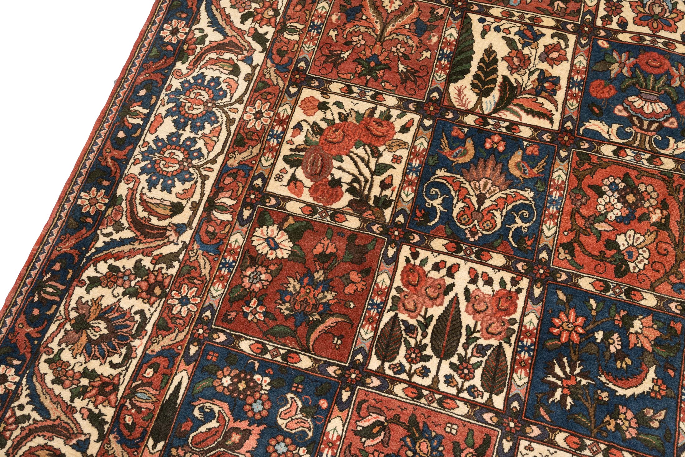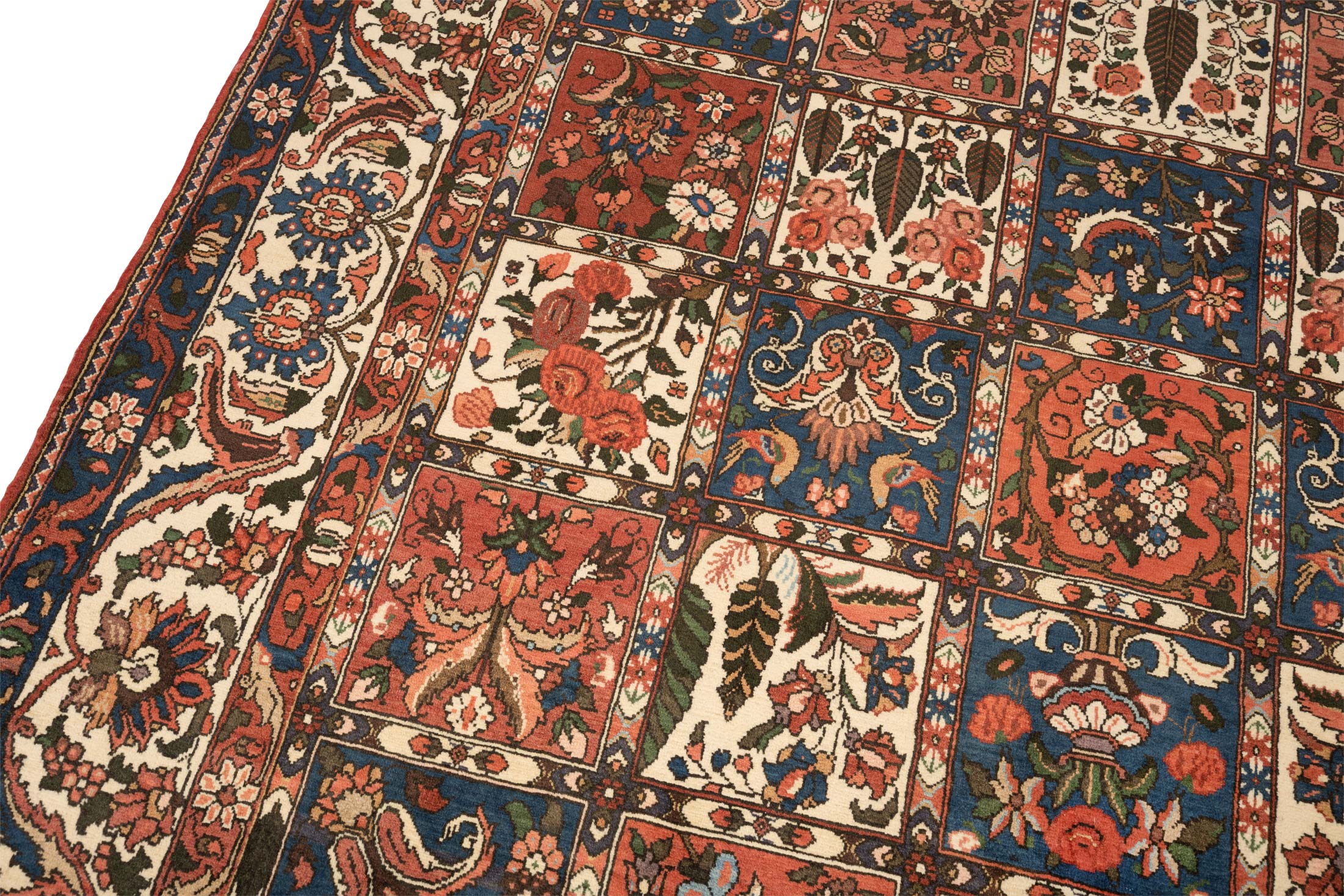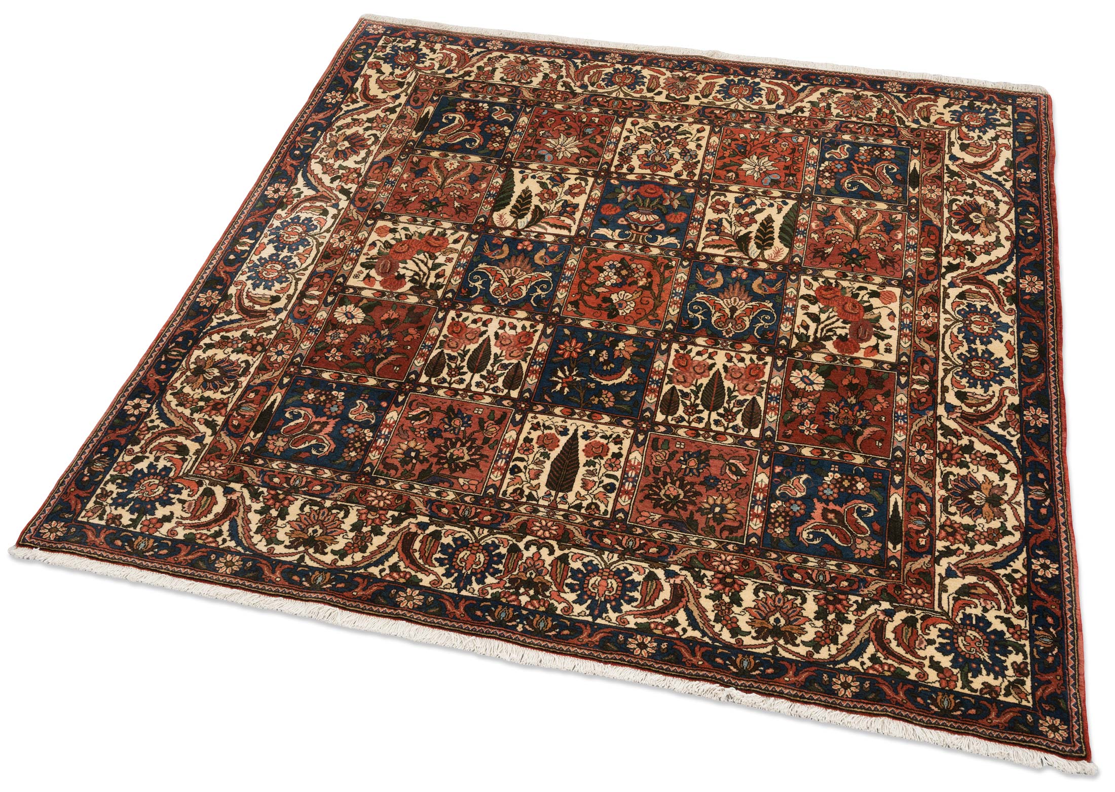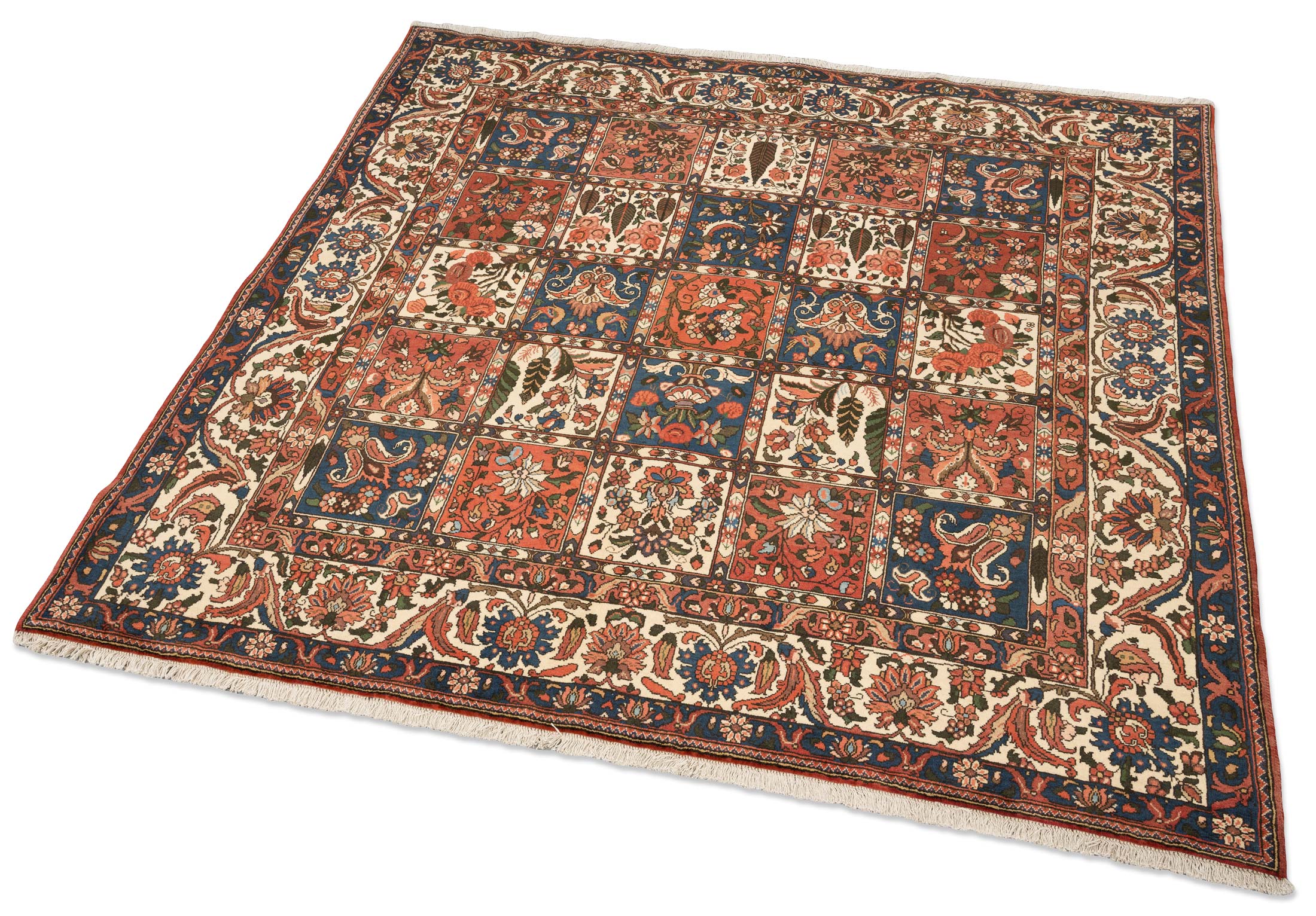 Hier präsentieren wir einen handgeknüpften Bachtiar-Teppich aus Persien, der in feiner 1a Saman-Qualität erstrahlt. Die Hauptfarbe dieses prächtigen Stücks ist ein intensives Rot, das mit sattem Blau und warmem Creme harmoniert. Diese Farbkombination wird durch Akzente von Grün und Braun ergänzt, die dem Teppich eine lebendige und gleichzeitig harmonische Ausstrahlung verleihen. Die Musterung zeichnet sich durch ein faszinierendes Gartenmotiv aus, das aus rechteckigen und quadratischen ...mehr Beschreibung
