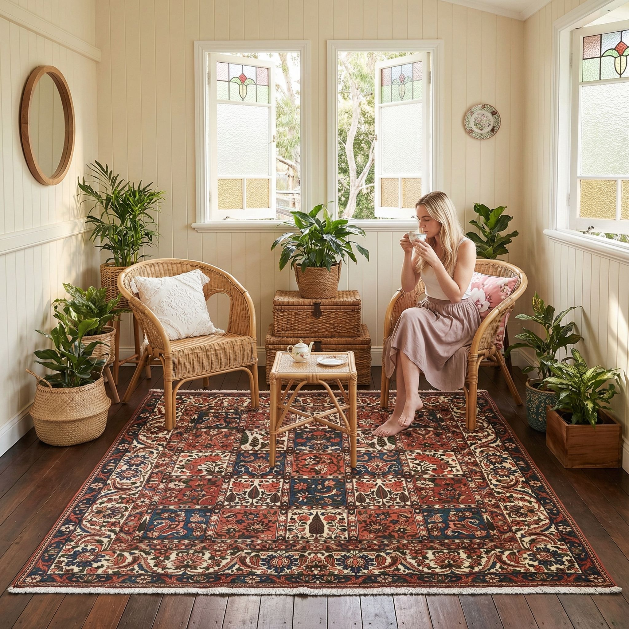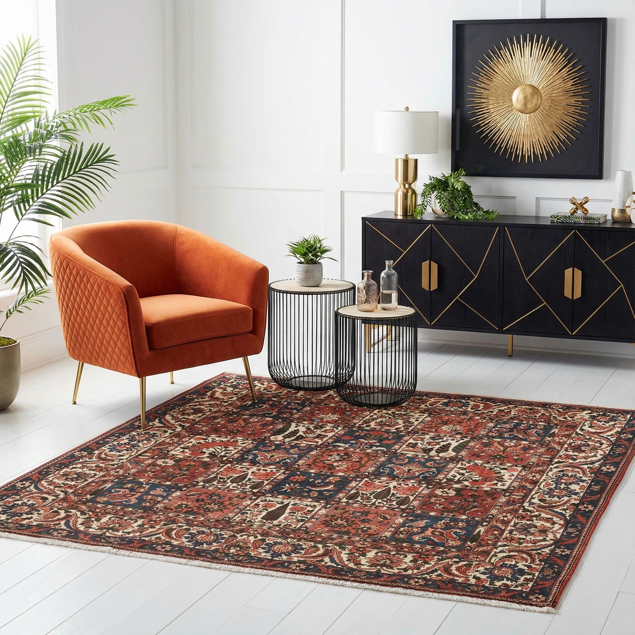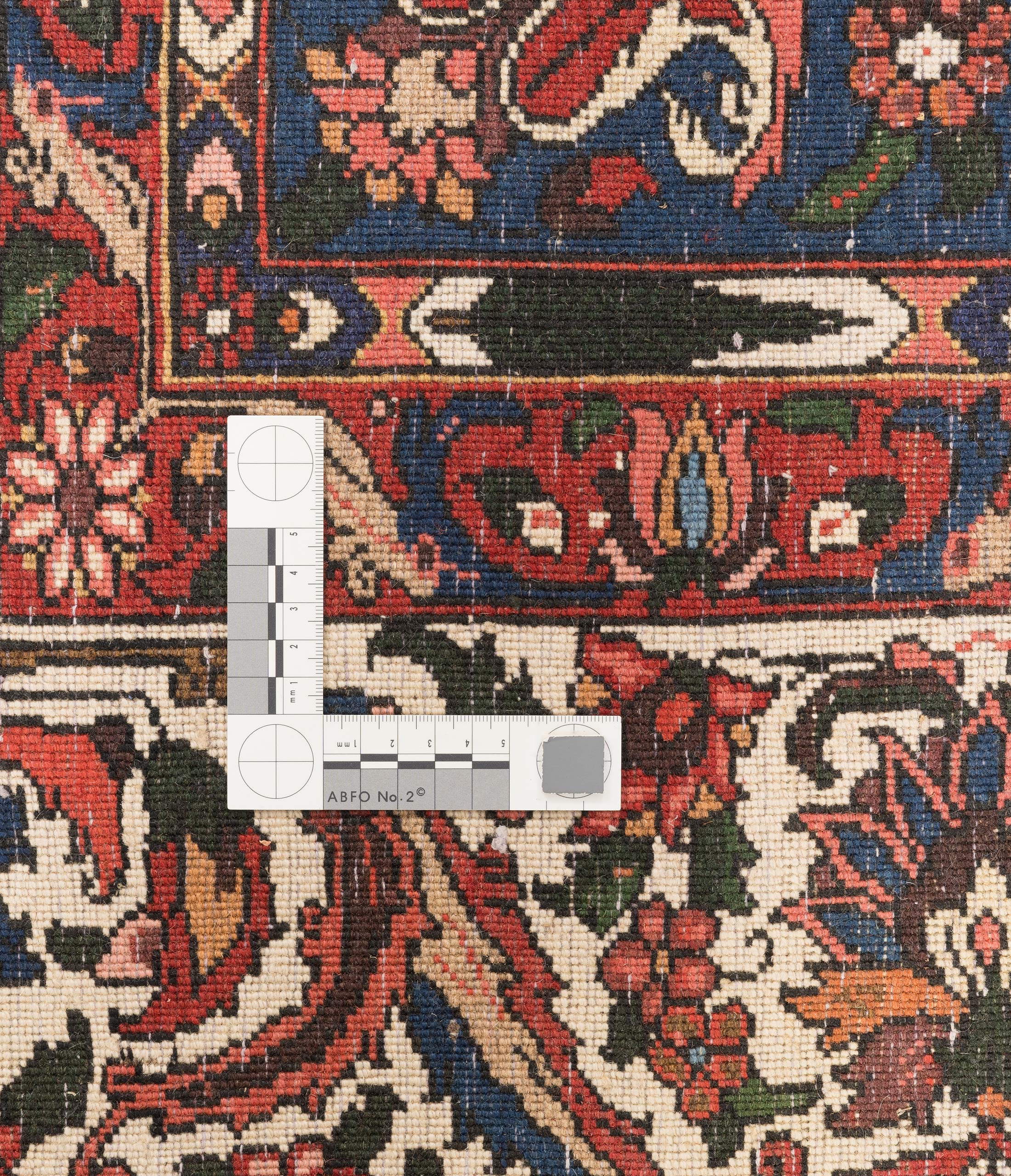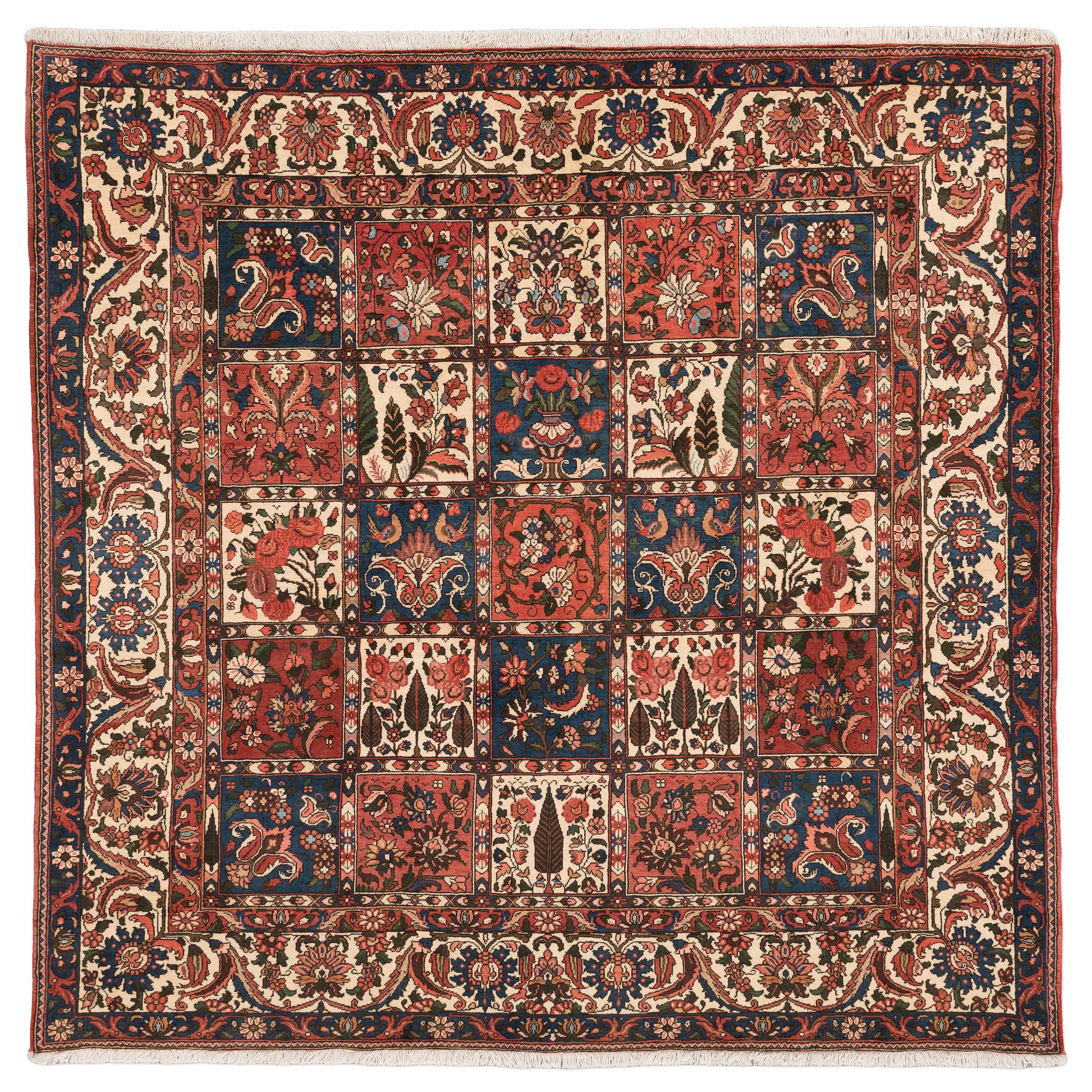 Hier präsentieren wir einen handgeknüpften Bachtiar-Teppich aus Persien, der in feiner 1a Saman-Qualität erstrahlt. Die Hauptfarbe dieses prächtigen Stücks ist ein intensives Rot, das mit sattem Blau und warmem Creme harmoniert. Diese Farbkombination wird durch Akzente von Grün und Braun ergänzt, die dem Teppich eine lebendige und gleichzeitig harmonische Ausstrahlung verleihen. Die Musterung zeichnet sich durch ein faszinierendes Gartenmotiv aus, das aus rechteckigen und quadratischen ...mehr Beschreibung
