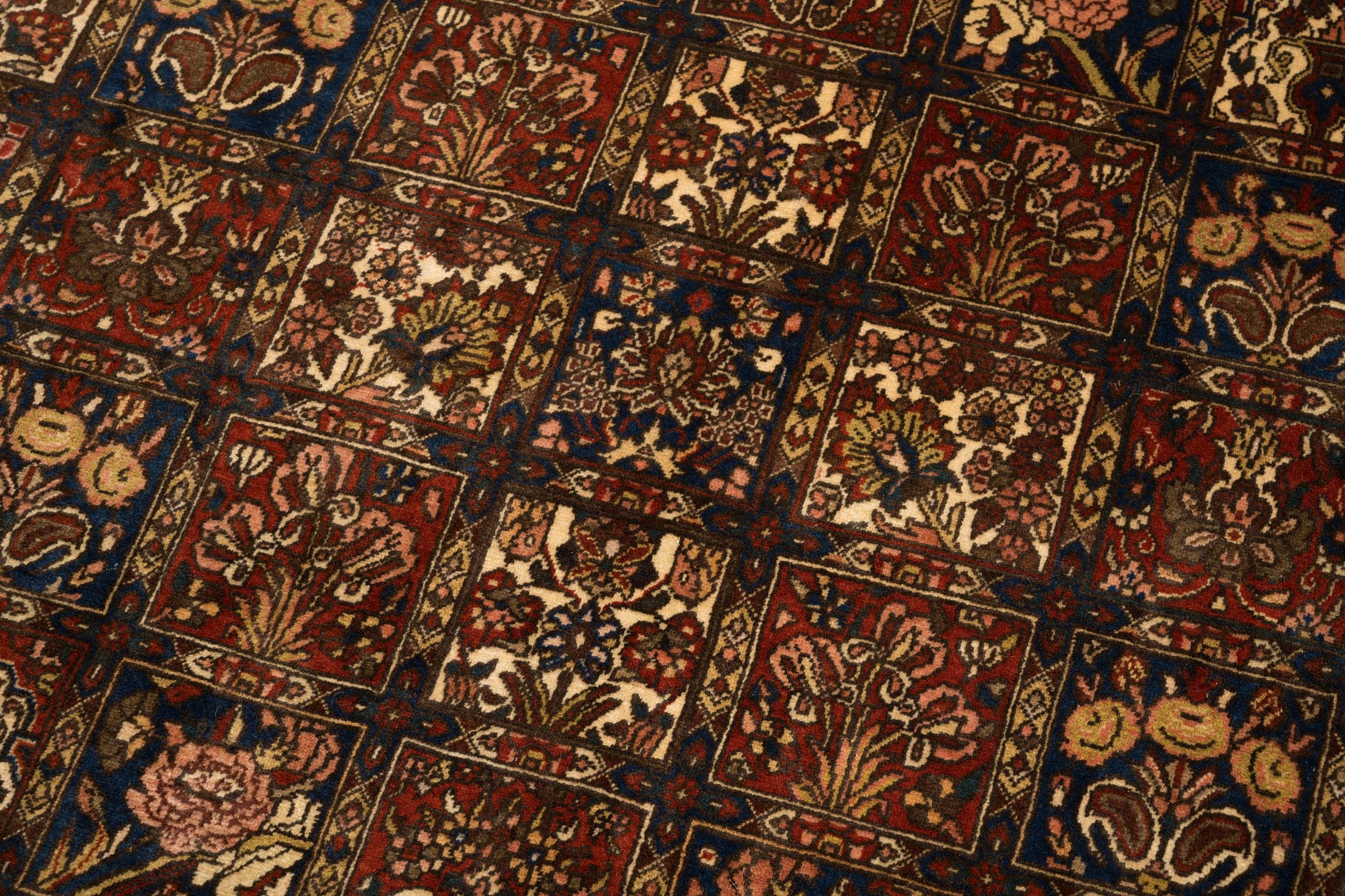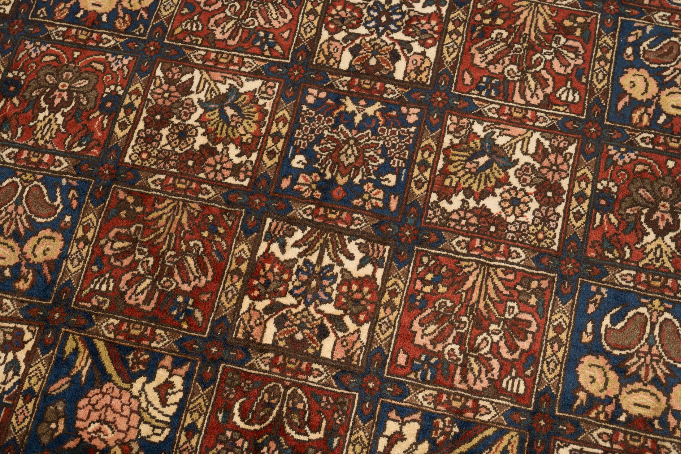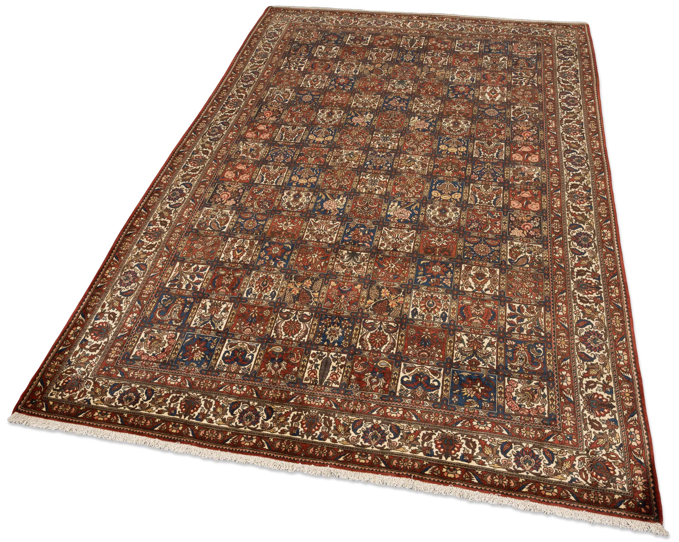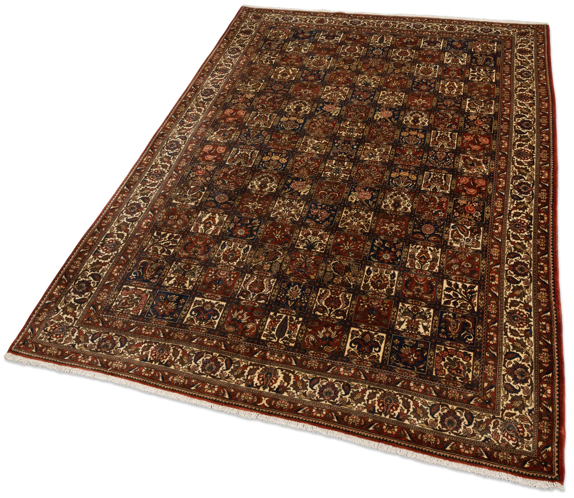 Dieser exquisite Bachtiar-Teppich präsentiert sich in einem satten Rotbraun als Hauptfarbe, das durch ein harmonisches Zusammenspiel mit tiefem Blau, warmem Beige und dezentem Creme ergänzt wird. Das Gartenmuster, charakteristisch für die Saman-Qualität, entfaltet sich in einem eleganten Schachbrettdesign, das durch florale Elemente und kunstvolle Medaillons bereichert wird. Mit einer beeindruckenden Dichte von ca. 280.000 Knoten pro Quadratmeter gehört dieser Teppich zur Spitzenqualität der Bachtiar-Knüpfkunst.