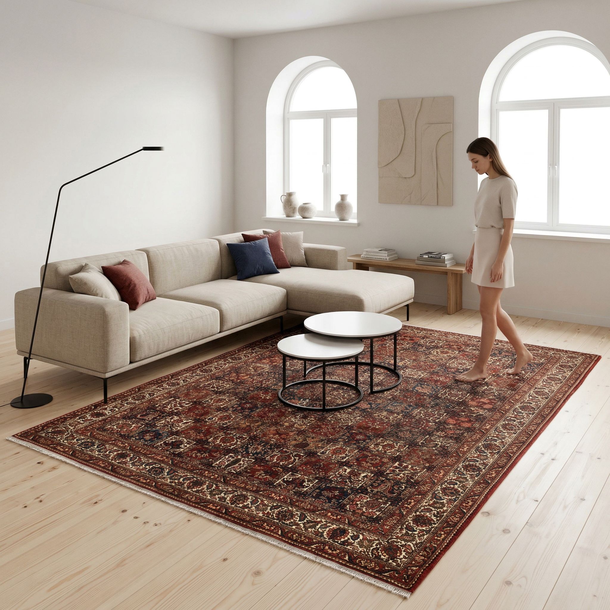 In einem modernen, zeitgenössischen Umfeld dient dieser feine Saman-Teppich als bodenständiger Anker und exklusives Kunstwerk, das den Raum vor Sterilität bewahrt. Die klaren Linien der modernen Möbel lassen dem detailreichen Gartenmuster genügend Raum zum Wirken, sodass der Teppich zur dominanten Bühne des Zimmers wird. Durch den Einsatz von Weiß als Aufheller im Muster wirkt das Stück trotz seiner traditionellen Herkunft frisch und sympathisch, was hervorragend zu hellen Wänden und Designklassikern passt. Es ist die Entscheidung für nachhaltige Qualität und zeitlose Ästhetik, die in einem modernen Kontext von wahrem Kennergeist zeugt.