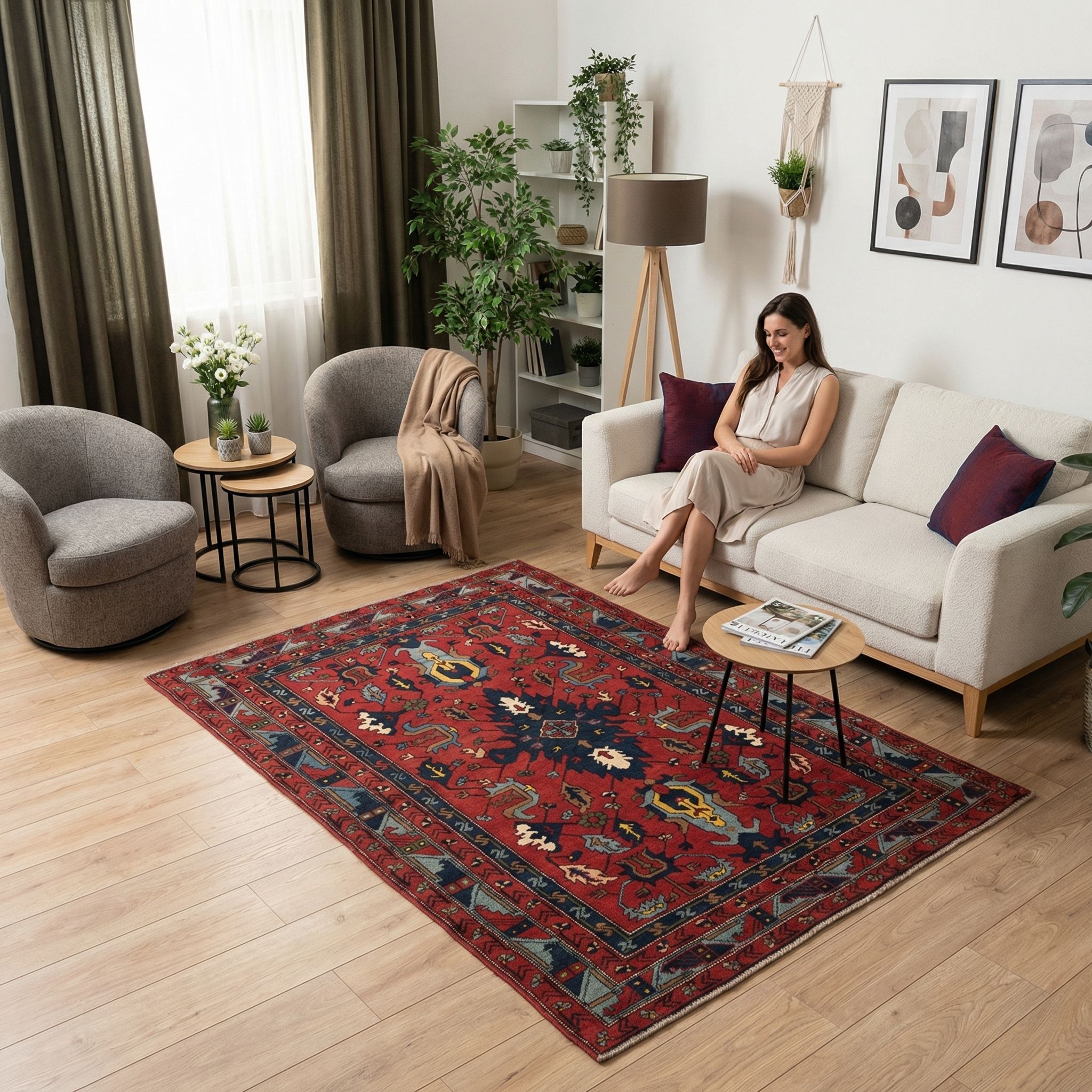 Im Boho-Style ist dieser Teppich ein ideales Herzstück, da er mit seinen kräftigen Rot- und Blautönen sowie den lebendigen Mustern die gewünschte unkonventionelle und gemütliche Atmosphäre schafft. Die Kombination aus dem Vintage-Charakter von 1940 und der feinen Knüpfung passt hervorragend zum eklektischen Mix aus Rattanmöbeln, vielen Pflanzen und bunten Textilien. Er bringt die nötige Wärme und Bodenständigkeit ("Grounding"), um das oft wilde Sammelsurium aus Kissen und Deko-Elementen optisch zusammenzuhalten. Da im Boho-Chic Individualität Trumpf ist, fügt sich der einzigartige Charakter dieses handgeknüpften Unikats nahtlos in das kreative Gesamtbild ein.