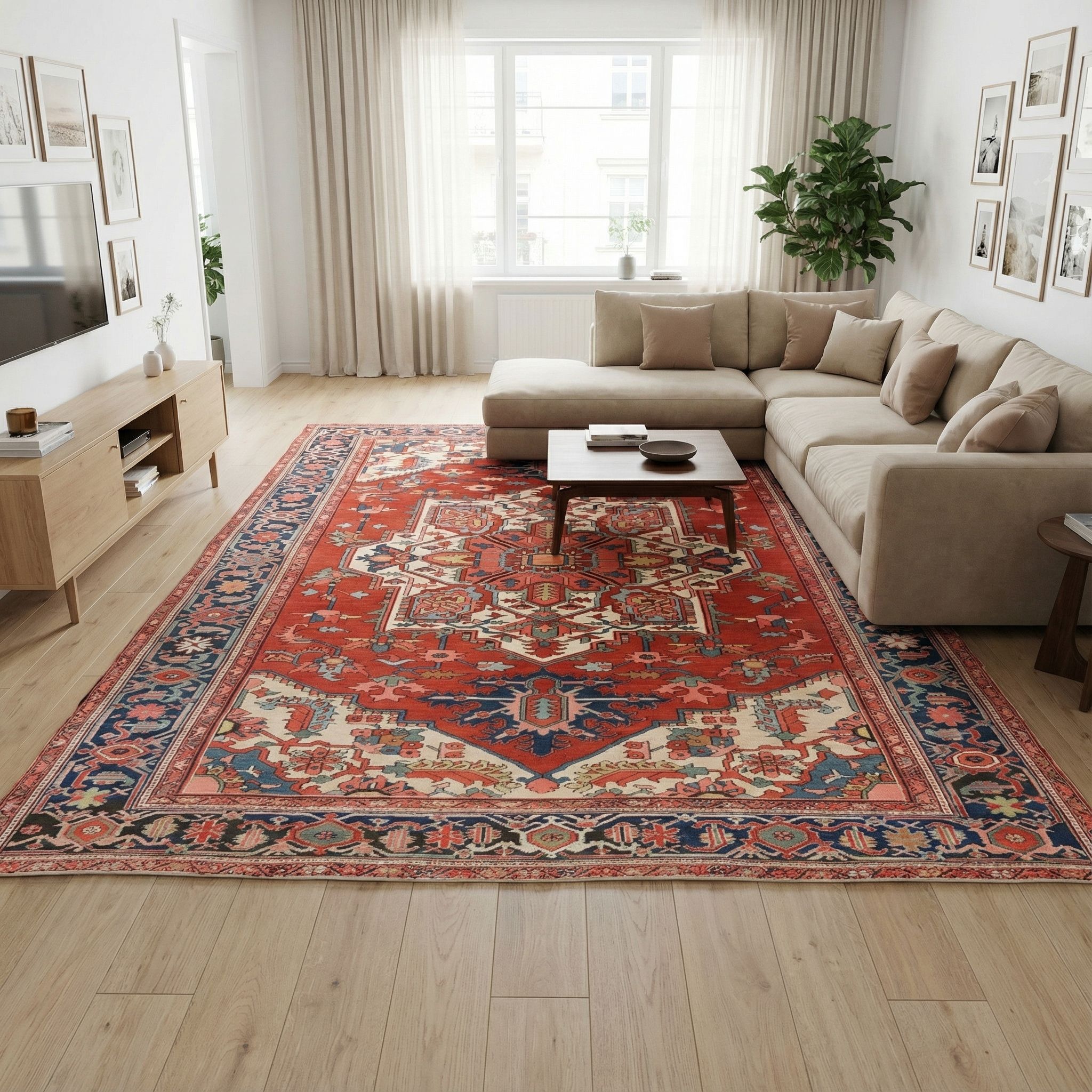 Dieser beeindruckende antike Heriz-Teppich aus Nordwestpersien, circa 1870, präsentiert sich in einem strahlenden Rot als Hauptfarbe, das durch die Verwendung hochwertiger Pflanzenfarben lebendig wirkt. Dazu gesellen sich ein tiefes Blau und ein sanftes Creme, die harmonisch miteinander interagieren. Die Musterung des Teppichs ist typisch geometrisch, mit einem zentralen Medaillon, das von floralen und abstrakten Motiven umgeben ist, die dem Teppich eine dynamische und dennoch ausgewogene ...mehr Beschreibung