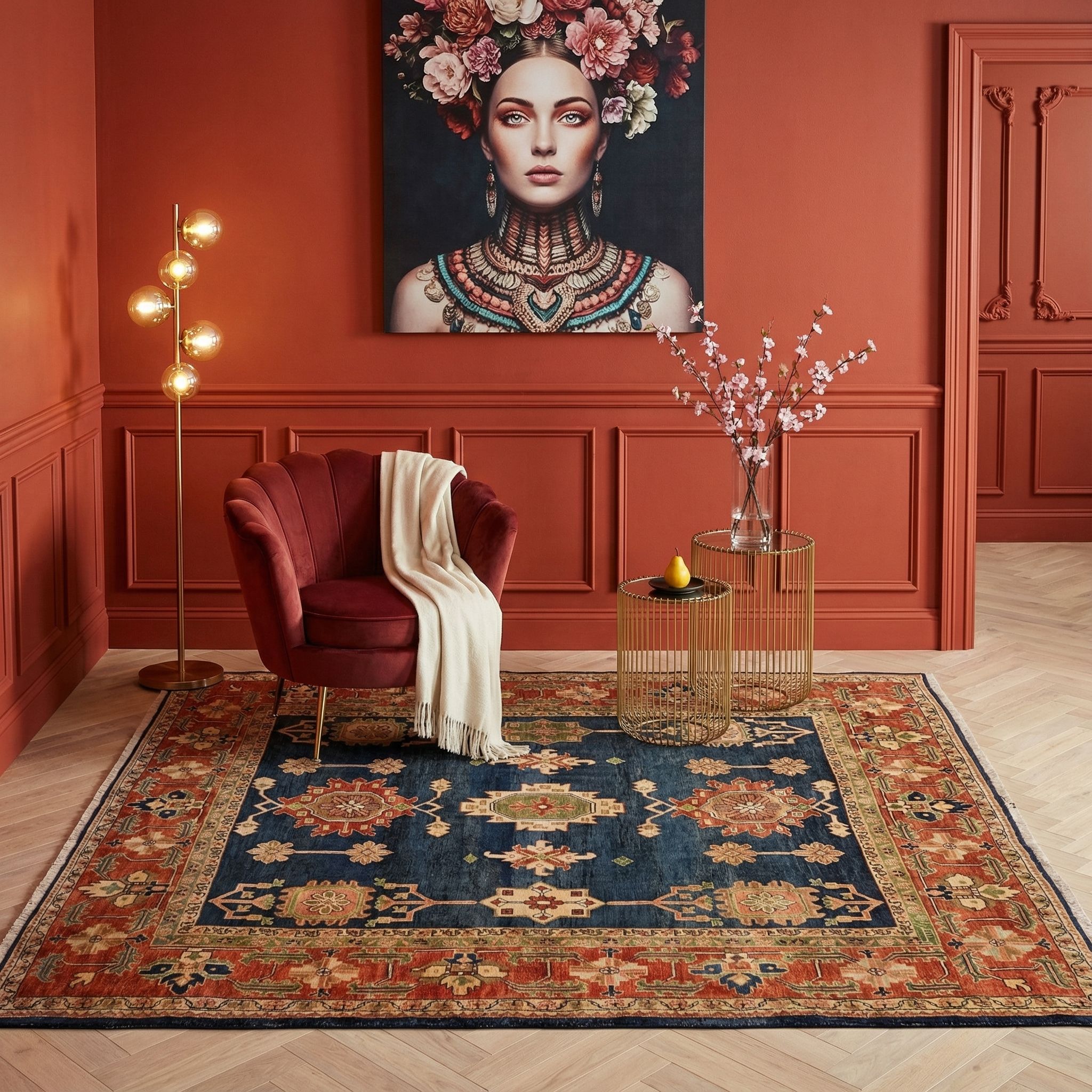 Dieser Teppich ist wie geschaffen für den Ethno-Style, da er mit seinen traditionellen Heriz- und Bachshayesch-Mustern und der Herkunft aus einem nordpersischen Dorf pure kulturelle Authentizität ausstrahlt. Die Verwendung von handversponnener Schafwolle und Naturfarben unterstreicht die Verbundenheit zur Natur und zum traditionellen Handwerk, was den Kern dieses Einrichtungsstils bildet. Die warmen Terrakotta- und tiefen Blautöne harmonieren perfekt mit Möbeln aus dunklem Holz, Rattan oder Leder und bringen die Weltläufigkeit des Ethno-Looks auf den Punkt. Als echtes Unikat erzählt der Teppich eine Geschichte von ferner Handwerkskunst und verleiht dem Raum eine beseelte, globetrotter-artige Atmosphäre.
