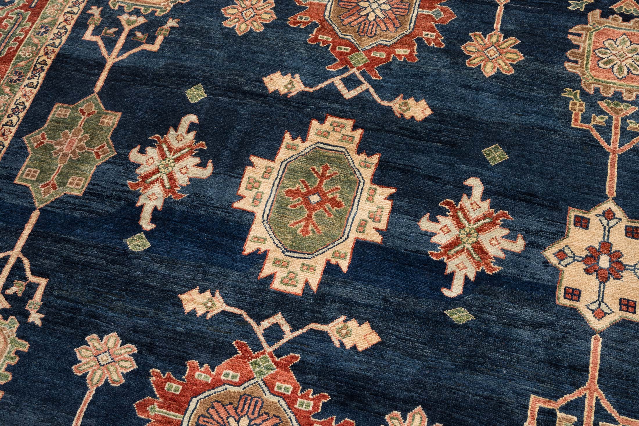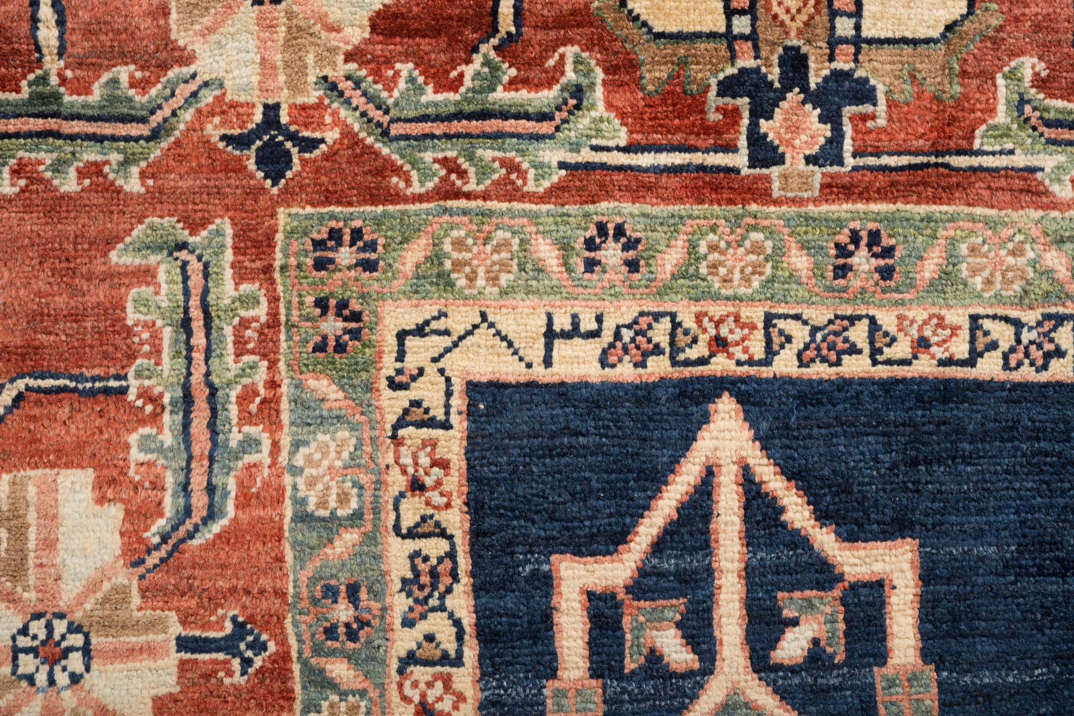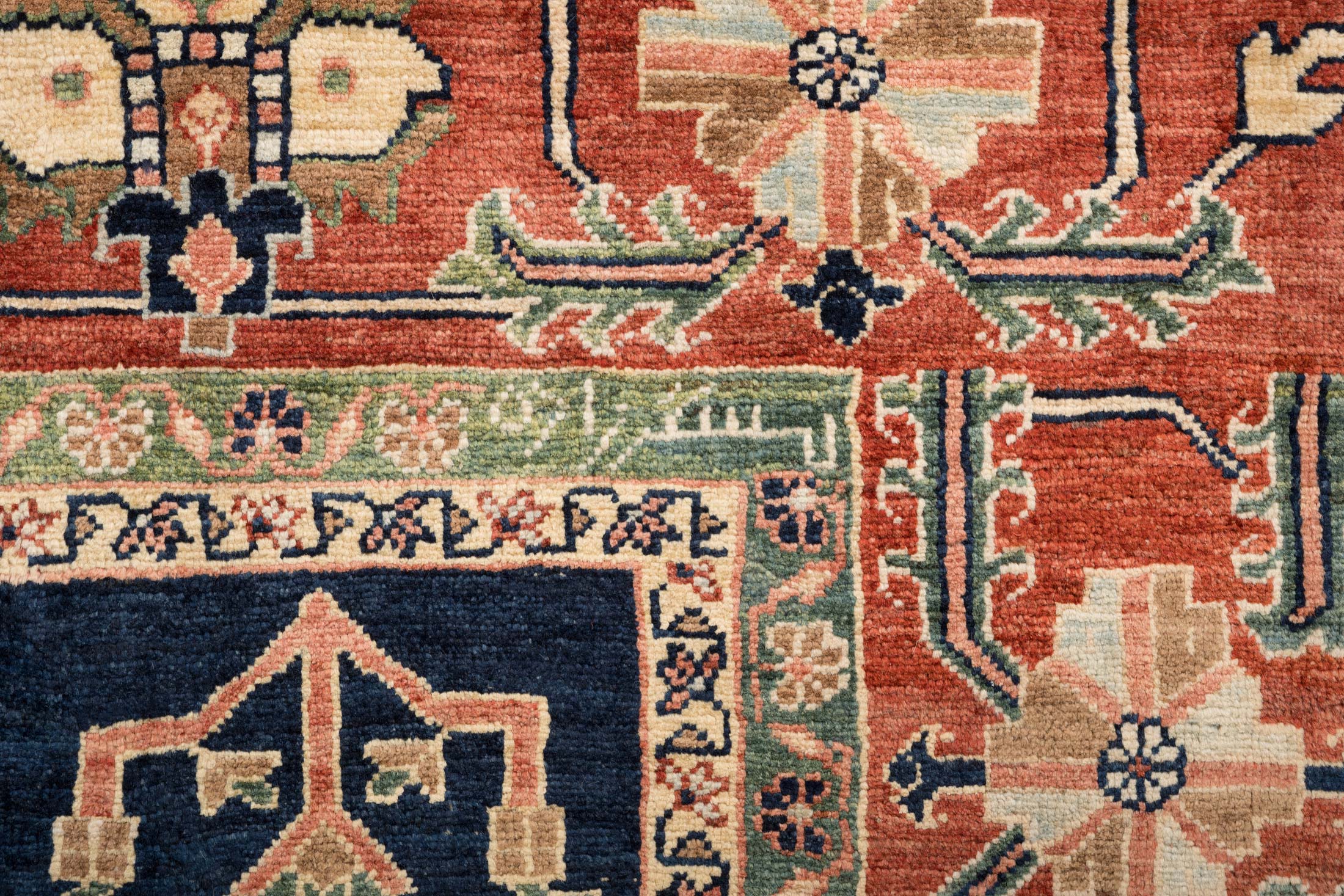 Dieser handgeknüpfte Ghadimi-Teppich aus Persien präsentiert sich in einem tiefen, satten Blau als Hauptfarbe, das die Basis für die gesamte Gestaltung bildet. Ergänzt wird dieses durch ein warmes Rostrot, das den Teppichrand und einige Musterungen hervorhebt, sowie einem sanften Olivgrün, das in den floralen und geometrischen Designs Akzente setzt. Die kunstvolle Musterung vereint traditionelle Heriz-, Serapi- und Bachshayesch-Motive, die behutsam modernisiert wurden. Der Teppich sticht ...mehr Beschreibung