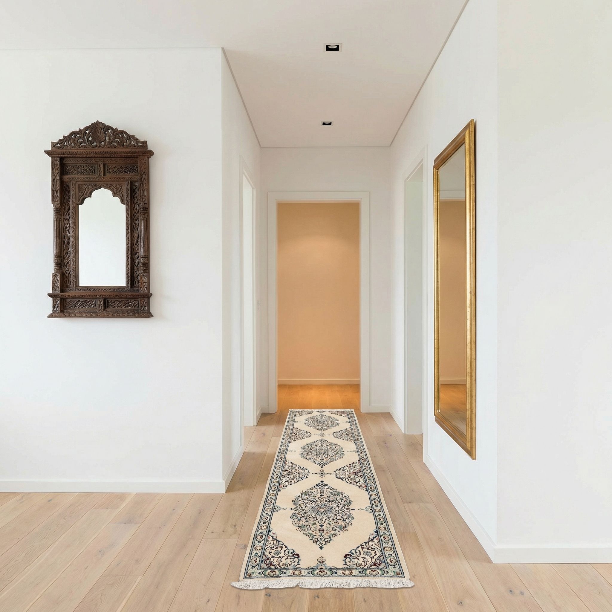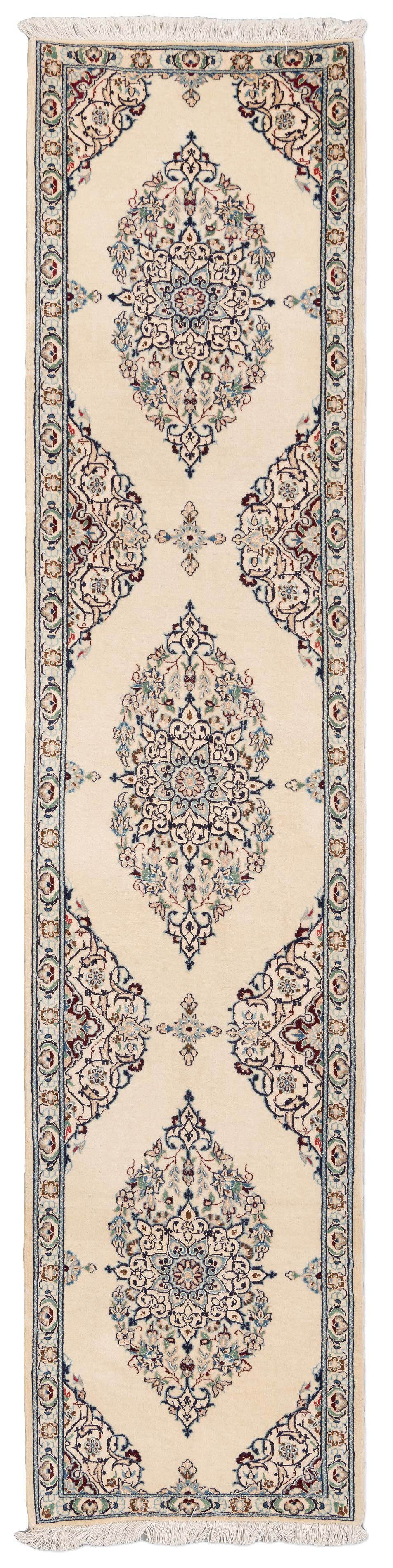 Dieser exquisite Nain-Teppich besticht durch seine warme, elfenbeinfarbene Grundfarbe, die für eine sanfte und einladende Atmosphäre sorgt. Ergänzt wird diese durch das tiefe Blau und zarte Beige, die harmonisch in das Gesamtbild eingefügt sind. Das kunstvolle Medaillon-Design und die filigranen Allover-Muster zeigen die hohe Handwerkskunst, die in jedem Knoten steckt. Mit einer Dichte von ca. 850.000 Knoten pro Quadratmeter, in manchen Bereichen sogar bis zu einer Million, zeugt dieser ...mehr Beschreibung