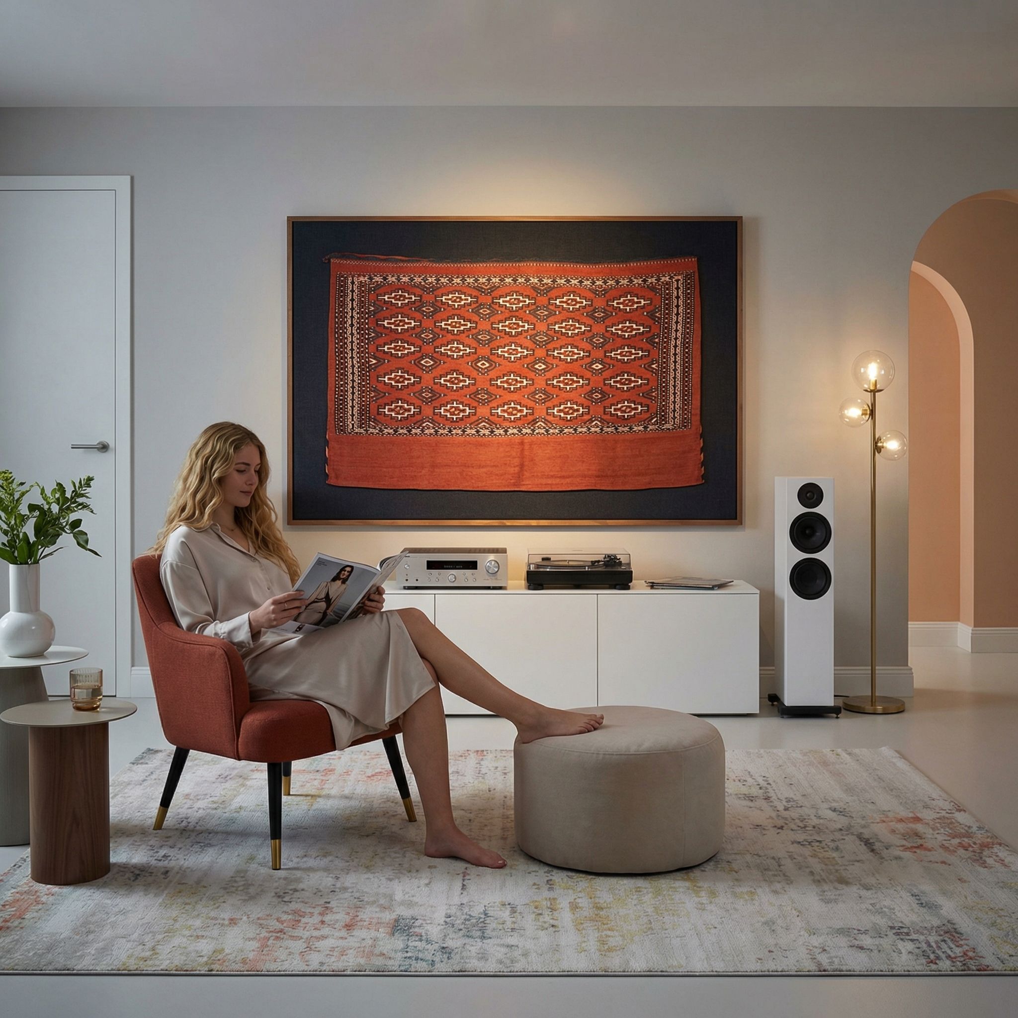 Als gekonnter Stilbruch verleiht dieses historische Textil dem kühlen, rohen Industrial-Style die dringend benötigte Wärme und Wohnlichkeit. Das kräftige Rot und die feine Webkunst bilden einen spannenden Kontrast zu unverputzten Wänden, Betonböden oder kühlem Metall und brechen die Strenge des Lofts gekonnt auf. Die geometrische Formensprache der turkmenischen Motive korrespondiert hervorragend mit der geradlinigen Architektur, während die Geschichte des Stücks dem Raum tiefe Authentizität verleiht. So wird die Tschowal-Tasche zum exklusiven Blickfang, der Modernität mit traditioneller Handwerkskunst auf höchstem Niveau verbindet.
