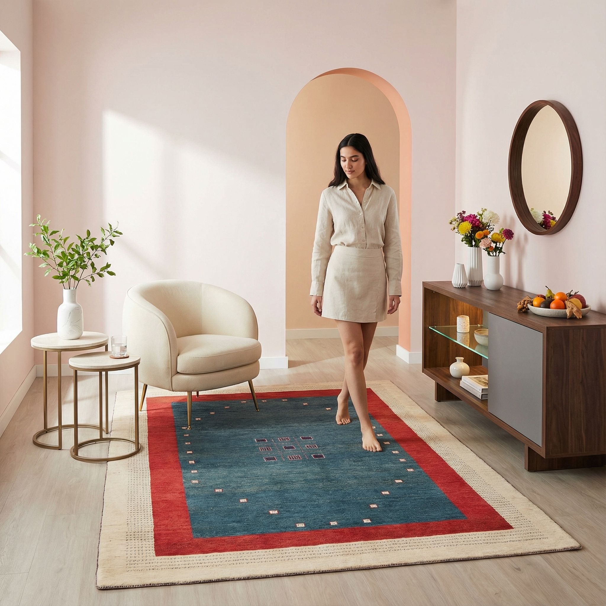 Im kühlen, nordischen Design fungiert dieser hochwertige Wollteppich als gezielter Farbtupfer, der die visuelle Strenge von hellen Hölzern und Weißtönen stilvoll aufbricht. Die minimalistische Anordnung der Motive unterstützt die skandinavische Formensprache, ohne unruhig zu wirken, während die helle Außenbordüre eine Brücke zur lichten Umgebung schlägt. Dank der reinen, handversponnenen Schafwolle bringt er genau das Maß an "Hygge" und natürlicher Haptik mit, das skandinavische Räume wohnlich macht. Es ist ein Beweis dafür, dass Farbe und nordische Zurückhaltung wunderbar harmonieren können.