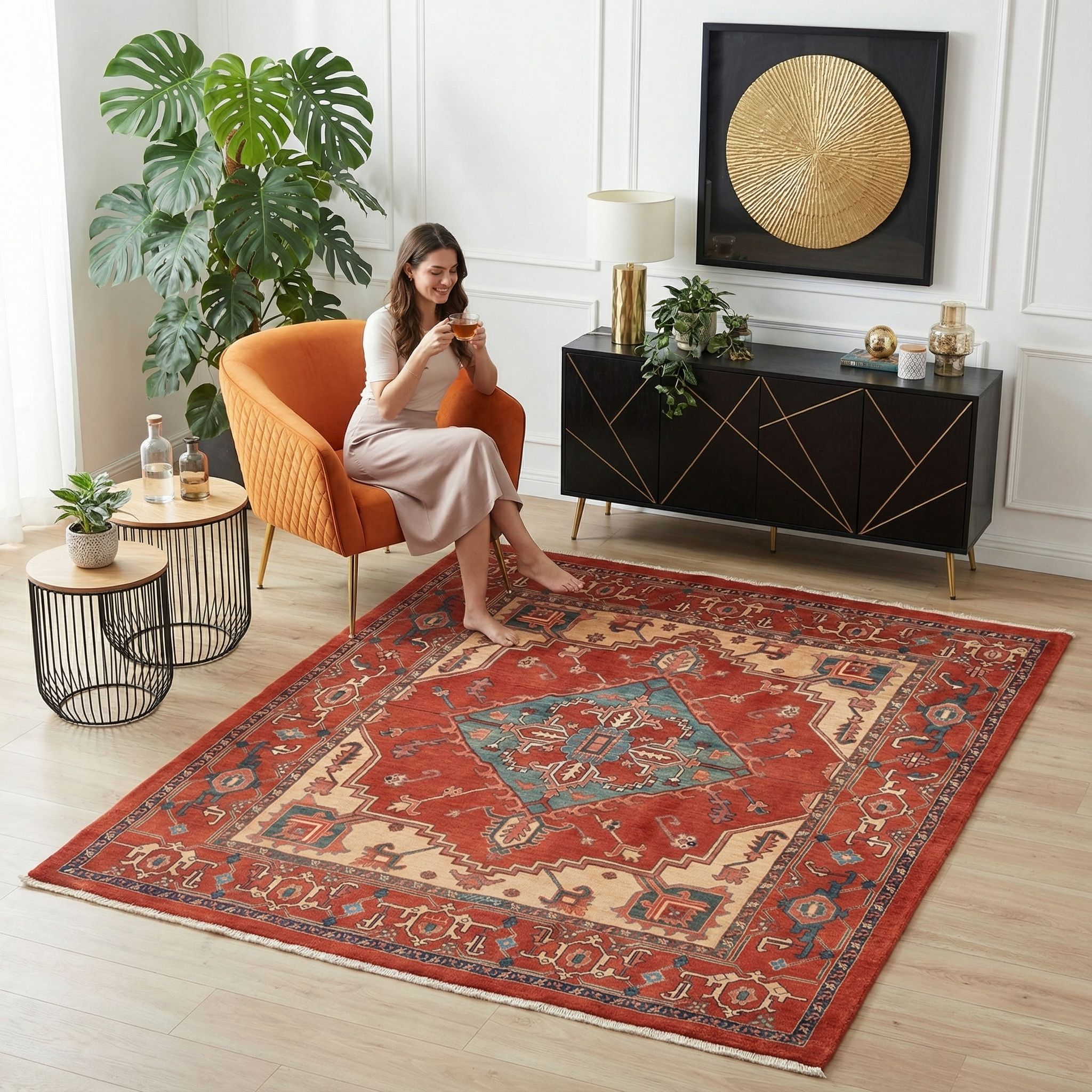 Hier präsentieren wir einen exquisiten handgeknüpften Ghadimi-Teppich aus dem Hause Mesgarzadeh. Die Hauptfarbe dieses Meisterwerks ist ein warmes Ziegelrot, das durch Akzente in harmonischem Blaugrün und elegantem Creme ergänzt wird. Diese Farbpalette verleiht dem Teppich eine lebendige, aber zugleich klassische Ausstrahlung. Die Musterung ist von traditionellen Heriz-, Serapi- und Bachshayesch-Motiven inspiriert, modern interpretiert und zeigt geometrische Formen sowie florale Details, ...mehr Beschreibung