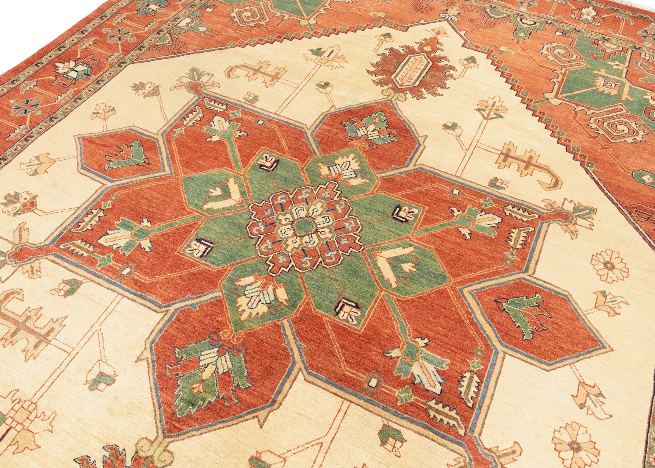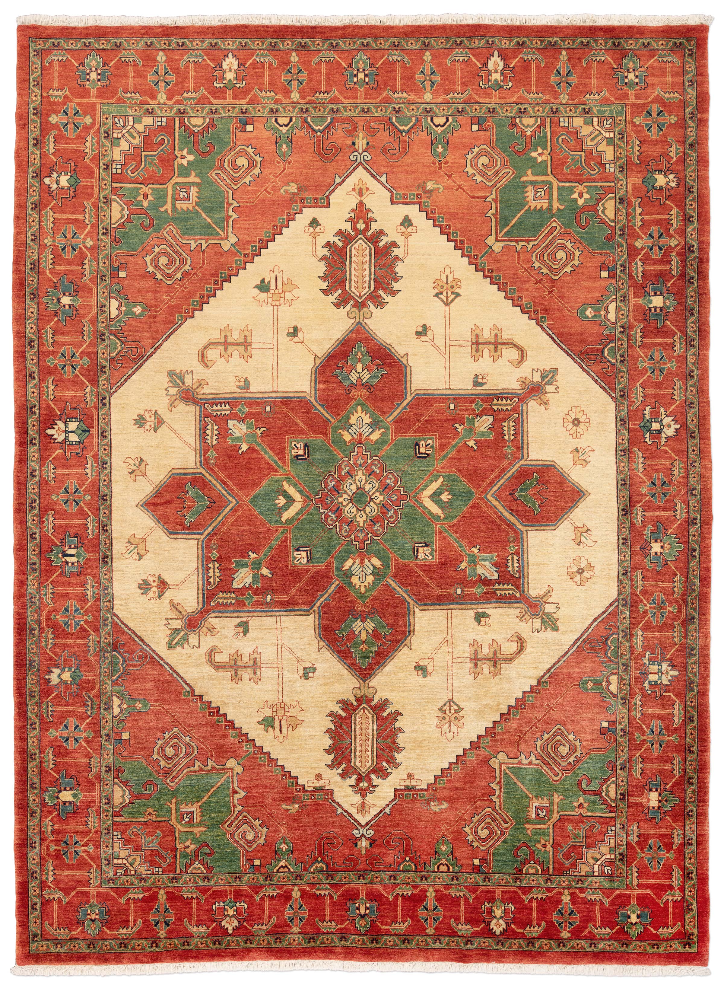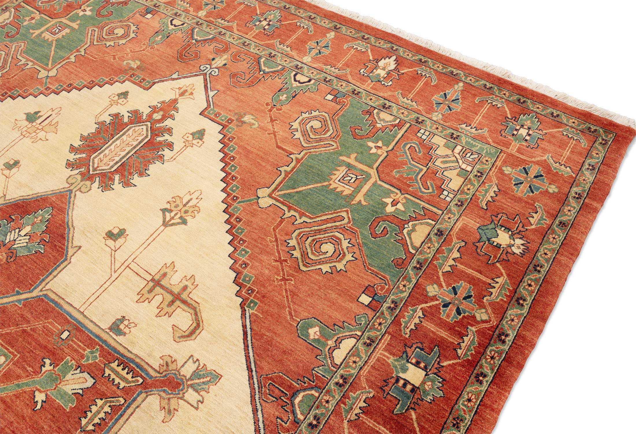 Dieser handgeknüpfte Ghadimi-Teppich aus dem Hause Mesgarzadeh besticht durch seine warme, erdige Farbpalette. Die Hauptfarbe ist ein tiefes Rot, das dem Teppich eine kraftvolle Präsenz verleiht. Ergänzt wird diese durch ein sattes Grün und ein sanftes Beige, die harmonisch miteinander interagieren und dem Teppich Tiefe und Charakter geben. Das Muster ist eine meisterhafte Kombination aus traditionellen Heriz-, Serapi- und Bachshayesch-Elementen, die in einem symmetrischen, aber dennoch ...mehr Beschreibung