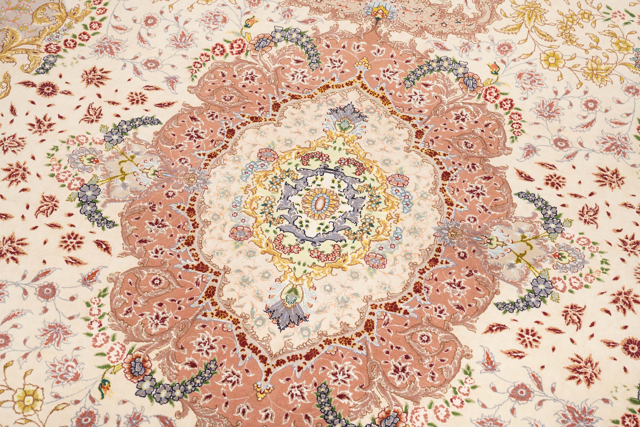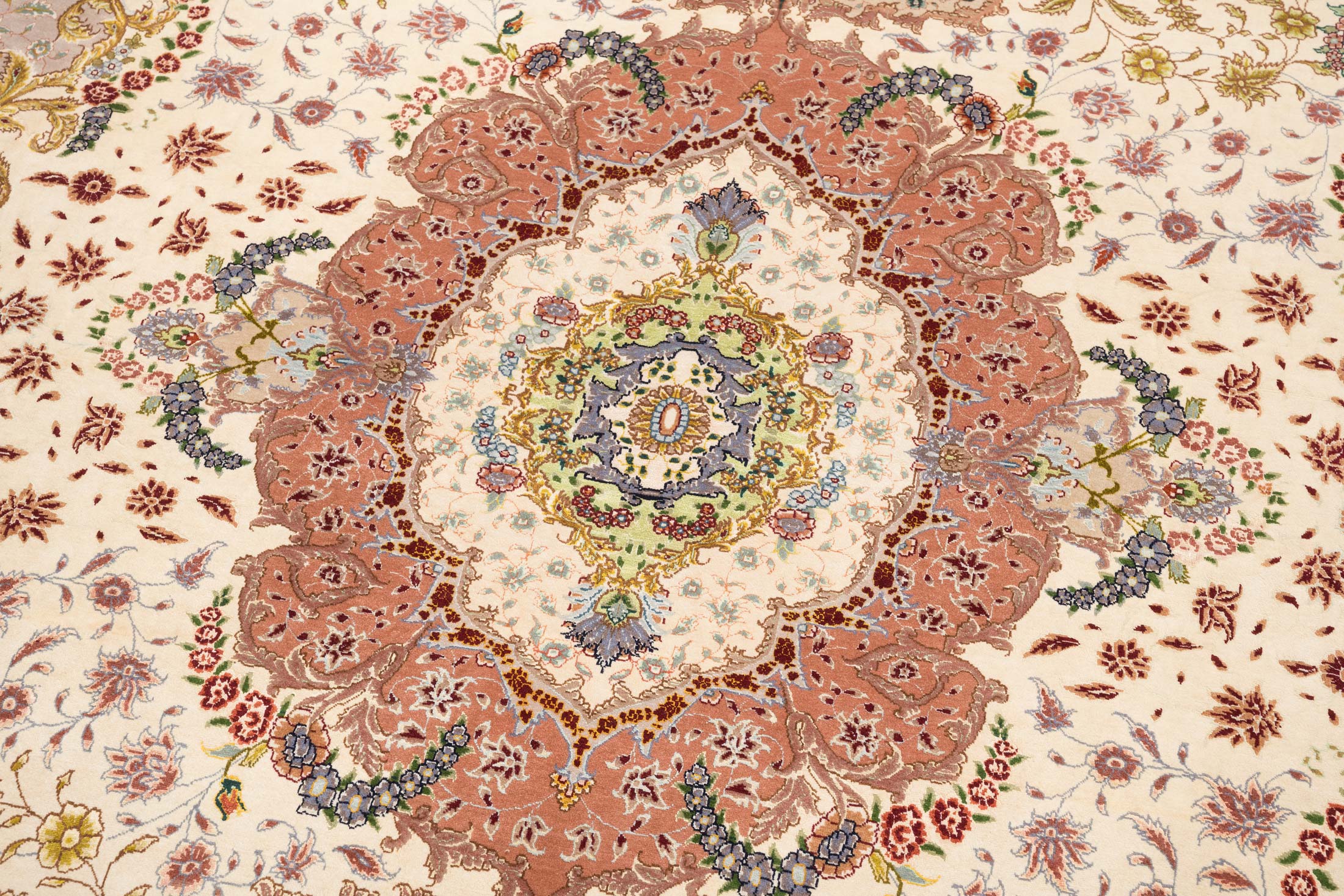 Hier werden Teppiche in verschiedensten Qualitäten bis zur feinsten Knüpfung hergestellt. Die Qualität dieser Teppiche ist ausgezeichnet. Für den Flor wird nur hochwertige Schafwolle, Korkwolle und-oder Naturseide verwendet. Für die Kettfäden wird feinste Baumwolle oder manchmal auch wertvolle Naturseide verwendet. Typisch für den Täbriz ist das gefüllte Muster von dichten floralen Motiven, großen Palmetten, Vasen oder lebendig wirkenden Jagdszenen. Oft wird dieser Teppich von rostfarbenen und pastellen wirkenden Tönen beherrscht. Es gibt jedoch viele einzigartige Designs, die von hervorragenden persischen Künstlern entworfen werden.