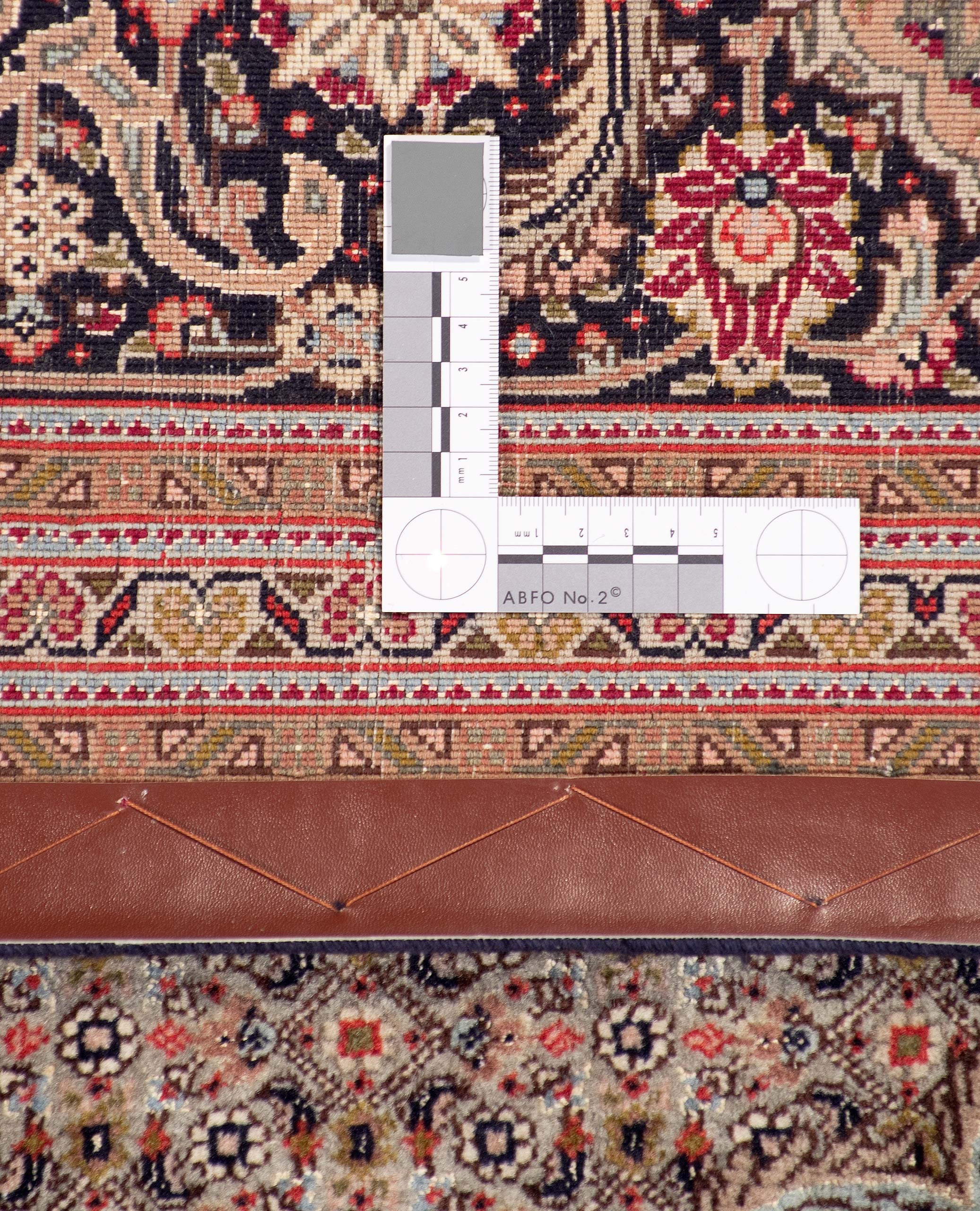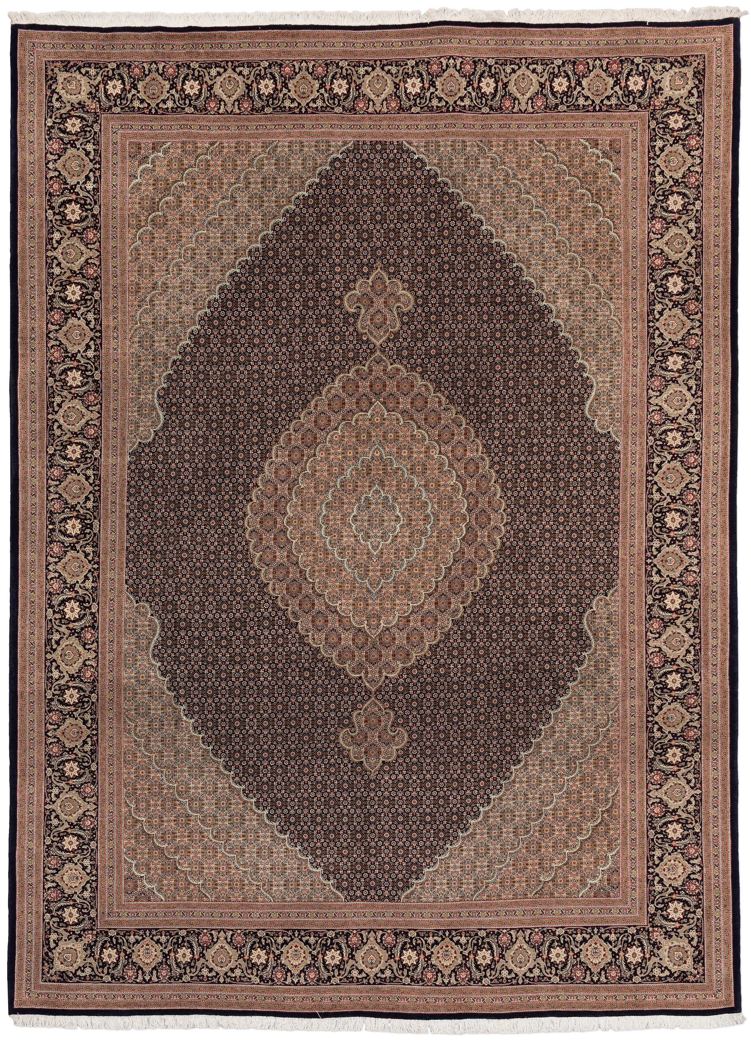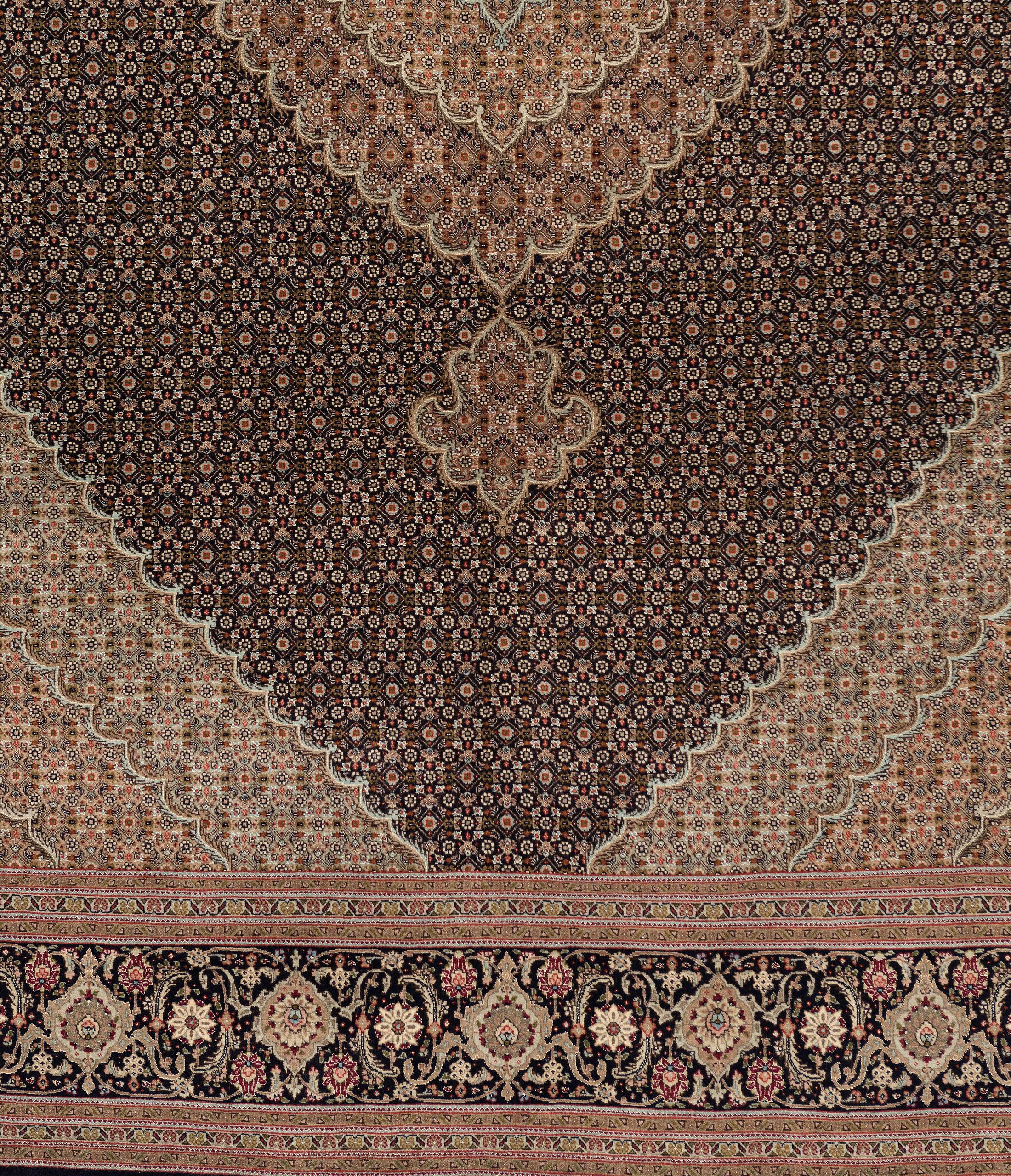 Dieser handgeknüpfte Täbriz-Teppich beeindruckt mit einer dominanten Farbe von tiefem Braun, die dem Stück eine warme und einladende Ausstrahlung verleiht. Ergänzt wird dieses harmonische Bild durch sanfte Beige- und zarte Rosttöne, die sich geschickt in das Design einfügen. Ein Hauch von sanftem Blau verleiht dem Teppich eine subtile Frische, während die floralen Muster und die zentralen Medaillons das Auge fesseln und den Teppich zu einem einzigartigen Kunstwerk machen.Mit einer ...