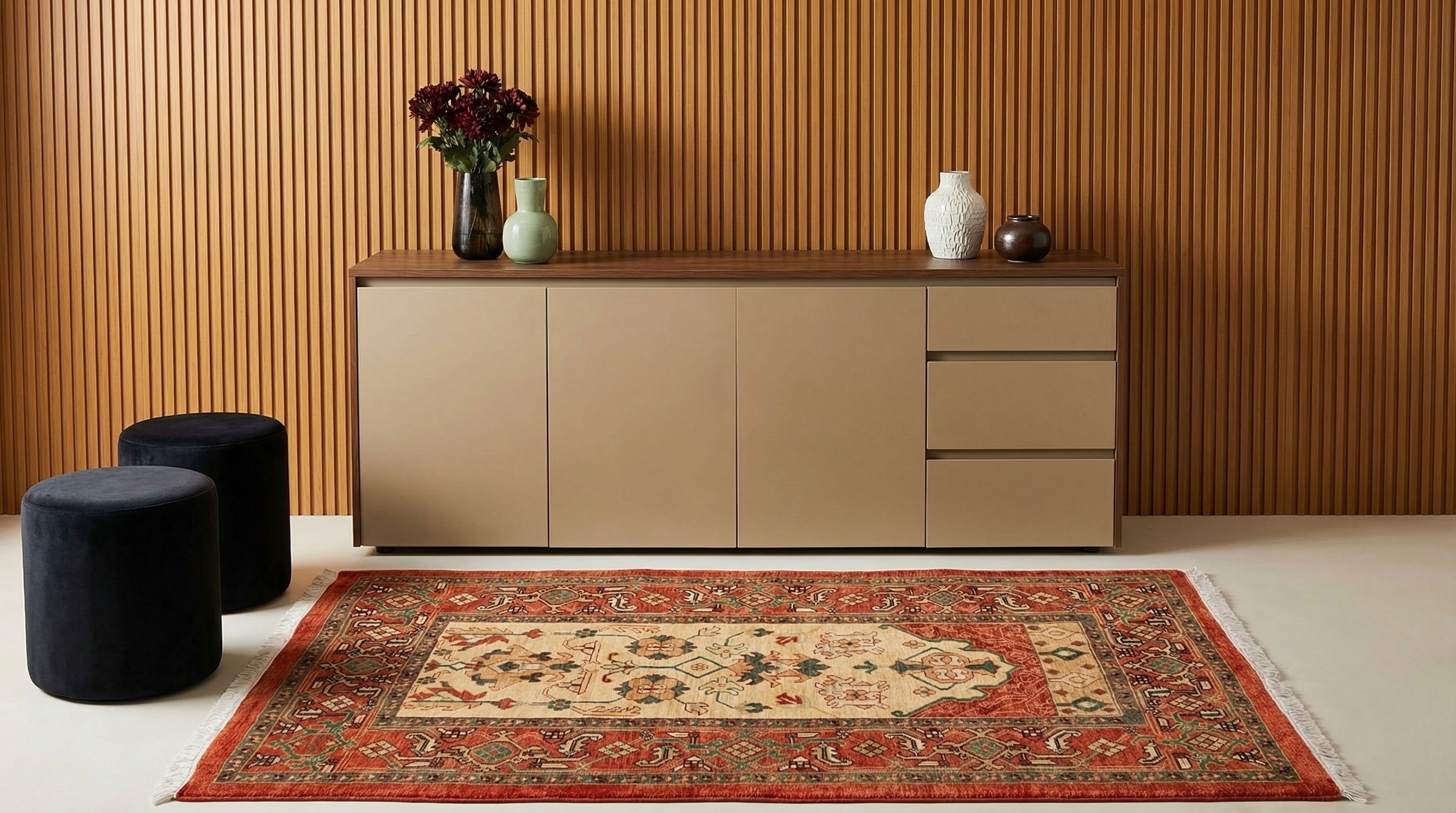 Hier präsentieren wir den handgeknüpften Ghadimi-Teppich, ein Meisterwerk aus dem Haus Mesgarzadeh. Die Hauptfarbe dieses einzigartigen Stücks ist ein warmes Rostrot, das den Teppich in ein harmonisches Licht taucht. Ergänzt wird es durch ein sanftes Creme und ein tiefes Petrol, die dem Design Tiefe und Eleganz verleihen. Die Musterung ist inspiriert von traditionellen Heriz-, Serapi- und Bachshayesch-Entwürfen, die modern interpretiert wurden.Dieser Teppich ist nicht nur ein ...