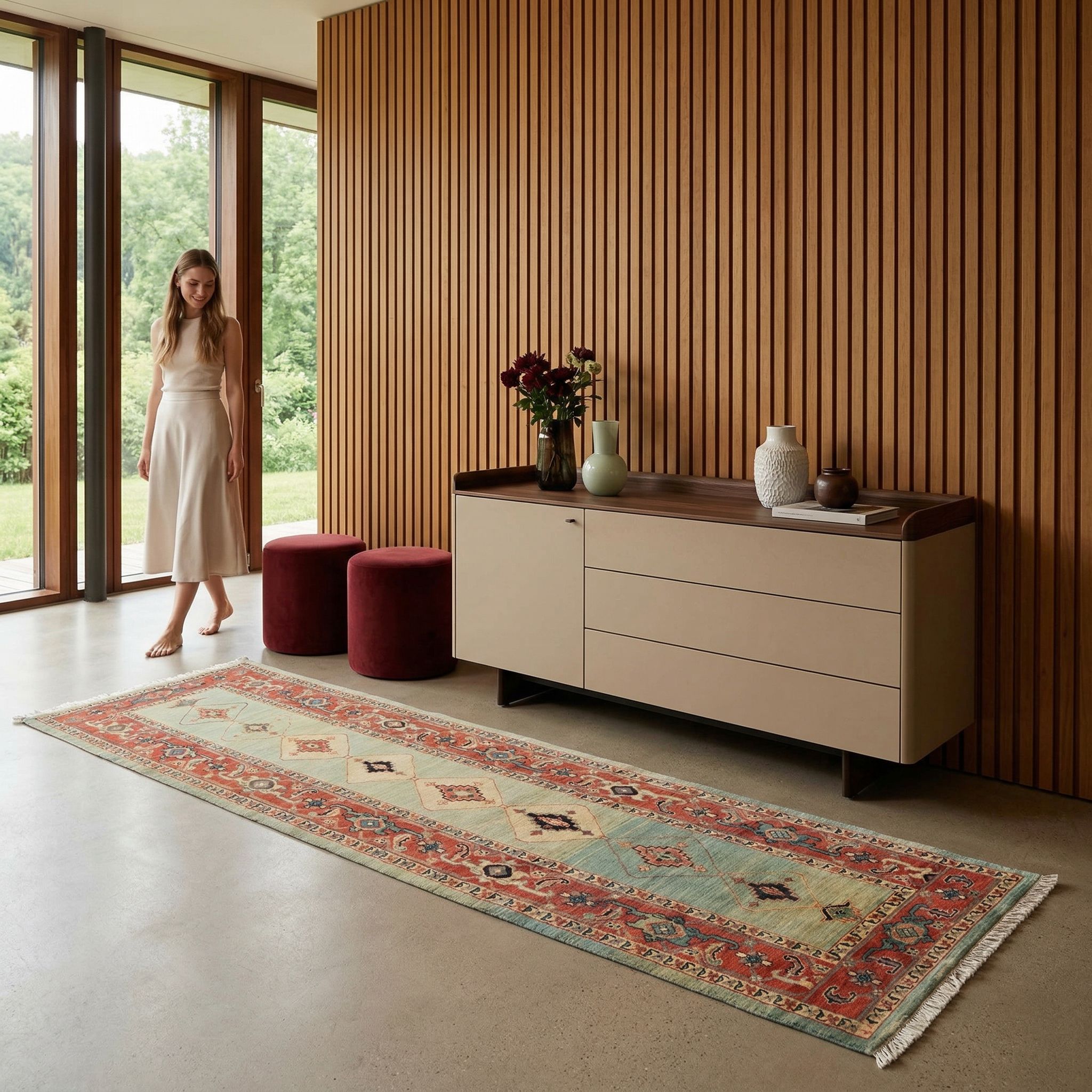 Der New-Country-Style lebt von der Balance zwischen rustikaler Gemütlichkeit und moderner Leichtigkeit, genau das, was dieser Ghadimi mit seiner freundlichen Farbpalette bietet. Die extrem hochwertige, dichte Schafwolle strahlt eine unvergleichliche Wärme und Behaglichkeit aus, die wunderbar zu Massivholzmöbeln und hellen Leinenstoffen passt. Seine zeitlose Eleganz, die auf reduzierten historischen Vorlagen basiert, verhindert, dass der Raum altbacken wirkt, und fügt stattdessen eine Note von nobler Herkunft hinzu. So wird dieser langlebige Läufer zum Herzstück eines gehobenen Landhauses, das Beständigkeit und natürliche Klasse ausstrahlt.